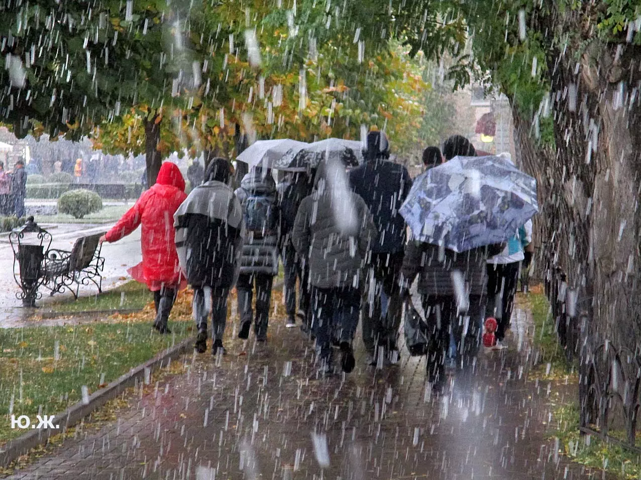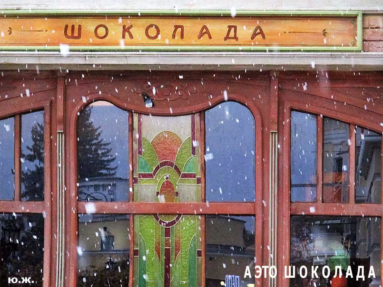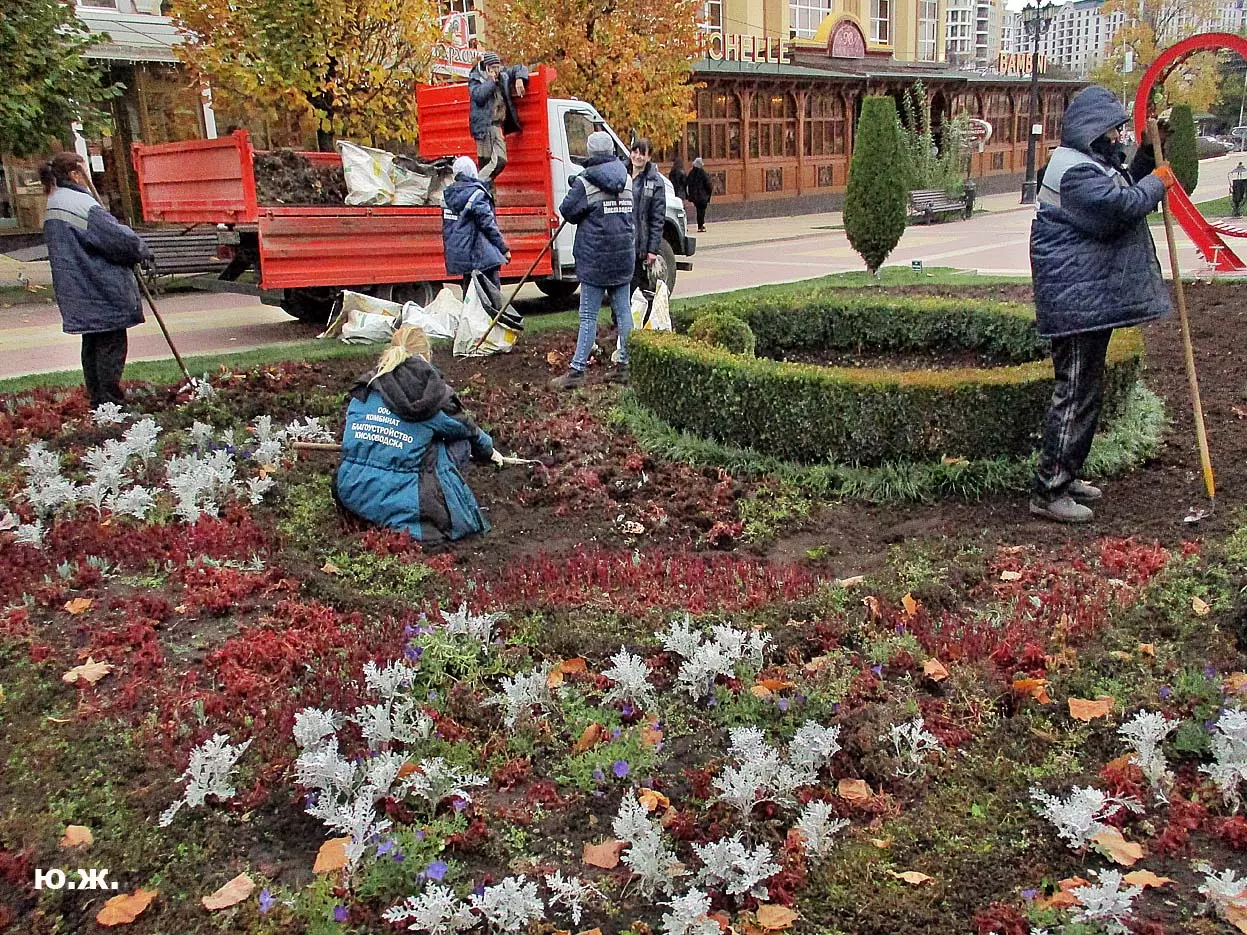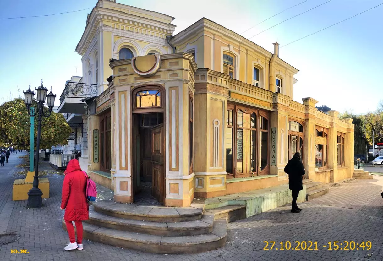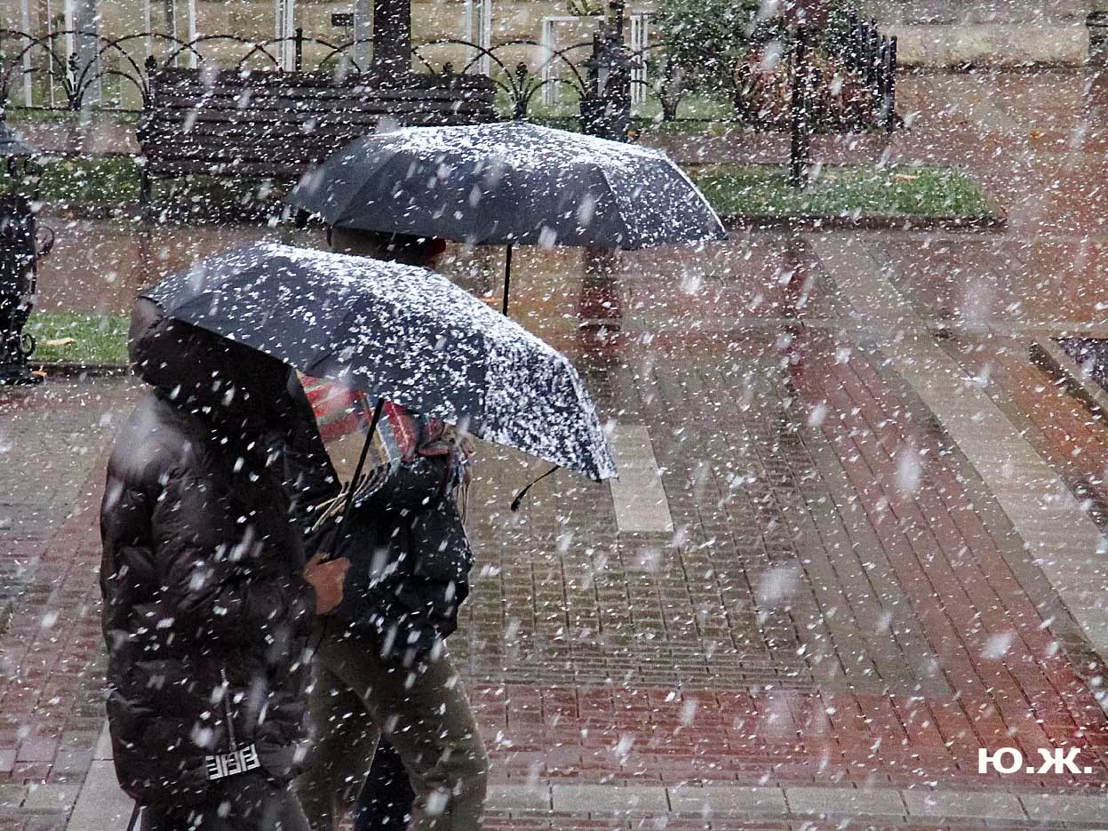 И ровно на следующий последний день окончания съемочной программы, 24 октября, в понедельник 25, пошел первый осенний снег. В наших южных краях это просто забава, не приносящая вреда, пушистый теплый снег, на фоне которого красиво смотрелись яркие зонтики, через пару часов который и закончился. Он начался во вторую половину дня, а в первую его половину работники городской службы треста зеленого хозяйства убирали клумбы и перекапывали землю. (см. фото). И даже за это короткое время многие и многие успели запечатлеть на свои смартфоны и фотокамеры громадное количество снимков и развезут их по всей стране. А как красиво смотрелось при медленно падающих крупных снежинках, возведенное к съемкам фильма здание-реквизит. Практически весь октябрь, пока шли съемки фильма, в других местах- «локациях», на их языке, довольно большая группа молодых людей работала над ним, в конце художники искусственно «старили» его, было еще много разных манипуляций, пока Крокодил Гена (Сергей Гармаш) последние два съемочных дня стал энергично посещать его. Он в том числе подъезжал сюда и на своем трехколесном моточуде , одетый в красный пиджак, шляпу и бабочку. Народ уже стал называть это здание «Домом Чебурашки» и рассказывают, что в этой шоколадной мама одного мальчика, который дружит с Геной, отлично готовит горячий шоколад…