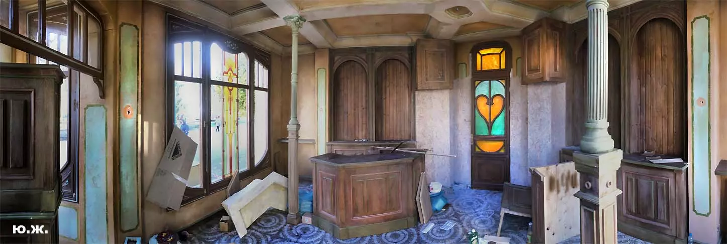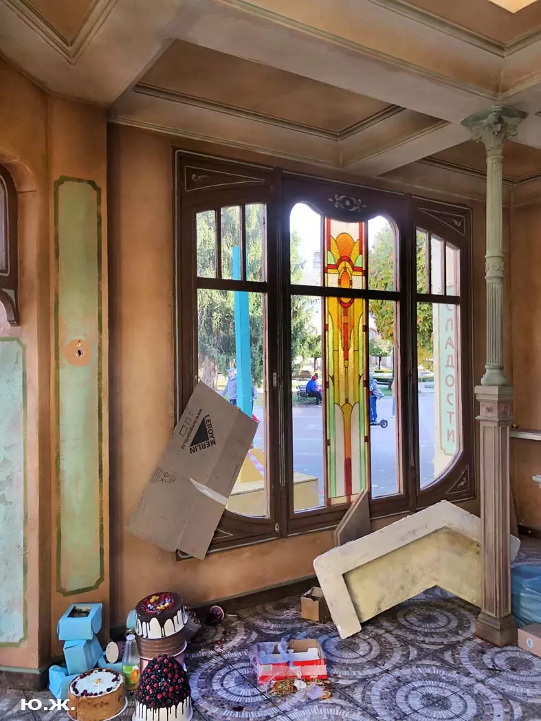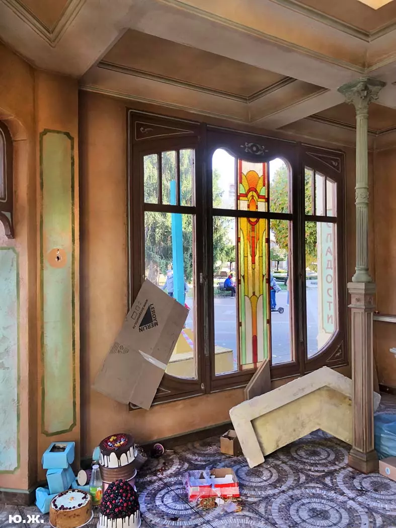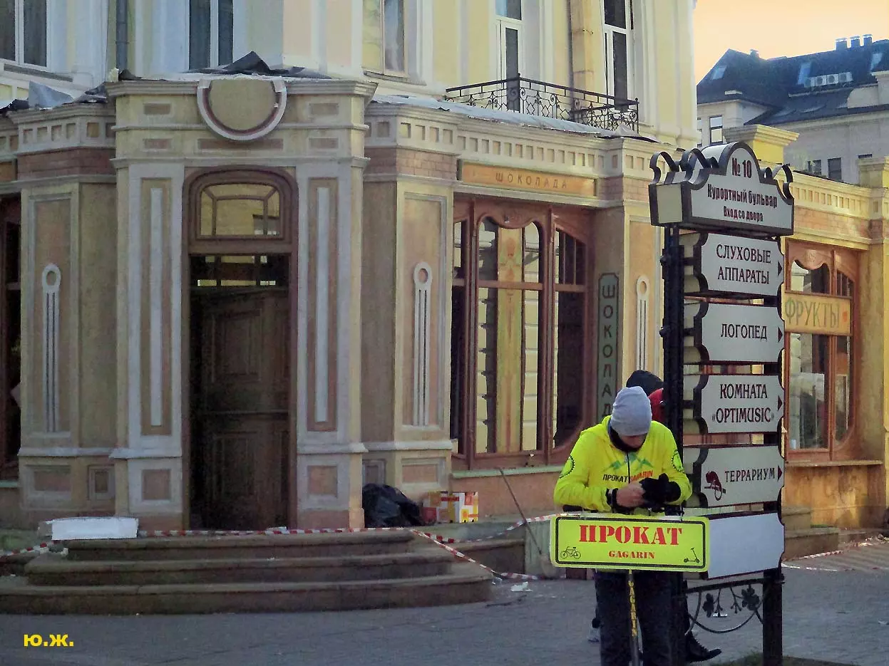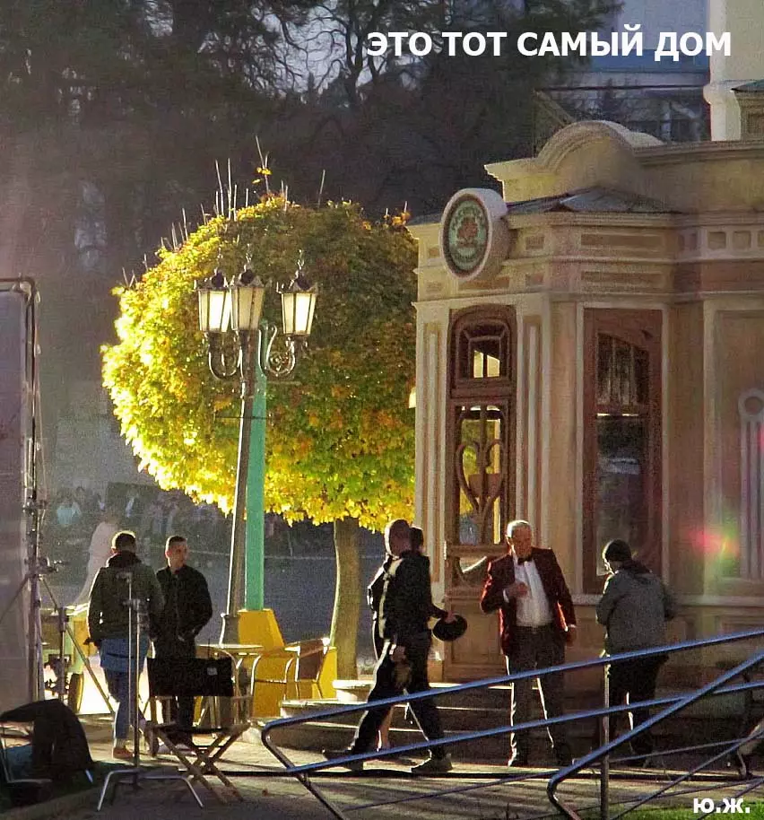 И все о чем я здесь пишу-предисловие к тому, что уже несколько дней я бываю в этом домике (его адрес на одном из фото) и уже сделал несколько фотосессий. Вот эти снимки я хочу вам и показать. Здесь и интерьер и его панорама и виды, которые отсюда открываются через красивые витражи на Курортный бульвар, на Нарзанную галерею. Рассказывать я больше ничего не буду, потому что сам абсолютно ничего о фильме не знаю, кроме того, что этот домик сделан из картона, пенопласта, чуть стекла и немного дерева и еще, что сейчас отсюда все тащат — в первый день, когда шел снег, были даже грузовики, (см фото) через пару дней исчезли красивые бутафорские, отлично сделанные огромные фруктовые торты (см фото). Вот и все, что я знаю о фильме «ЧЕБУРАШКА».