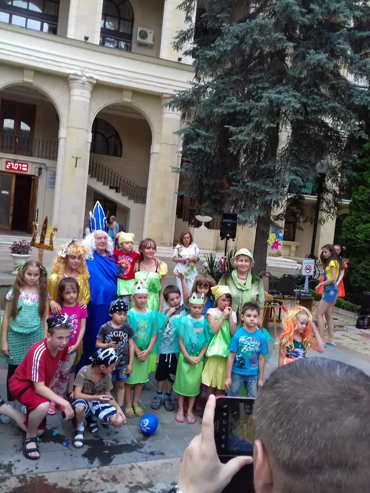 27 июля в 15-00, на территории здравницы, в сквере вокруг фонтана были установлены декорации, украшенные морскими персонажами и разноцветными флажками.