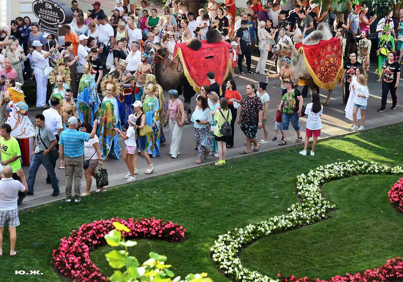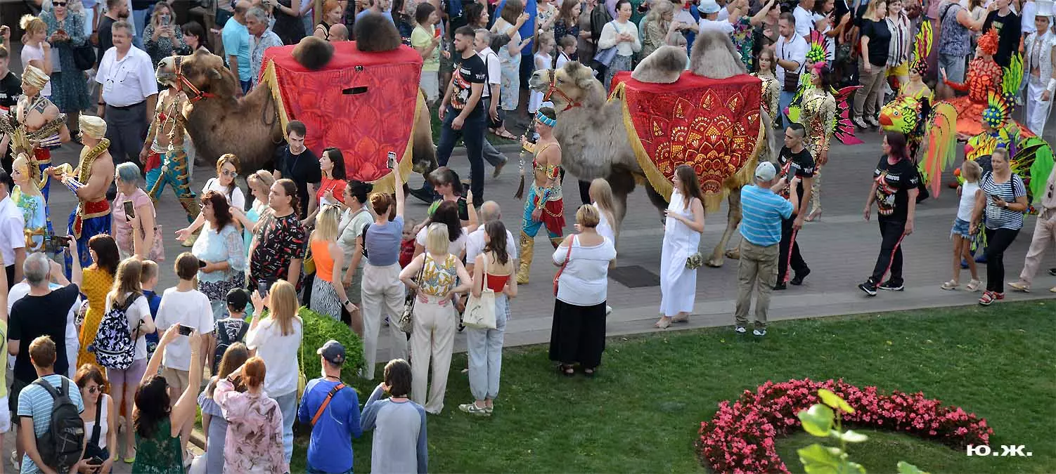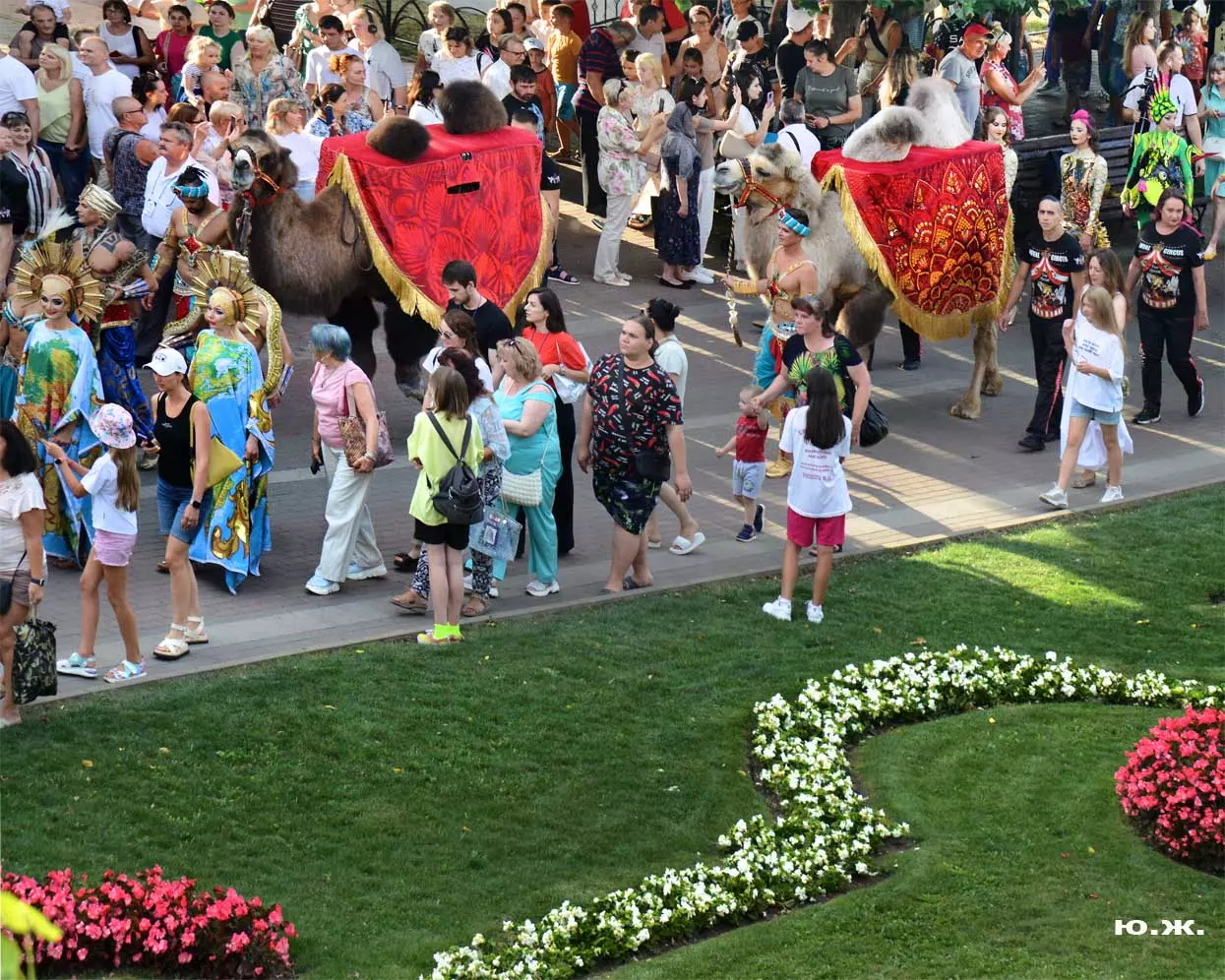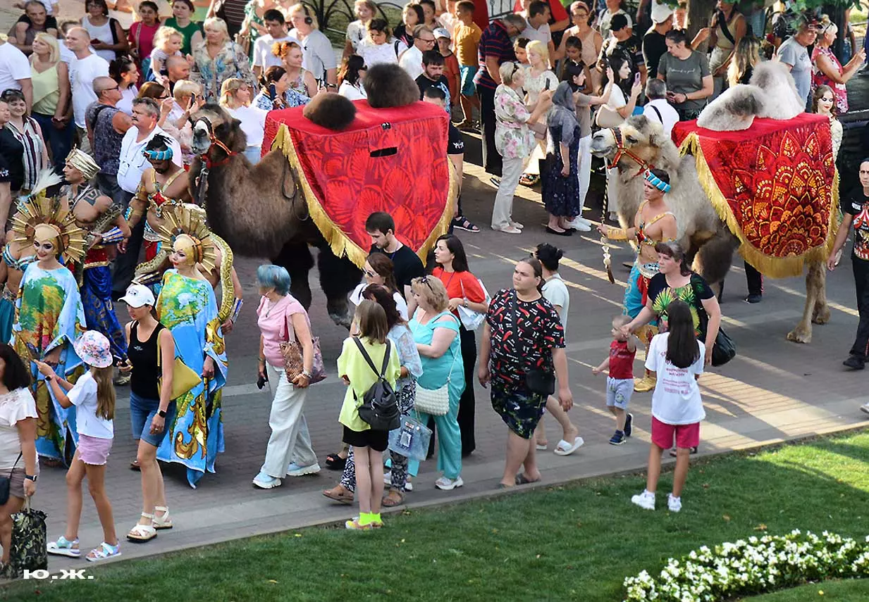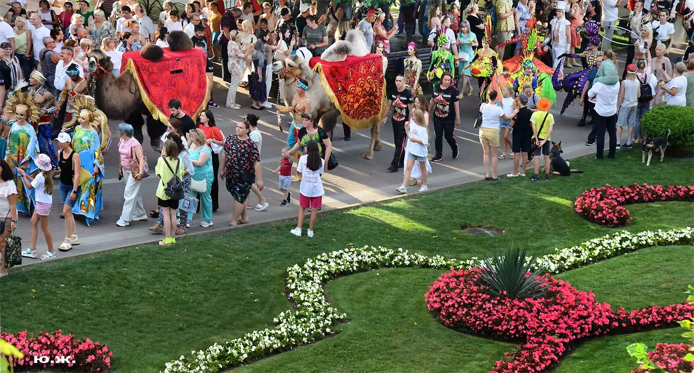 Перед нами разворачивается прекрасное действо, чудесное шоу, особенно, когда все проходит на фоне старинной архитектуры Курортного бульвара и пышных августовских клумб. И вот начинается движение мощной массы людей и «наших младших братьев», нарастает приглушенный гул, мы различаем уже детали. Сюжеты быстро меняются. Мы понимаем, какого высочайшего уровня это представление, восхищаемся чудесными костюмами, мастерством артистов, их статью, понимаем, какой за этим стоит гигантский труд…