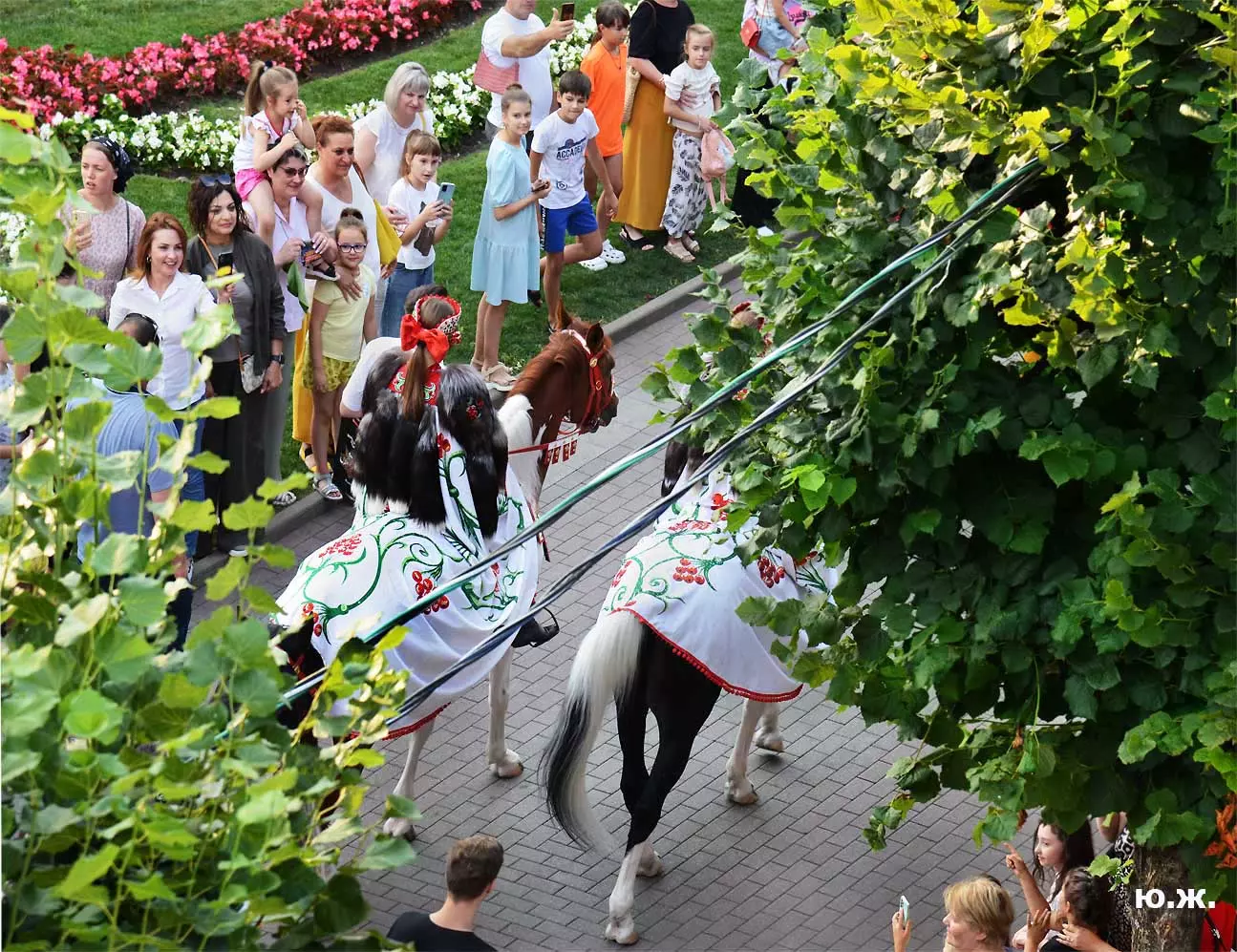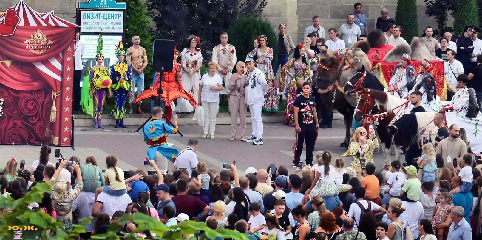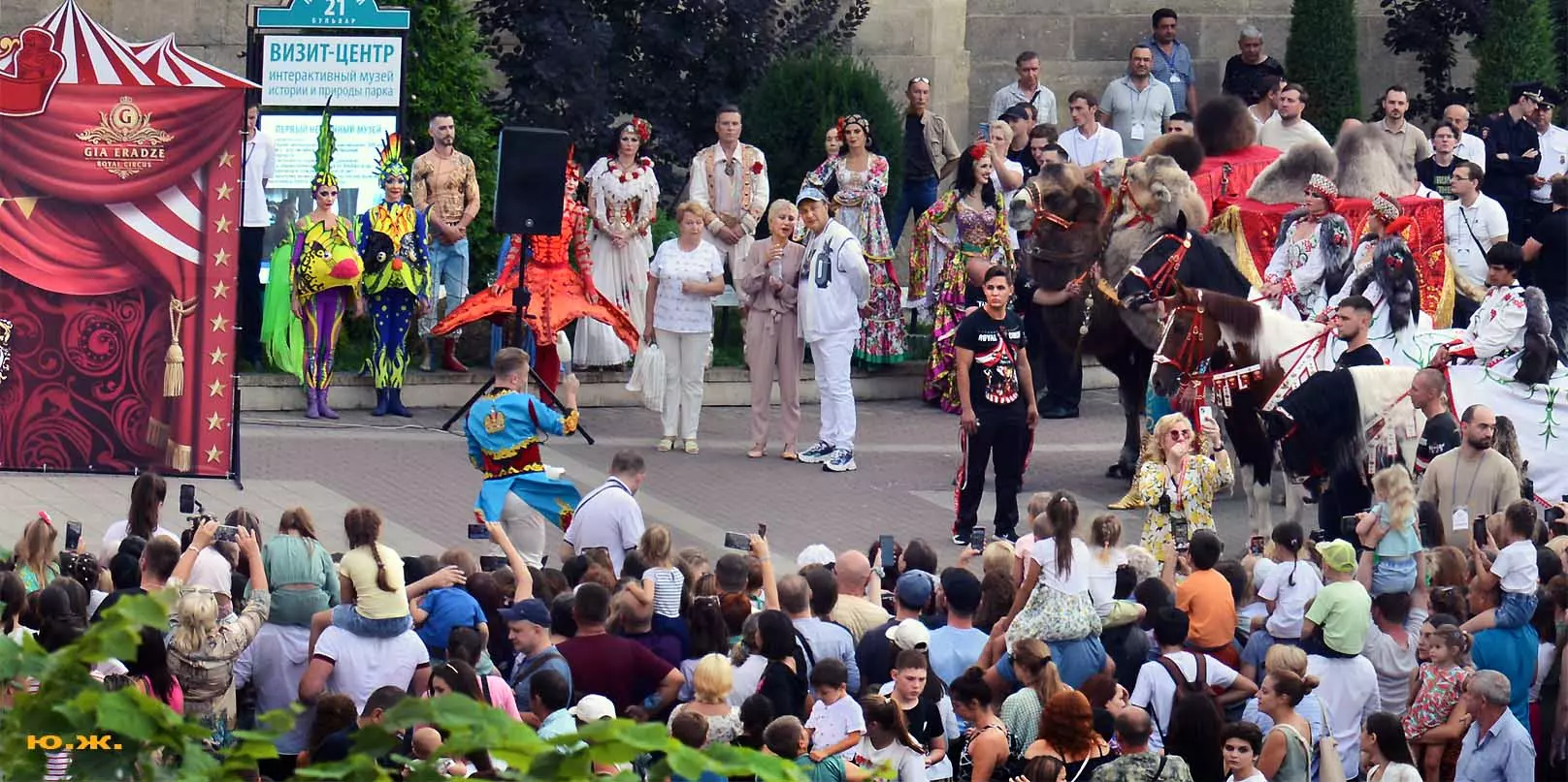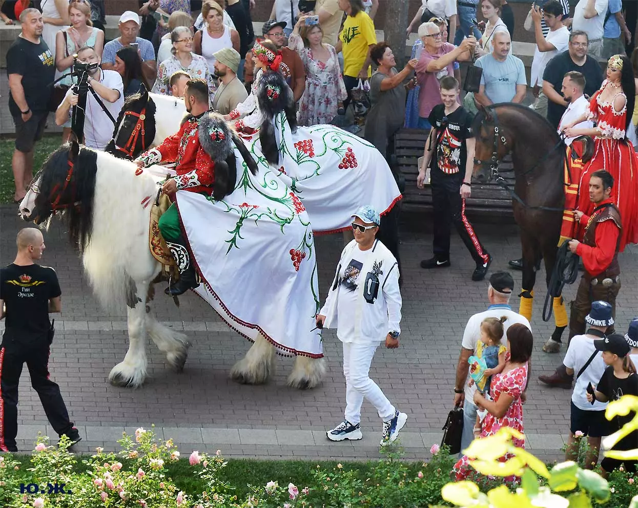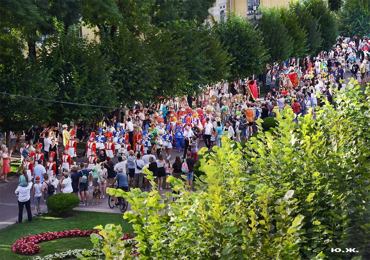 Перед нами разворачивается прекрасное действо, чудесное шоу, особенно, когда все проходит на фоне старинной архитектуры Курортного бульвара и пышных августовских клумб. И вот начинается движение мощной массы людей и «наших младших братьев», нарастает приглушенный гул, мы различаем уже детали. Сюжеты быстро меняются. Мы понимаем, какого высочайшего уровня это представление, восхищаемся чудесными костюмами, мастерством артистов, их статью, понимаем, какой за этим стоит гигантский труд…