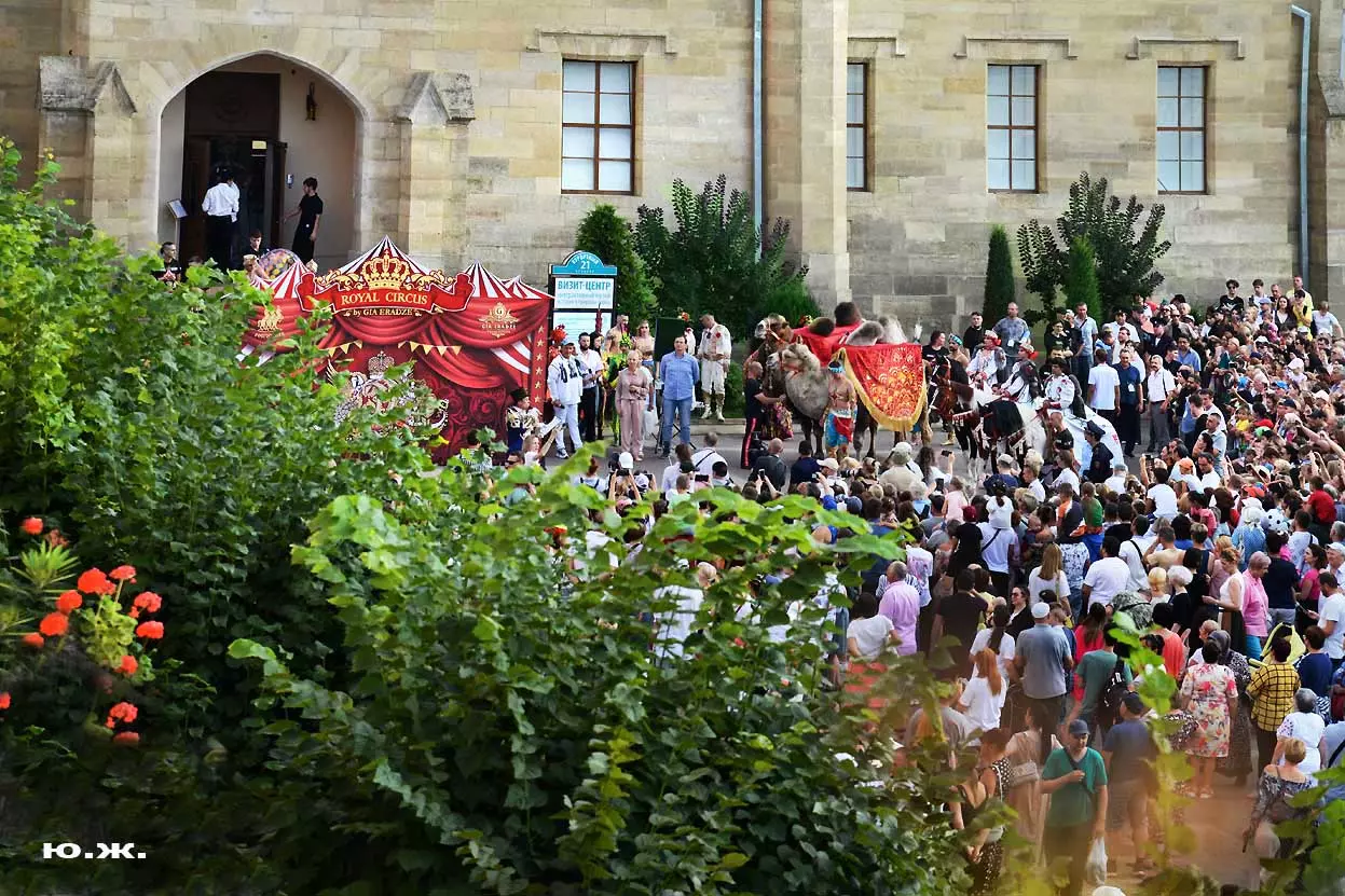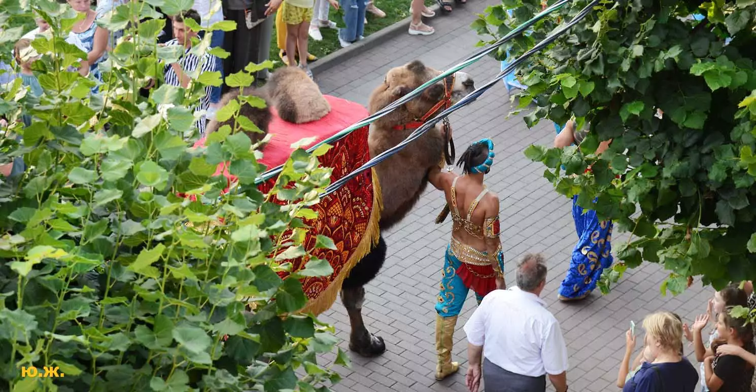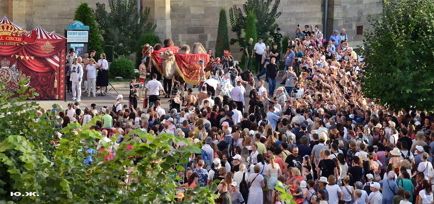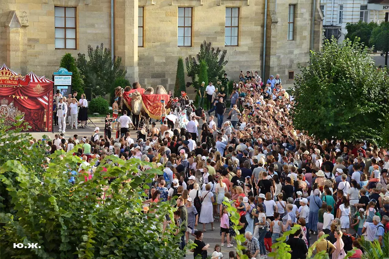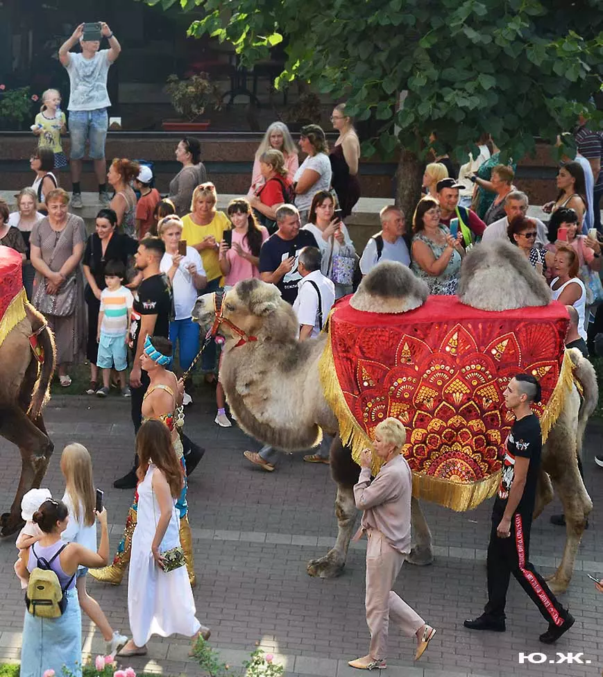 Впереди на фоне белых мощных лошадей шагает Маэстро Эрадзе, он тоже — в белом. Идут жонглеры, гимнасты, акробаты, кордебалет… Мы видим пару верблюдов. Легкое разочарование. В прошлом году они были звездами. Когда эти огромные корабли пустыни, гораздо большим числом и с прекрасными наездницами с их удивительным убранством тончайшей работы, что у девушек, приветствующих зрителей, что у верблюдов, которые покачиваясь, проходили мимо Главных Нарзанных Ванн, здания в Мавританском стиле, публика замирала. Это была настоящая « Восточная сказка» — название одной из прошлых программ этого же коллектива. И если такие кавалькады на Курортном бульваре будут постоянными, то изображение на фоне здания в восточном стиле каравана верблюдов с наездницами может стать символом Главных Нарзанных Ванн, быть на почтовой марке. И просто на открытке. Стать еще одним притяжением Кисловодска. Браво, Маэстро! А еще лучше — купить билет, направиться в цирк и посмотреть великолепное шоу «Пять Континентов» с близкого расстояния…