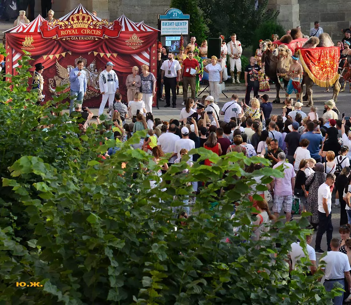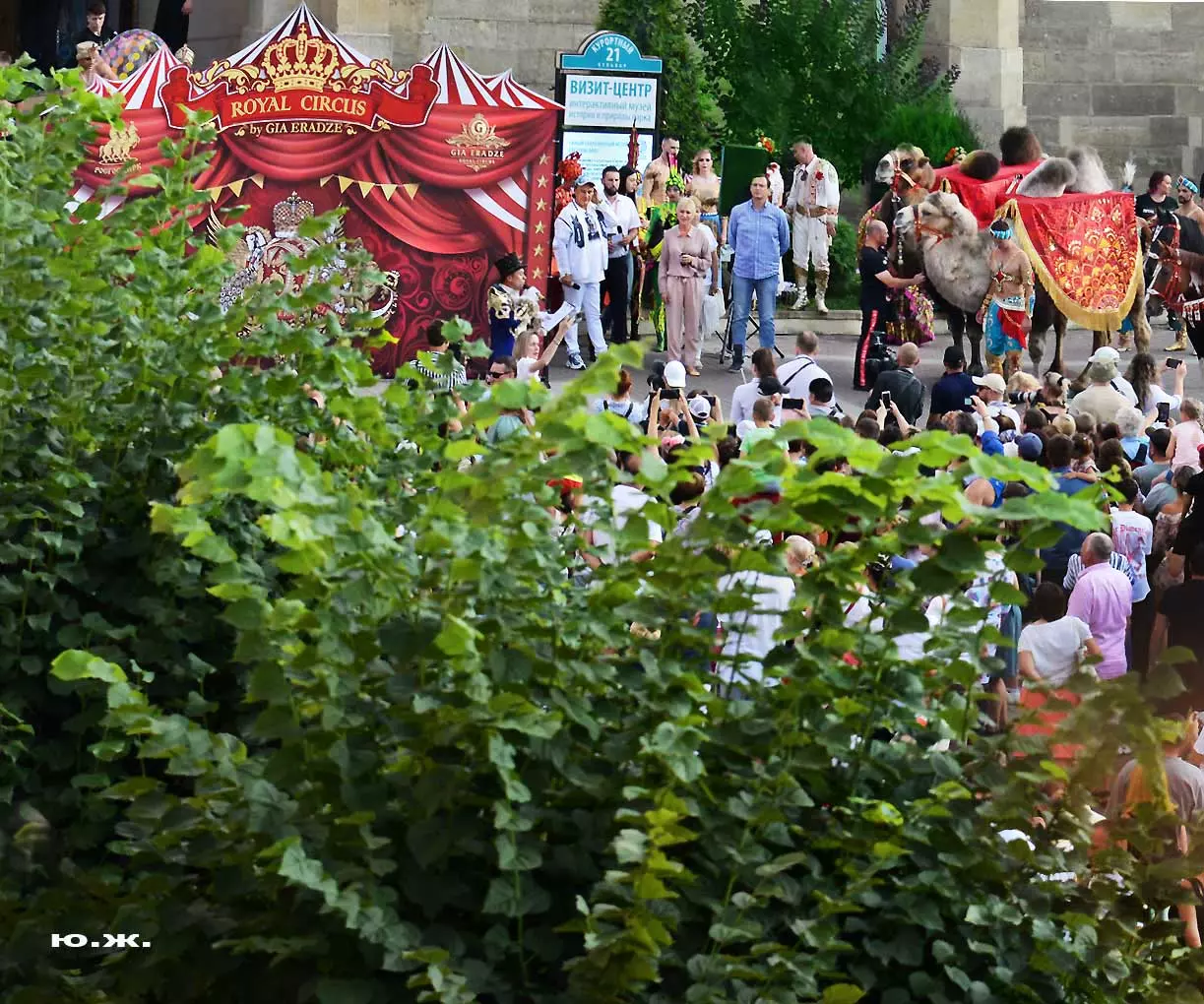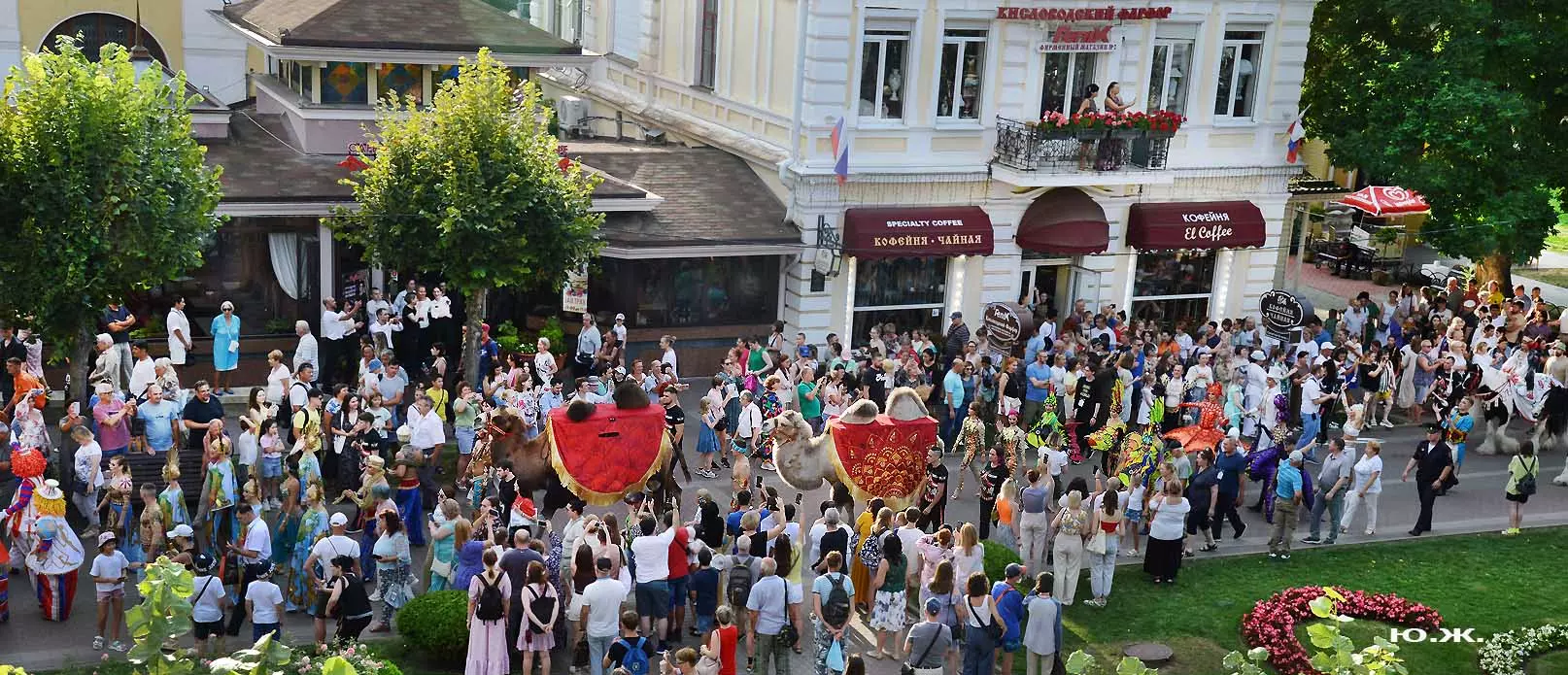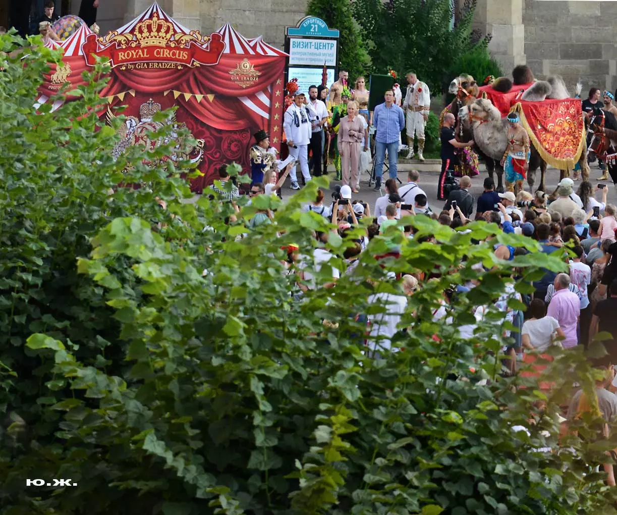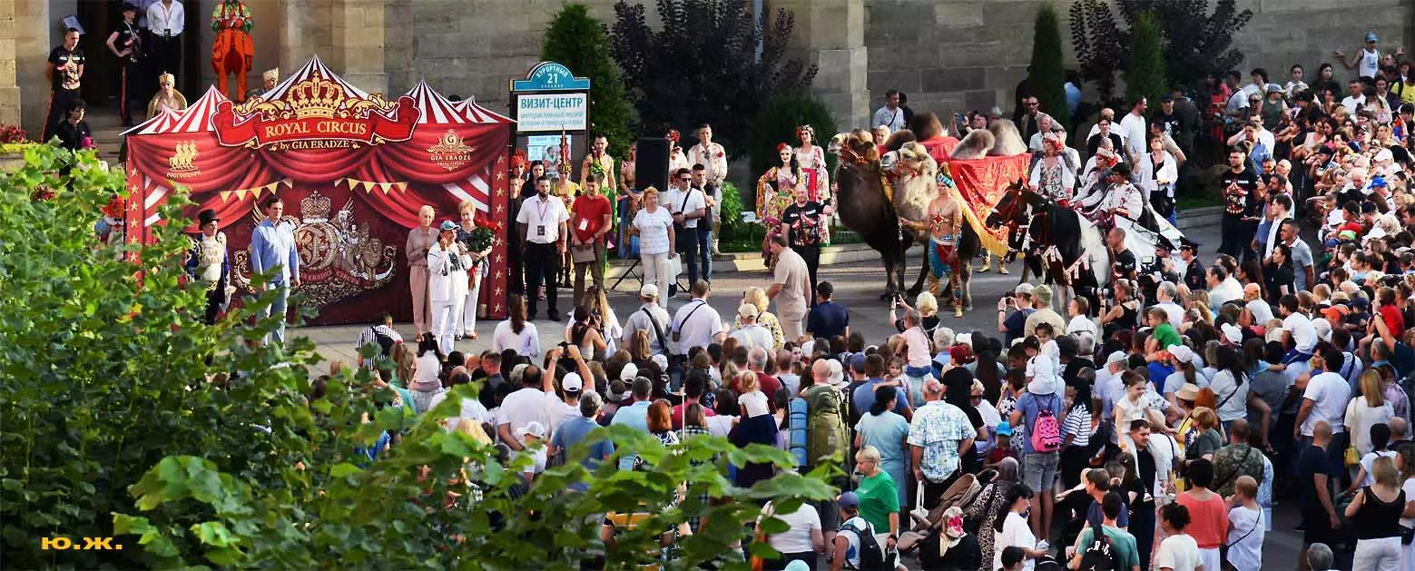 Впереди на фоне белых мощных лошадей шагает Маэстро Эрадзе, он тоже — в белом. Идут жонглеры, гимнасты, акробаты, кордебалет… Мы видим пару верблюдов. Легкое разочарование. В прошлом году они были звездами. Когда эти огромные корабли пустыни, гораздо большим числом и с прекрасными наездницами с их удивительным убранством тончайшей работы, что у девушек, приветствующих зрителей, что у верблюдов, которые покачиваясь, проходили мимо Главных Нарзанных Ванн, здания в Мавританском стиле, публика замирала. Это была настоящая « Восточная сказка» — название одной из прошлых программ этого же коллектива. И если такие кавалькады на Курортном бульваре будут постоянными, то изображение на фоне здания в восточном стиле каравана верблюдов с наездницами может стать символом Главных Нарзанных Ванн, быть на почтовой марке. И просто на открытке. Стать еще одним притяжением Кисловодска. Браво, Маэстро! А еще лучше — купить билет, направиться в цирк и посмотреть великолепное шоу «Пять Континентов» с близкого расстояния…