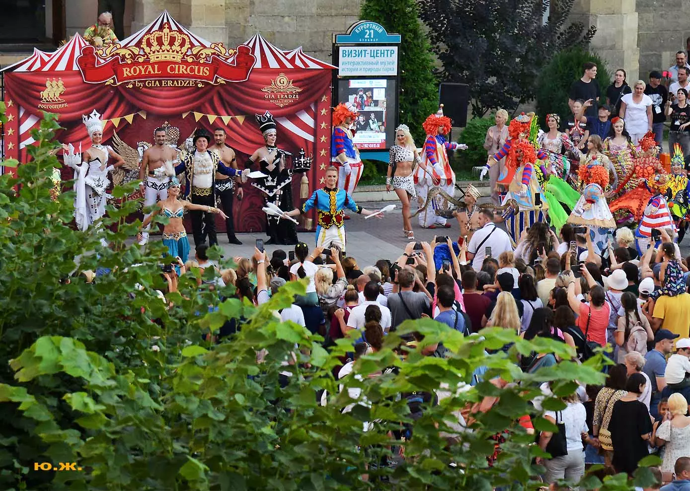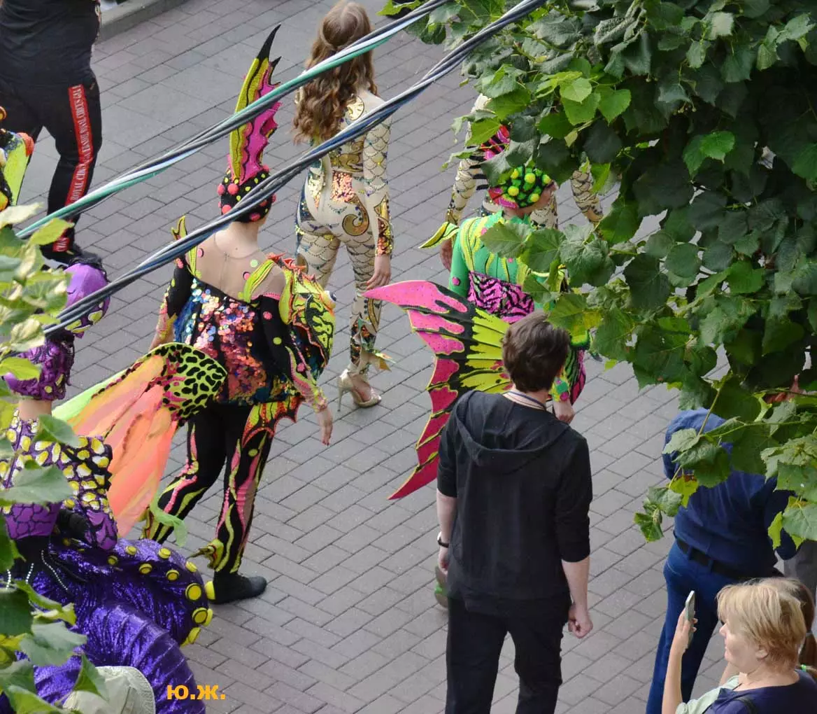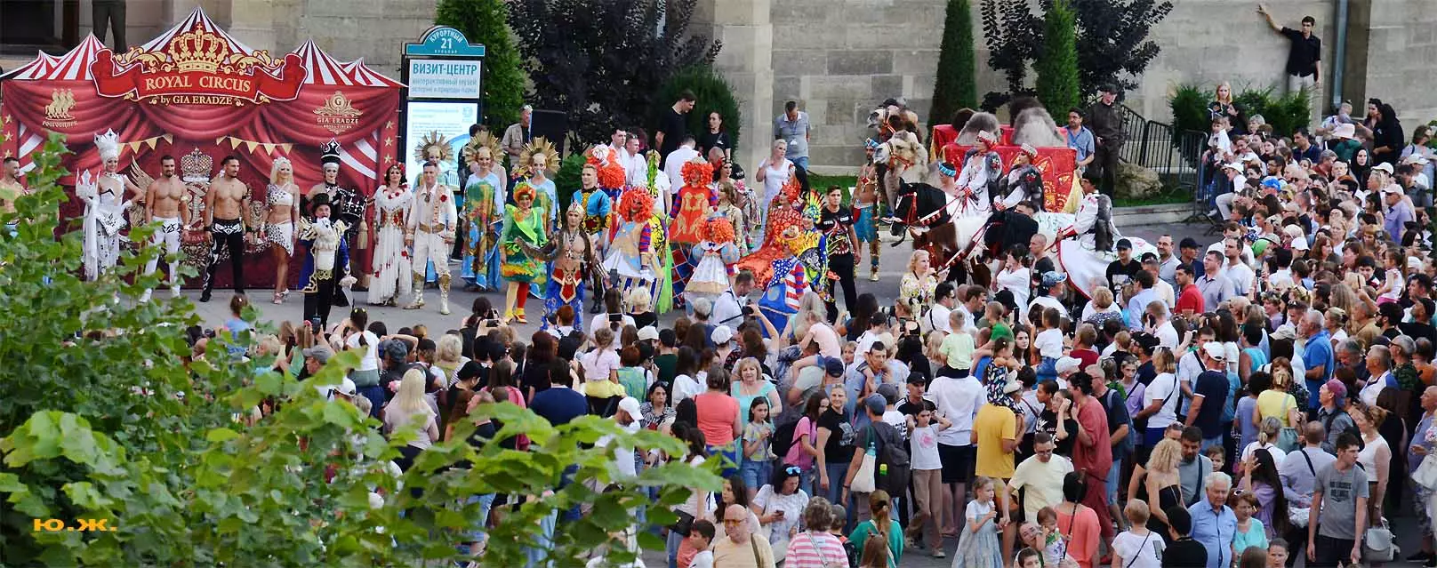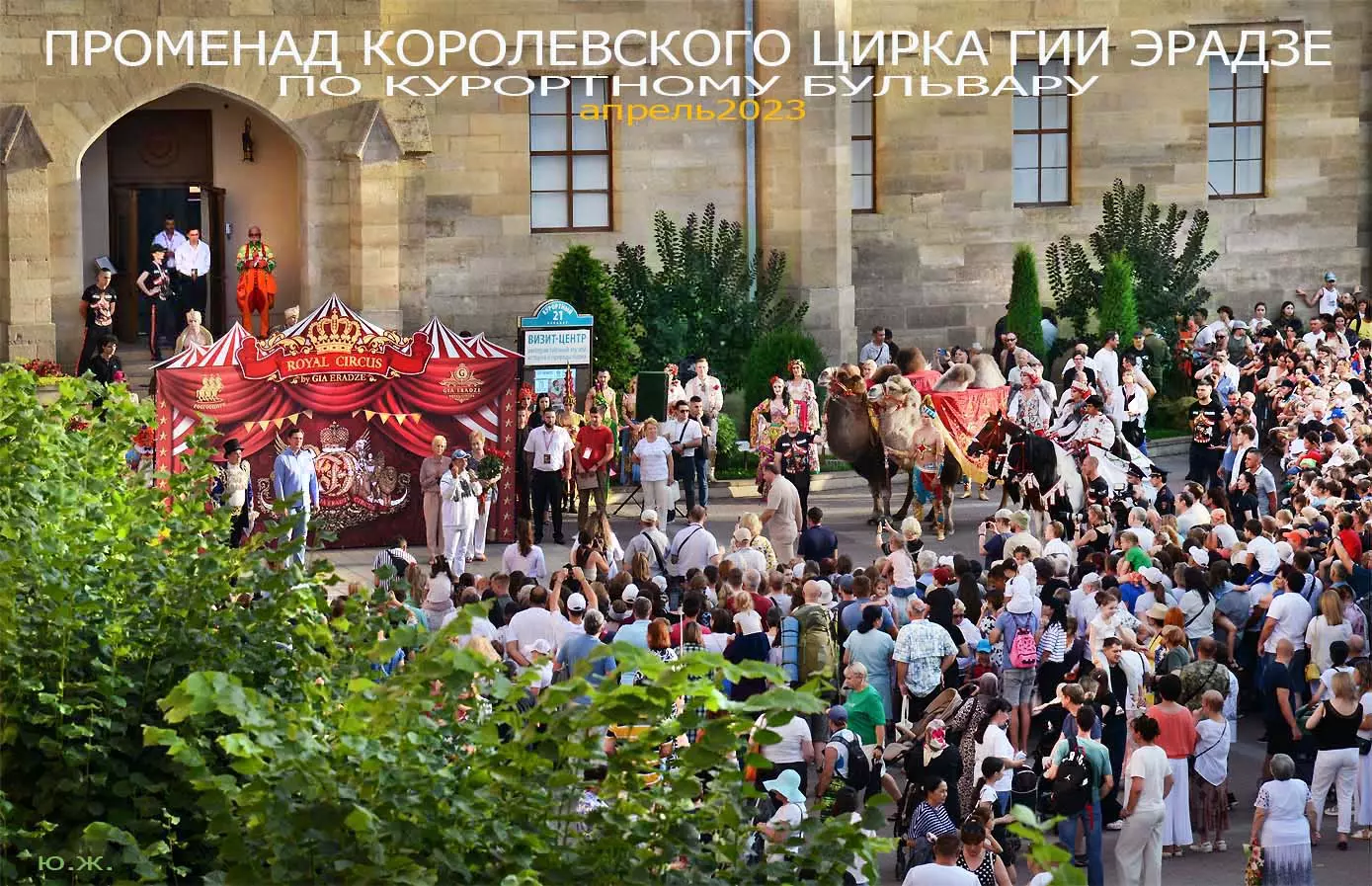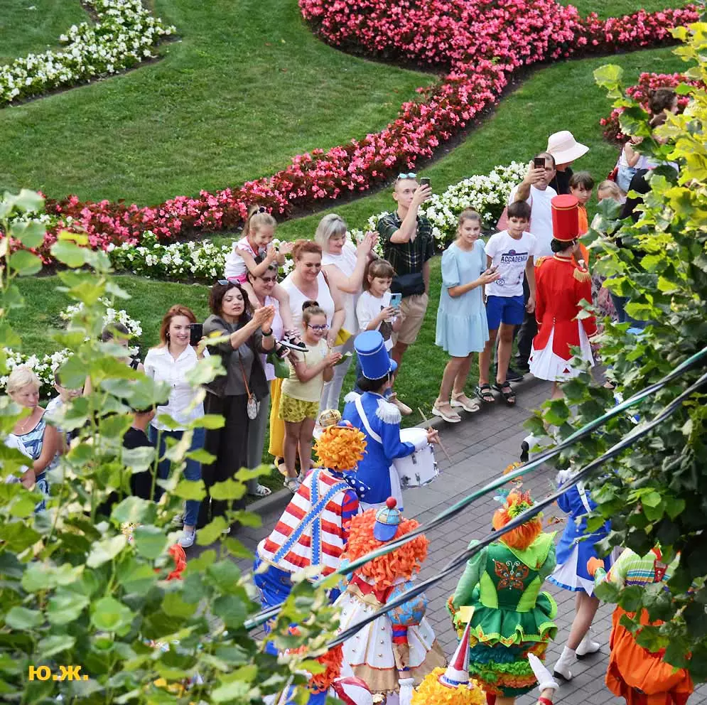 Променад артистов циркового шоу «5 континентов» Гии Эрадзе по Курортному бульвару я решил снимать в этот раз сверху, с красивого старинного здания, с его балкона, благо, современная оптика позволяет и приближать, и выбирать то, что интересно, да и не хотелось никому мешать.