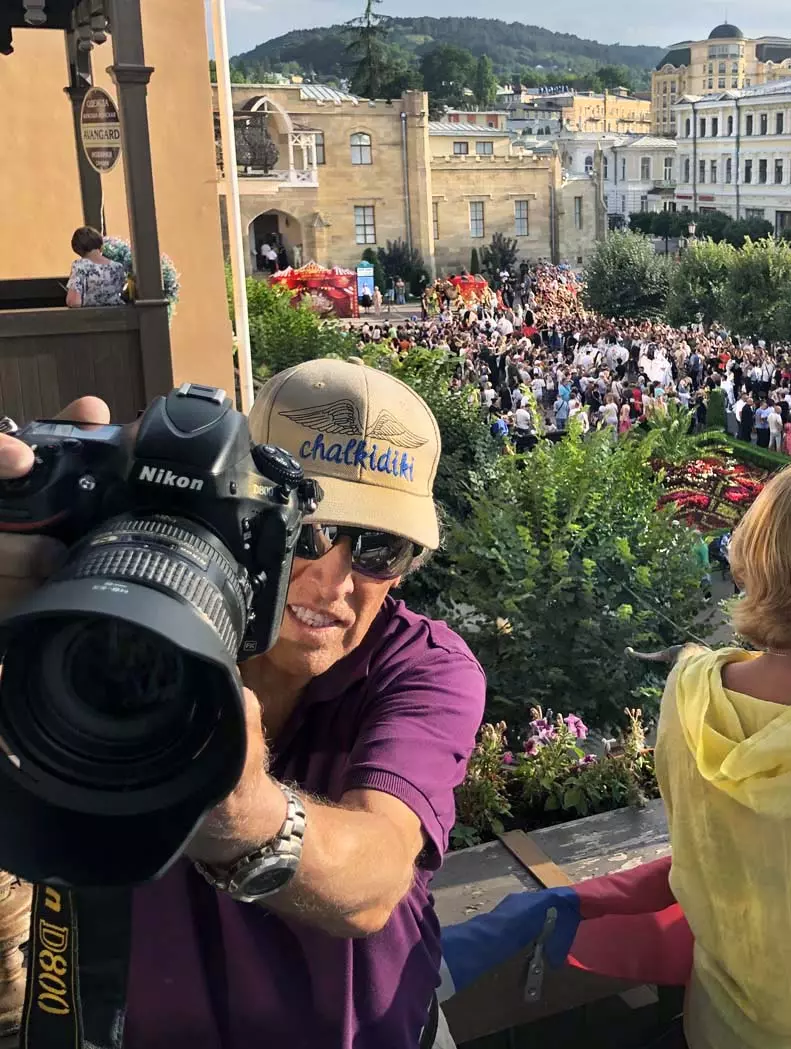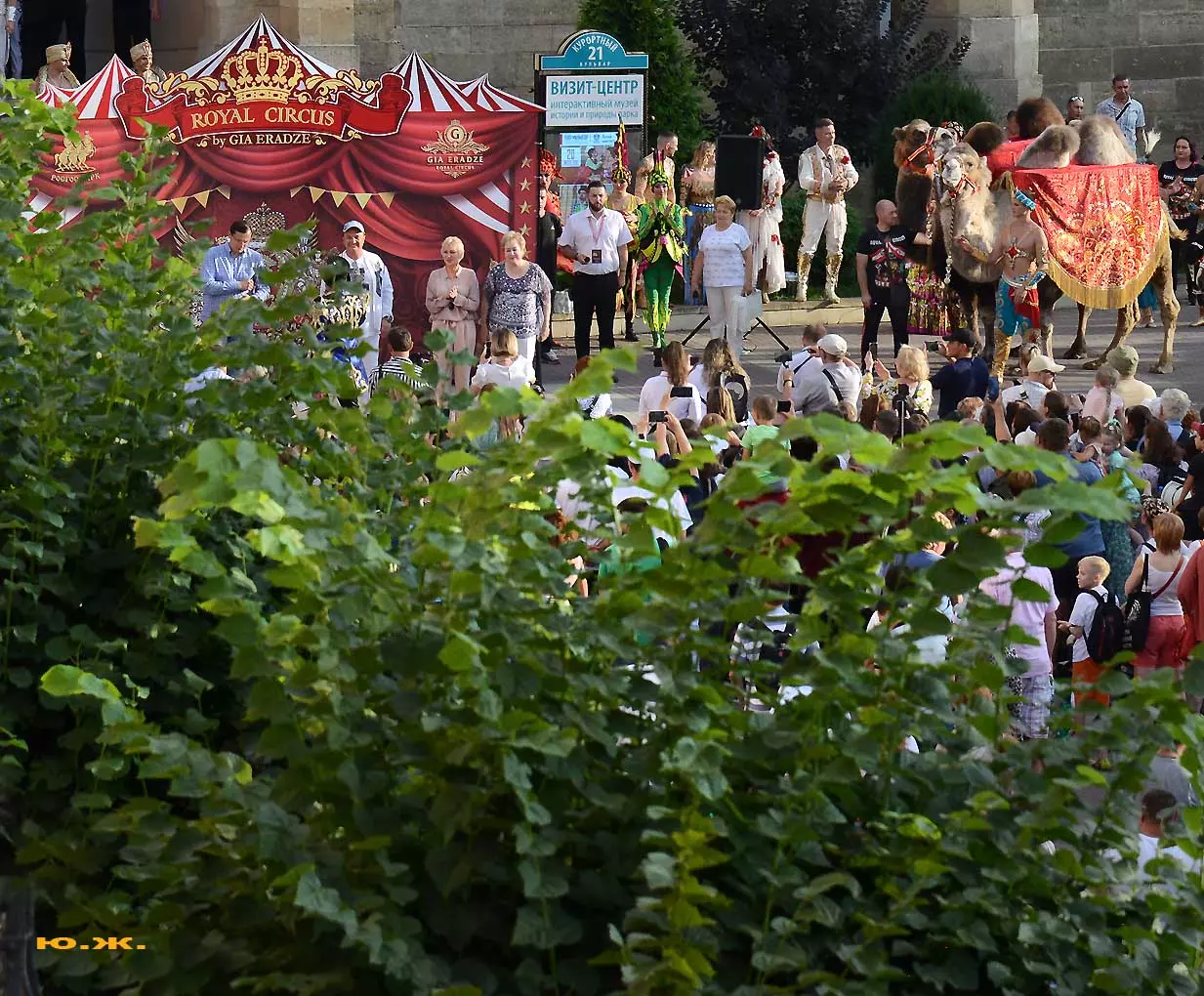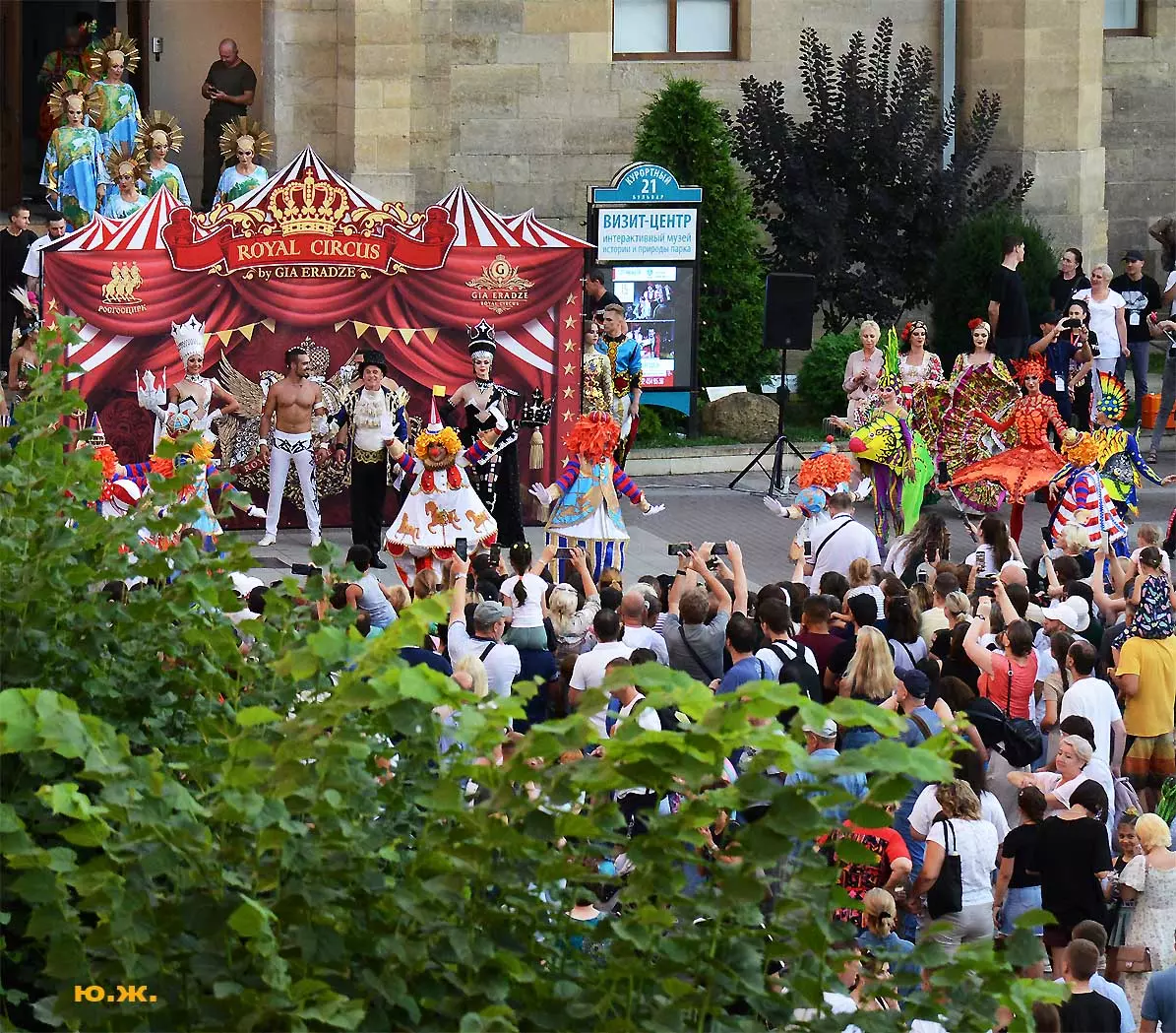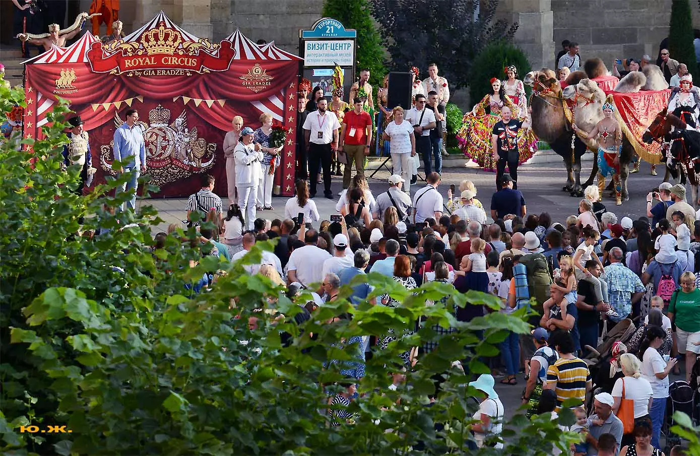 Променад артистов циркового шоу «5 континентов» Гии Эрадзе по Курортному бульвару я решил снимать в этот раз сверху, с красивого старинного здания, с его балкона, благо, современная оптика позволяет и приближать, и выбирать то, что интересно, да и не хотелось никому мешать.