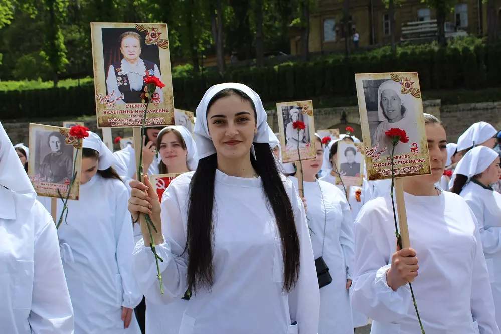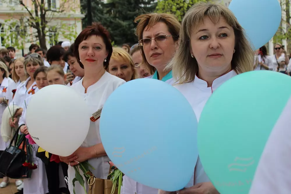 Часть участников облачилась в медицинскую форму времен Великой Отечественной войны и несла фотографии руководителей эвакогоспиталей, погибших героев в белых халатах. «Белоснежная» колонна прошествовала до памятника Героям-медикам, где состоялся торжественный митинг и возложение цветов.