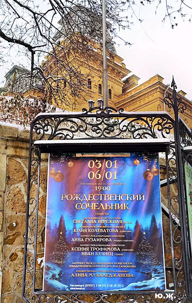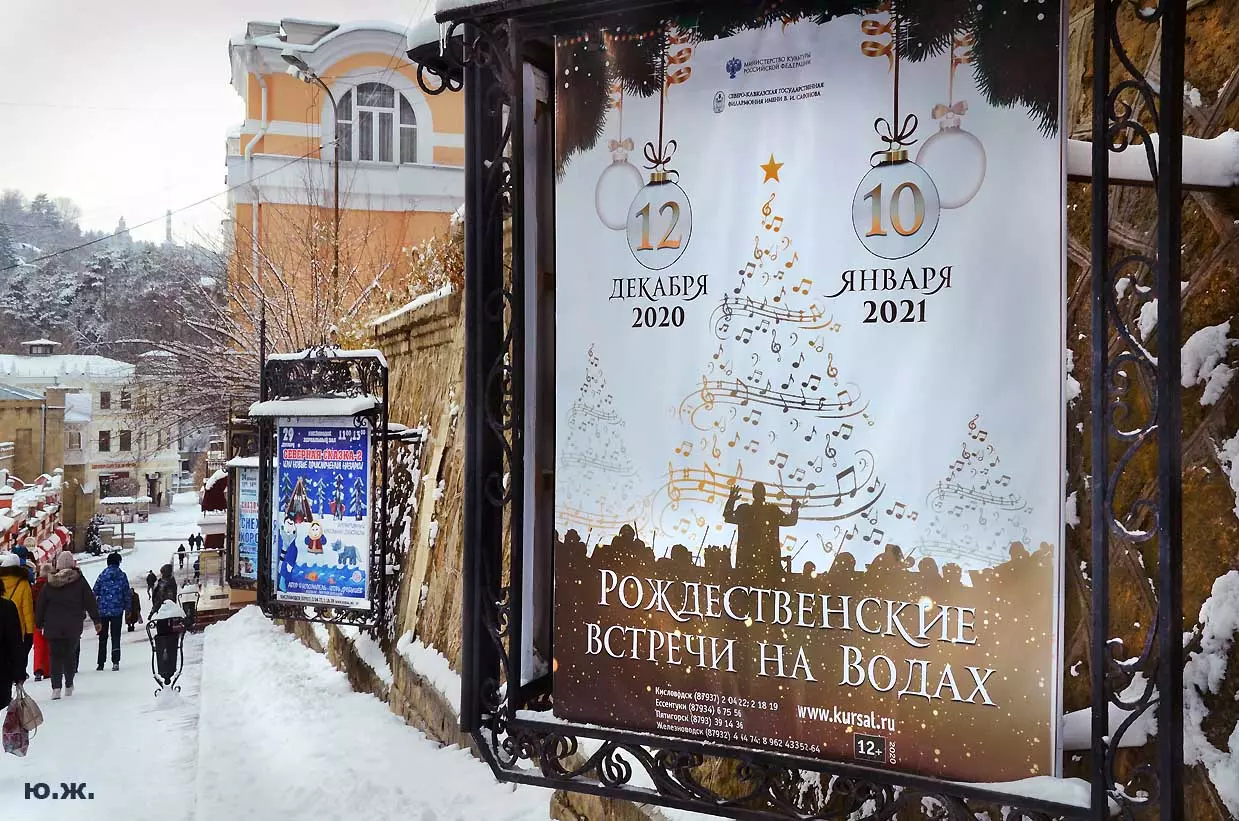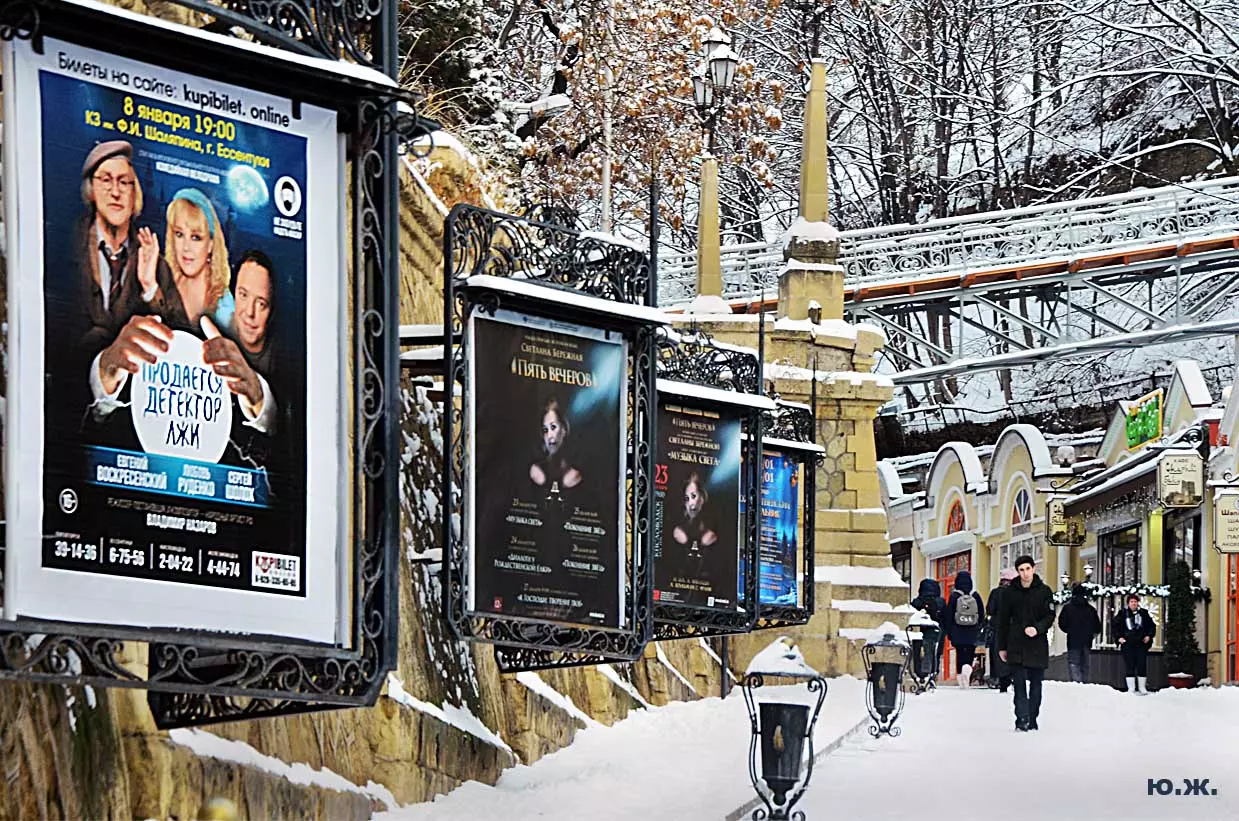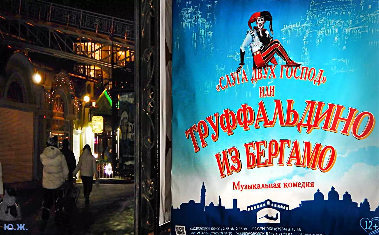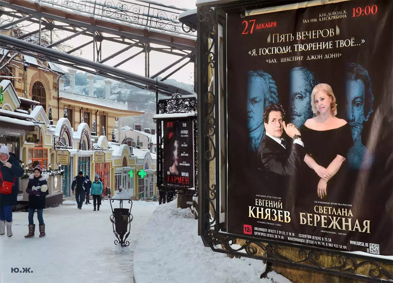 На Курортном бульваре установлены две красивые новогодние елки, на разный вкус. Бульвар же как всегда прекрасен. Вверх от него по проспекту Карла Маркса можно пройтись и полюбоваться на театральные афиши, они достойны этого всегда, но в зимние праздники, с их богатым новогодним и рождественским репертуаром, особенно. А еще, когда все вокруг белым бело от снега и перед собой видишь гондольера а позади его Венецию… Релакс- прекрасная вещь, даже когда это просто афиша. Врачам курорта хорошо бы рекомендовать своим пациентам такой променад как позитивную психотерапию, и, естественно, с посещением Курзала.