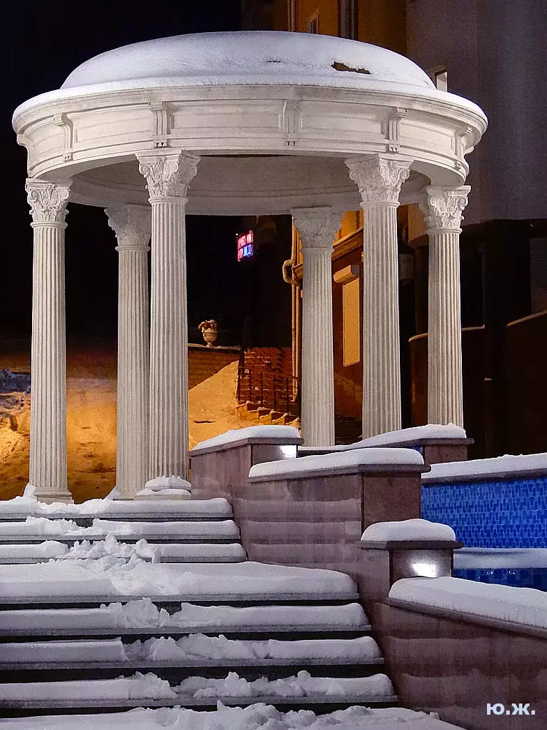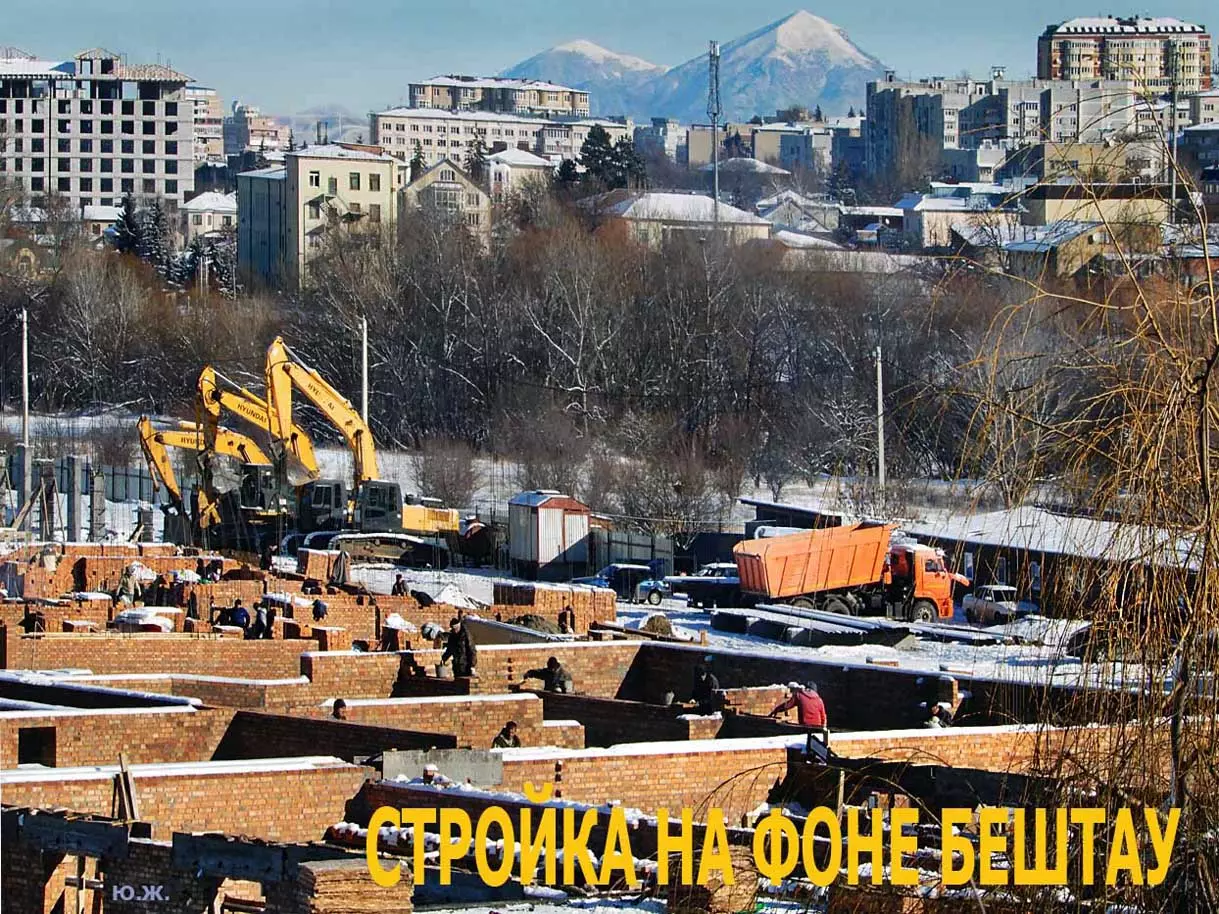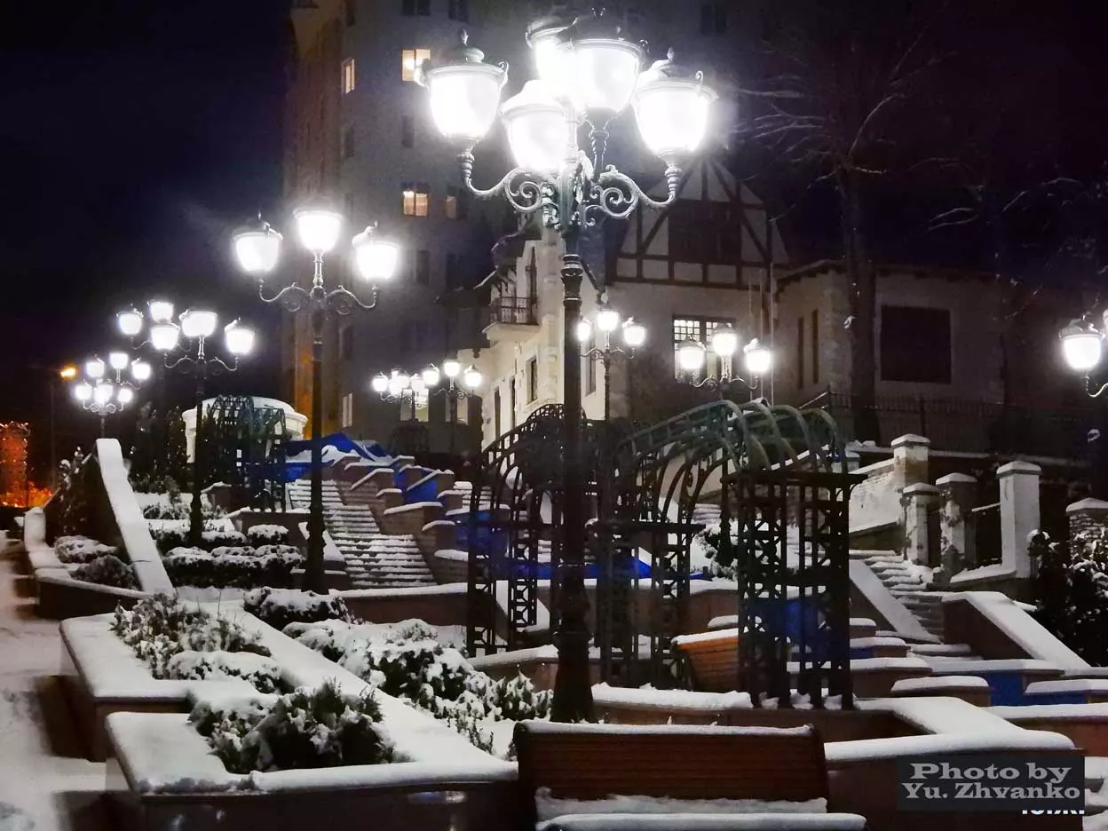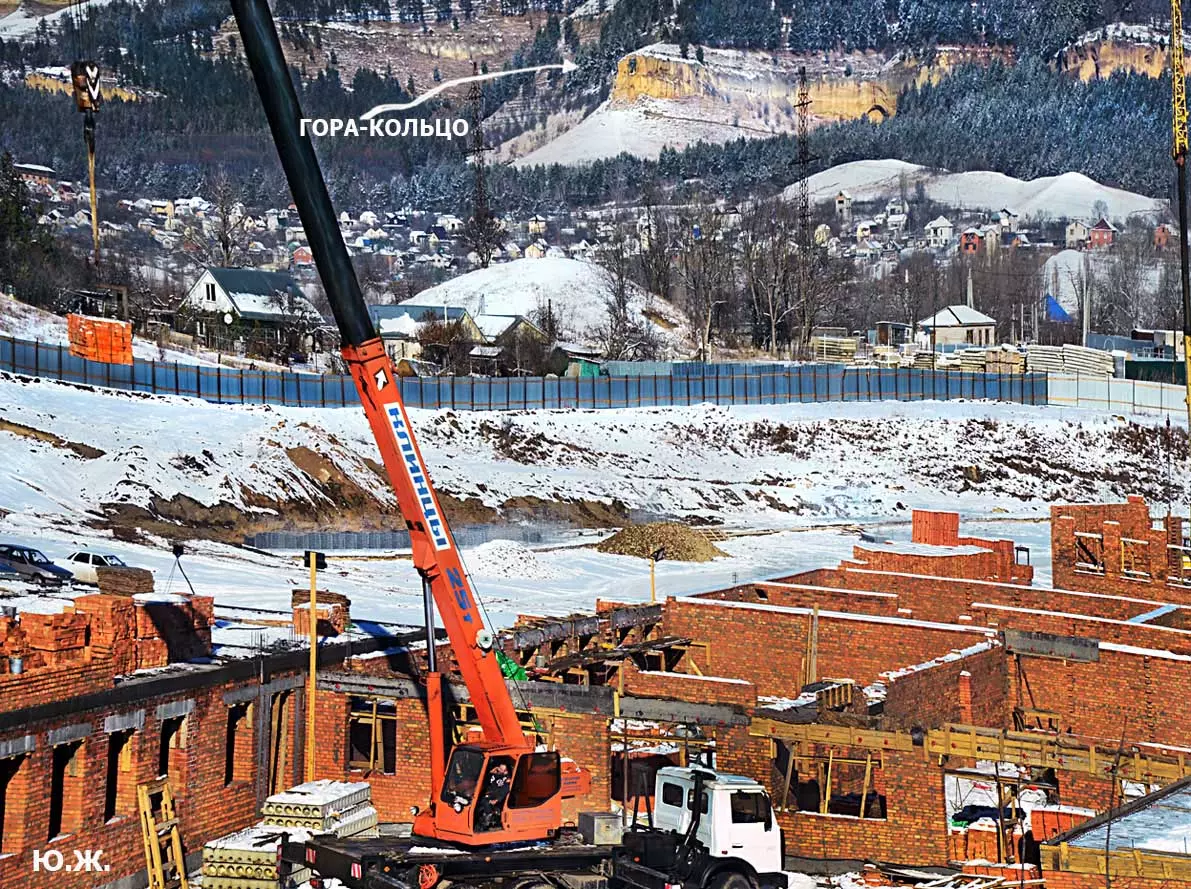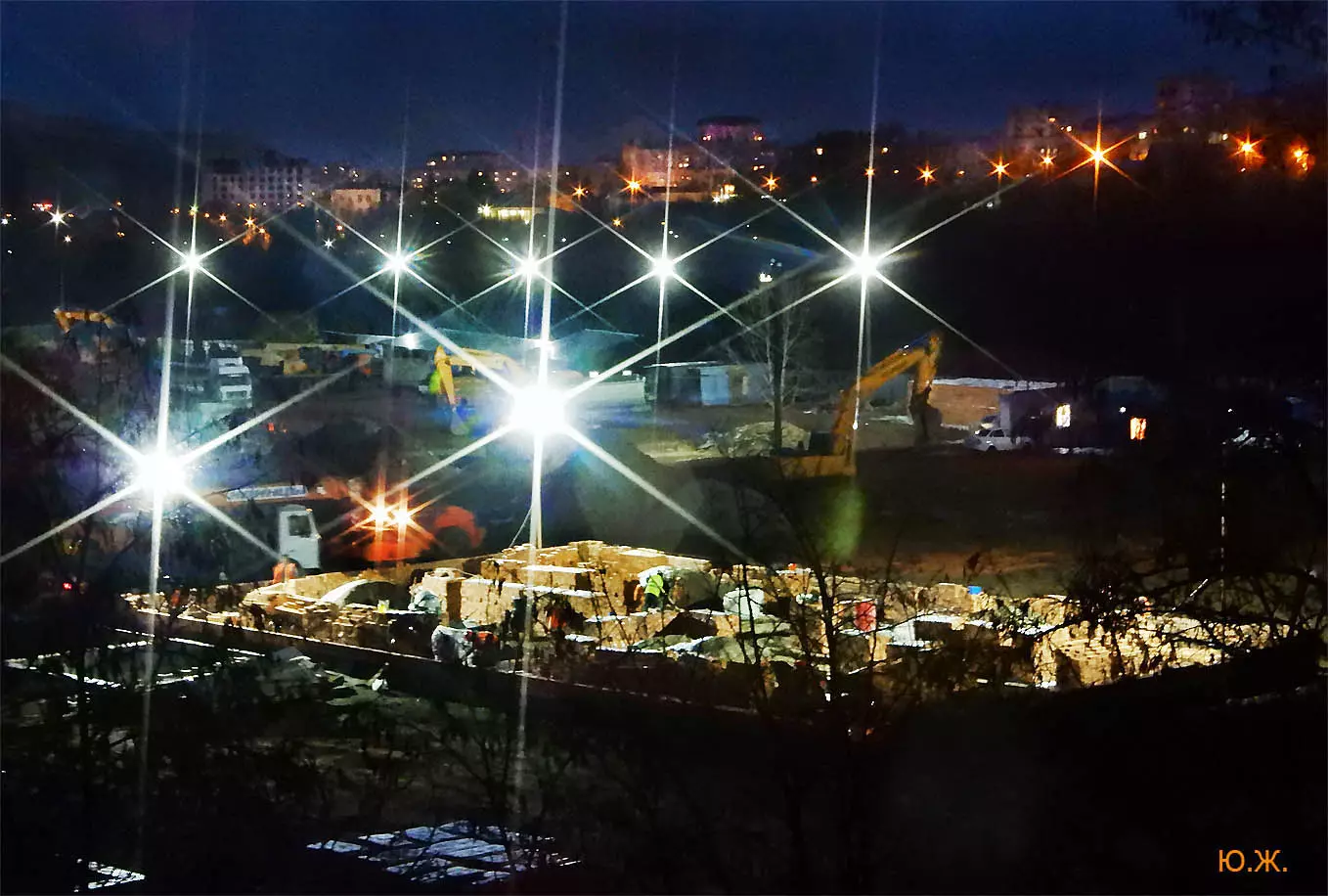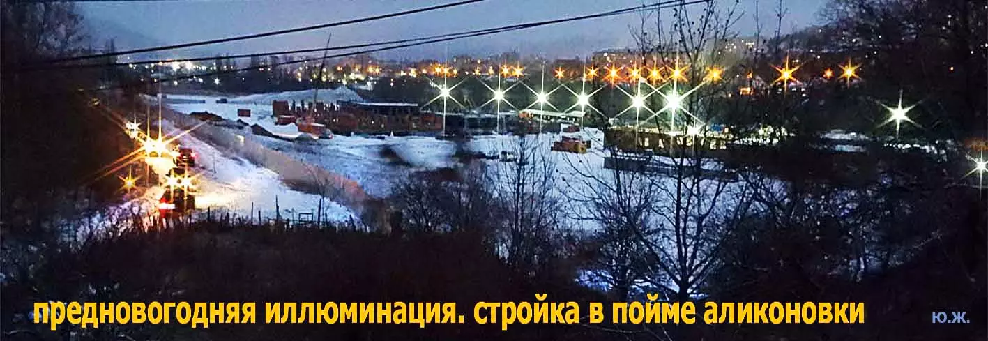 На известной большой стройке в пойме Аликоновки в эти зимние дни, когда рано темнеет и Кисловодск зажигает огни, включаются прожектора самой стройки, и отсюда открывается прекрасный вид на долину–к северу поднимается Боргустанский хребет, видна Кольцо-гора, на востоке высится громада Бештау, (и Кольцо-гора, и гора Бештау воспеты великим Лермонтовым) и когда стоишь на дамбе в 20 метрах от стройки, перед вами возникает еще одна зимняя сказка.