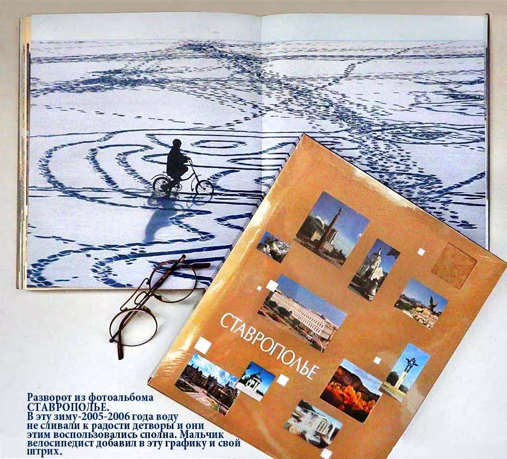Еще немного о Старом озере. Я здесь даю пару, тройку снимков из фотоальбома «Ставрополье». Это большой подарочный фолиант, который многие видели и даже имеют. Там дана на весь разворот, почти 50 сантиметров, фотография нашего зимнего озера, покрытого льдом, и другие снимки озера и его ближайших окрестностей — тоже на разворот, уже по несколько фото… Таких больших снимков по другим городам нет. Отбор фотографий для макета производился комиссией Правительства края, был очень жестким, и очень приятно, что мою идею поняли и поддержали. Главная моя цель — донести ее до руководства: будет очень недальновидно, если наше озеро будет столько зимних месяцев пустовать. Лед, окрепнув, стоит долго. Раньше всегда, и зимой, там было много людей. Выпадал снег, ребята тут же очищали пространство льда для хоккейных, футбольных площадок, и просто для катания на коньках. Это, конечно, любительство, но ведь хорошо для здоровья, особенно когда дни станут длиннее. Молодежь и не только, организуются сами, как всегда. Кстати, для мембраны полезно когда она остается под гнетом тысяч кубометров воды и утрамбовывается. Будет просто обидно, если спустят воду. Хочется верить, что этого не произойдет.