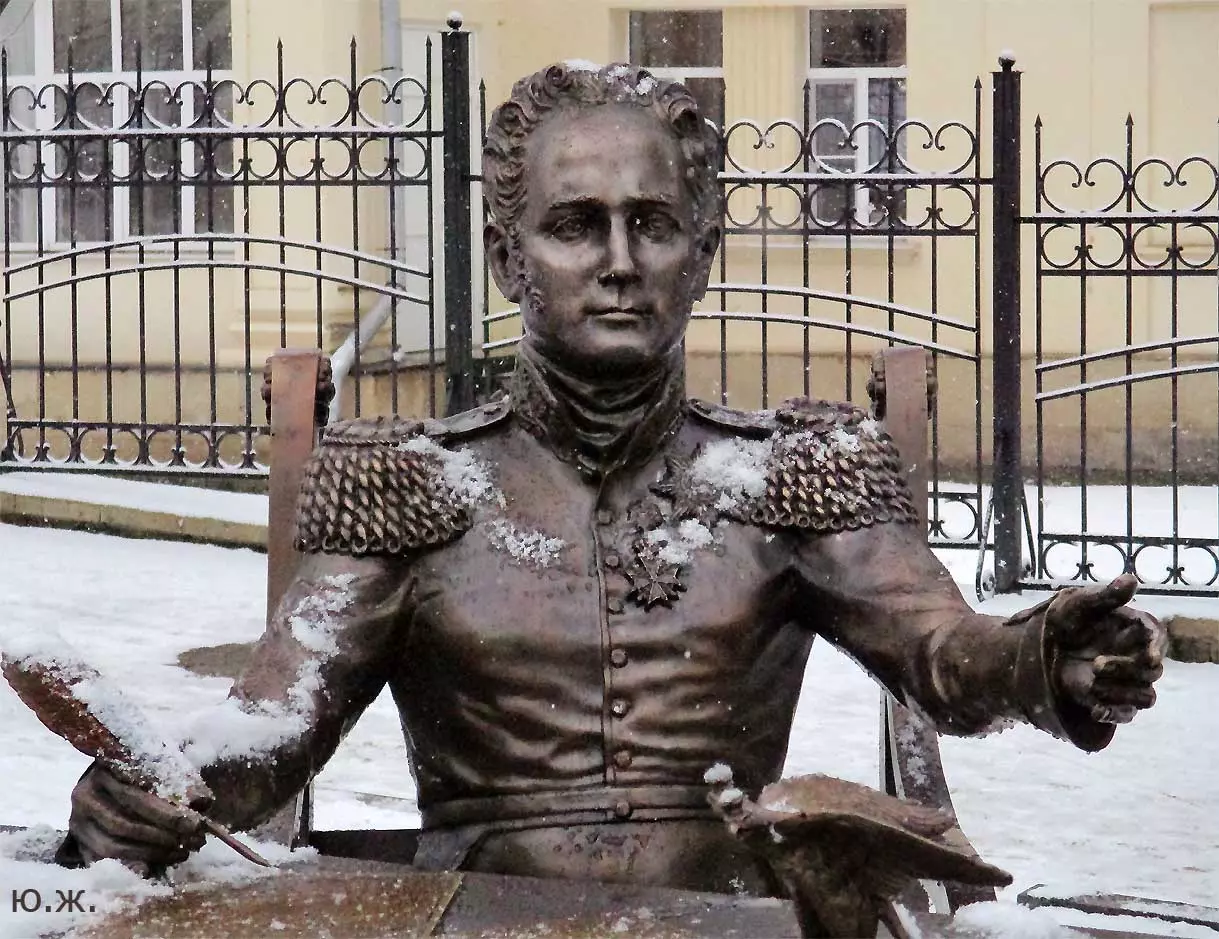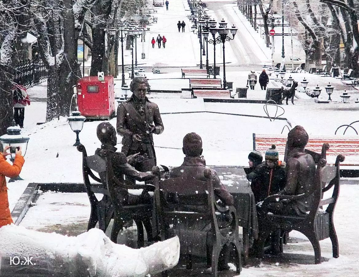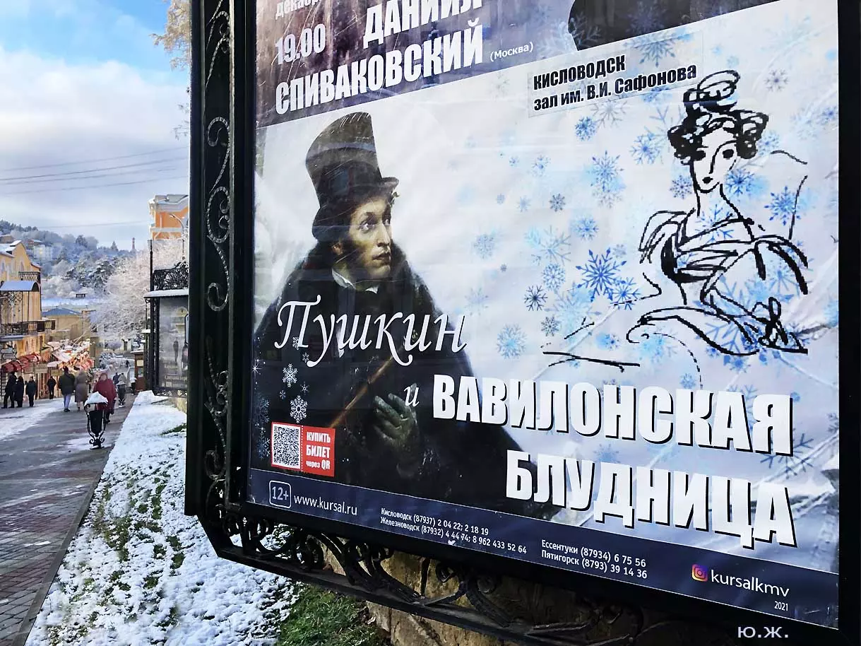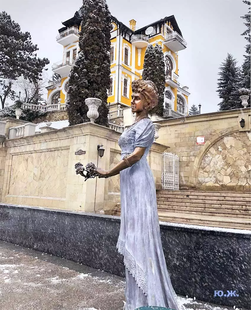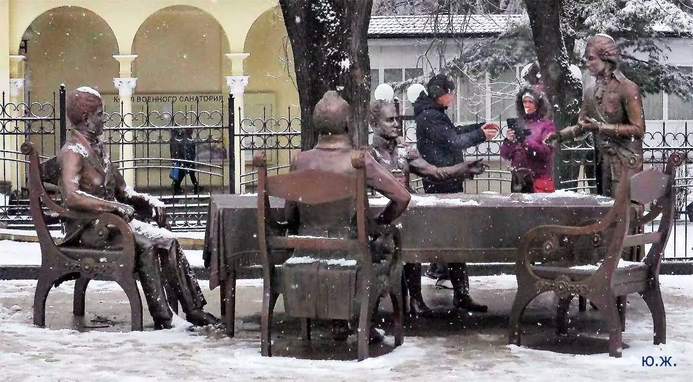 В этот же день, также при падающем снеге я провел фотосессию на новом, еще не законченном проспекте Ленина. Около дома №13 Российский Император, со своей свитой (думаю, что она будет прибавляться со временем) подписывает бронзовым гусиным пером свой знаменитый рескрипт от 24 апреля 1803 года… Рядом с их большим бронзовым столом стоит также бронзовая балерина в роскошном голубом платье до земли с бронзовыми украшениями на шее и в ушах: Матильда Кшесинская, как раз напротив стоящего на верху отвесной скалы, красивого особняка, который молва ей приписывала много лет. Дальше вверх по проспекту расположены еще до конца не готовые бюветы минеральной воды, красивые фонари, ротонды…