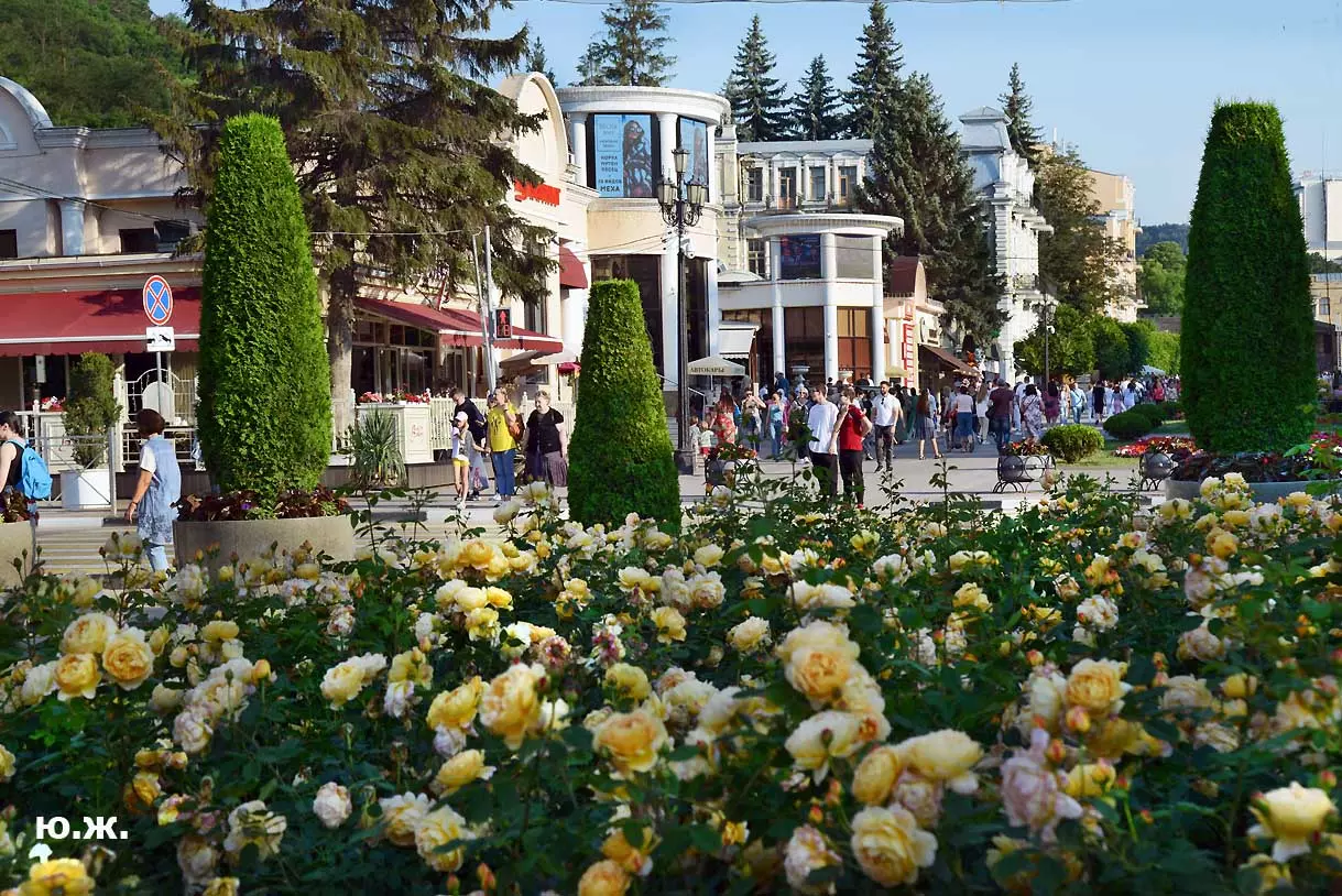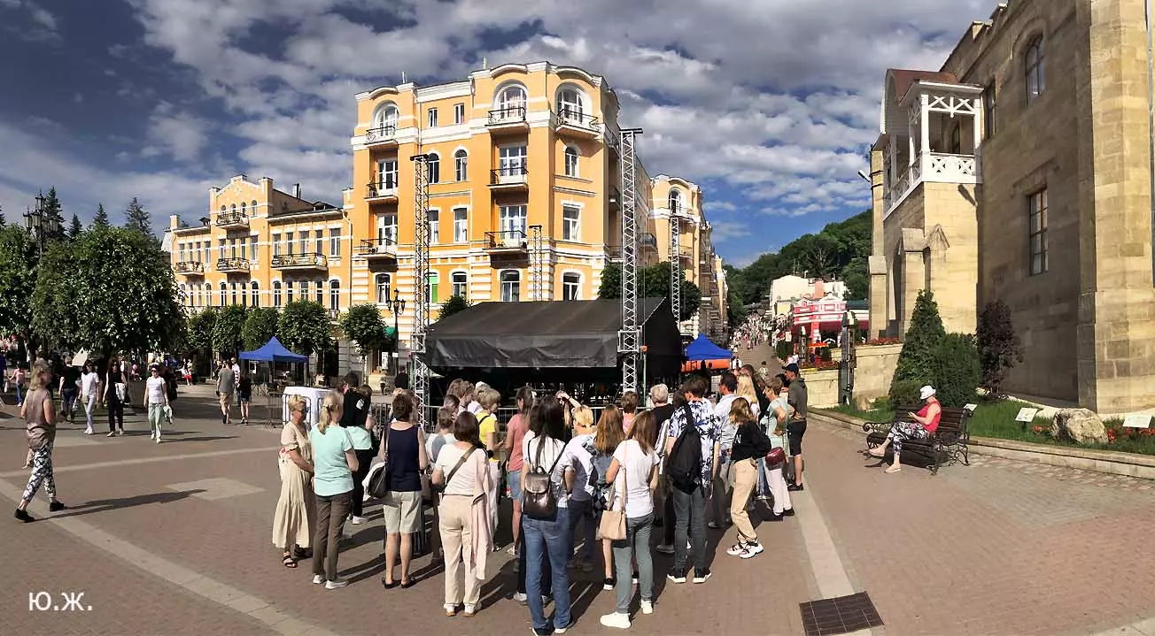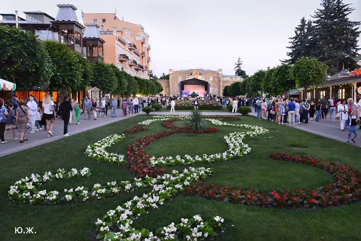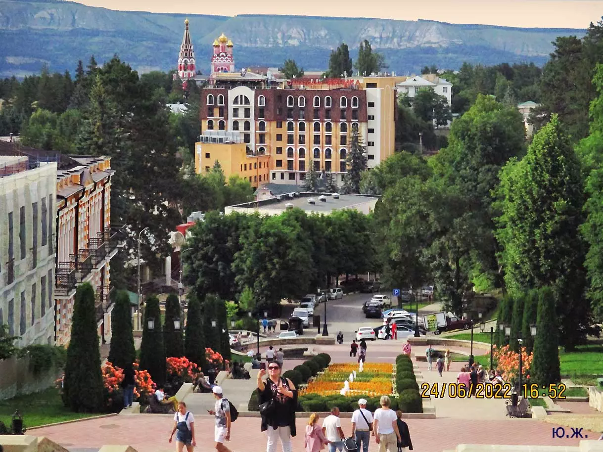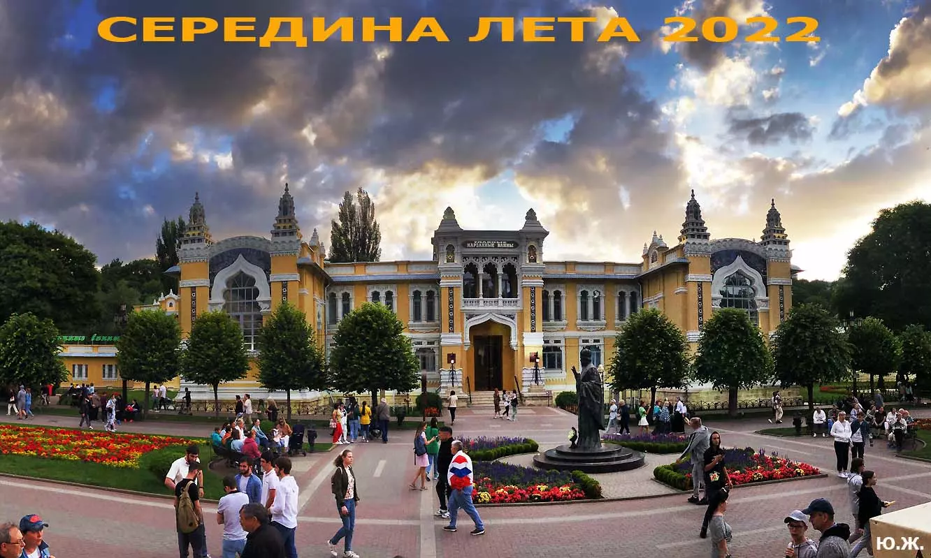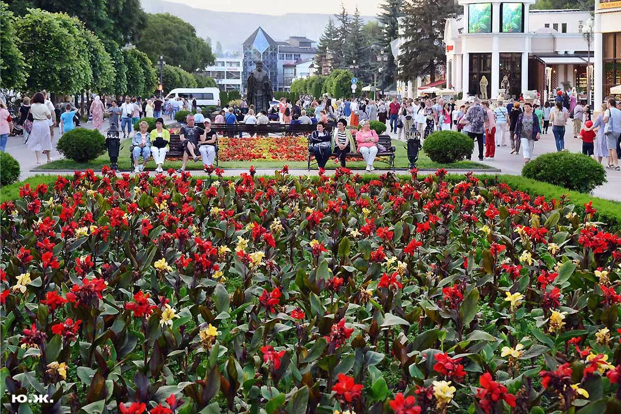 Вот уже и середина лета. Публика переходит на светлые наряды. Многочисленные фонтаны города работают по максиму, придавая настоянному на фитонцидах кисловодскому воздуху дополнительную свежесть — хотя и не все они работают. Очень эффектно смотрится комплекс Малой Каскадной лестницы. И высота струй, и подсветка. Набравшие полную мощь роскошные клумбы, особенно бисквитные, дарят фланирующим вдоль них отдыхающим и горожанам эстетическое удовольствие. Хорошо сейчас и в Национальном парке, и чем выше, тем лучше. Много людей на Красном Солнышке. Отсюда прекрасный обзор, почти круговые панорамы, еще свежее воздух… Апогей лета! Здесь стоит памятник Михаилу Юрьевичу Лермонтову.