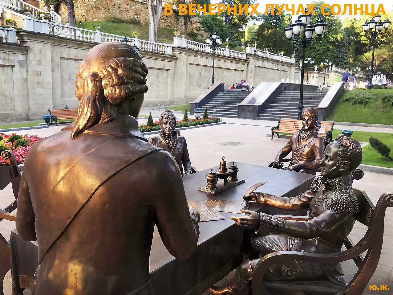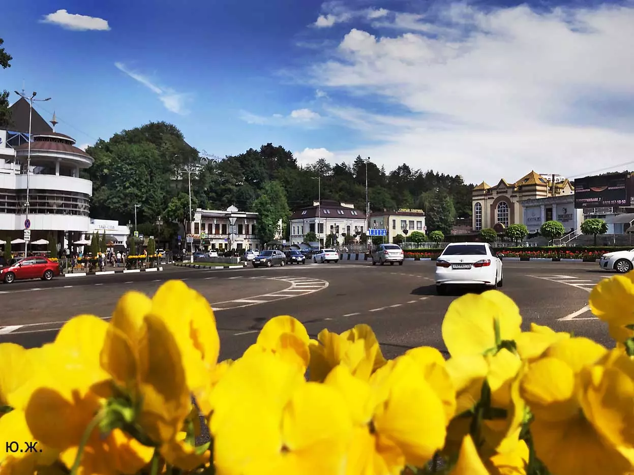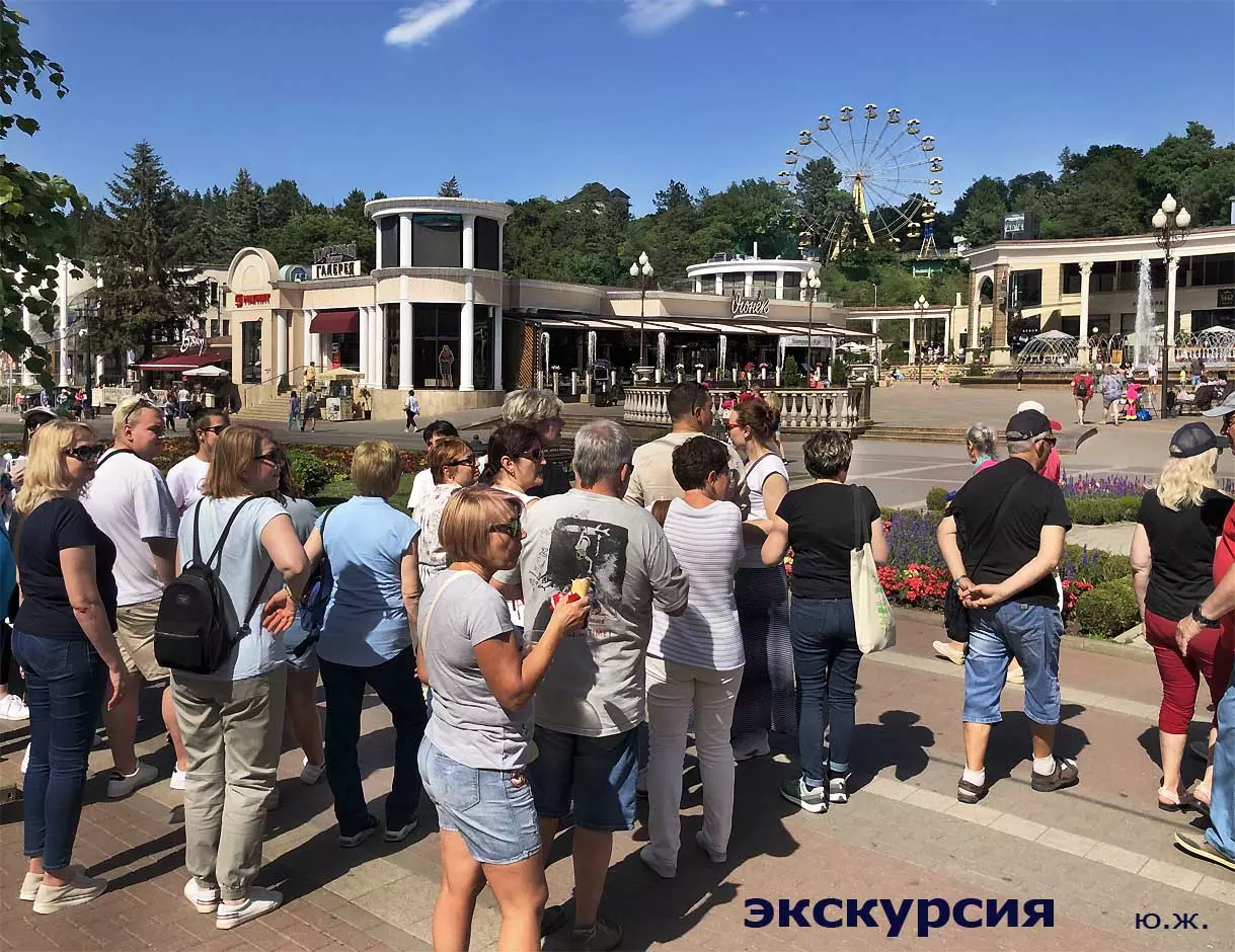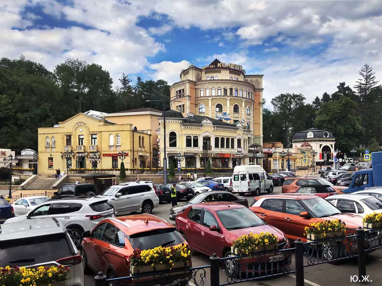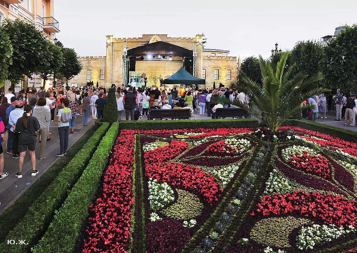 Вот уже и середина лета. Публика переходит на светлые наряды. Многочисленные фонтаны города работают по максиму, придавая настоянному на фитонцидах кисловодскому воздуху дополнительную свежесть — хотя и не все они работают. Очень эффектно смотрится комплекс Малой Каскадной лестницы. И высота струй, и подсветка. Набравшие полную мощь роскошные клумбы, особенно бисквитные, дарят фланирующим вдоль них отдыхающим и горожанам эстетическое удовольствие. Хорошо сейчас и в Национальном парке, и чем выше, тем лучше. Много людей на Красном Солнышке. Отсюда прекрасный обзор, почти круговые панорамы, еще свежее воздух… Апогей лета! Здесь стоит памятник Михаилу Юрьевичу Лермонтову.