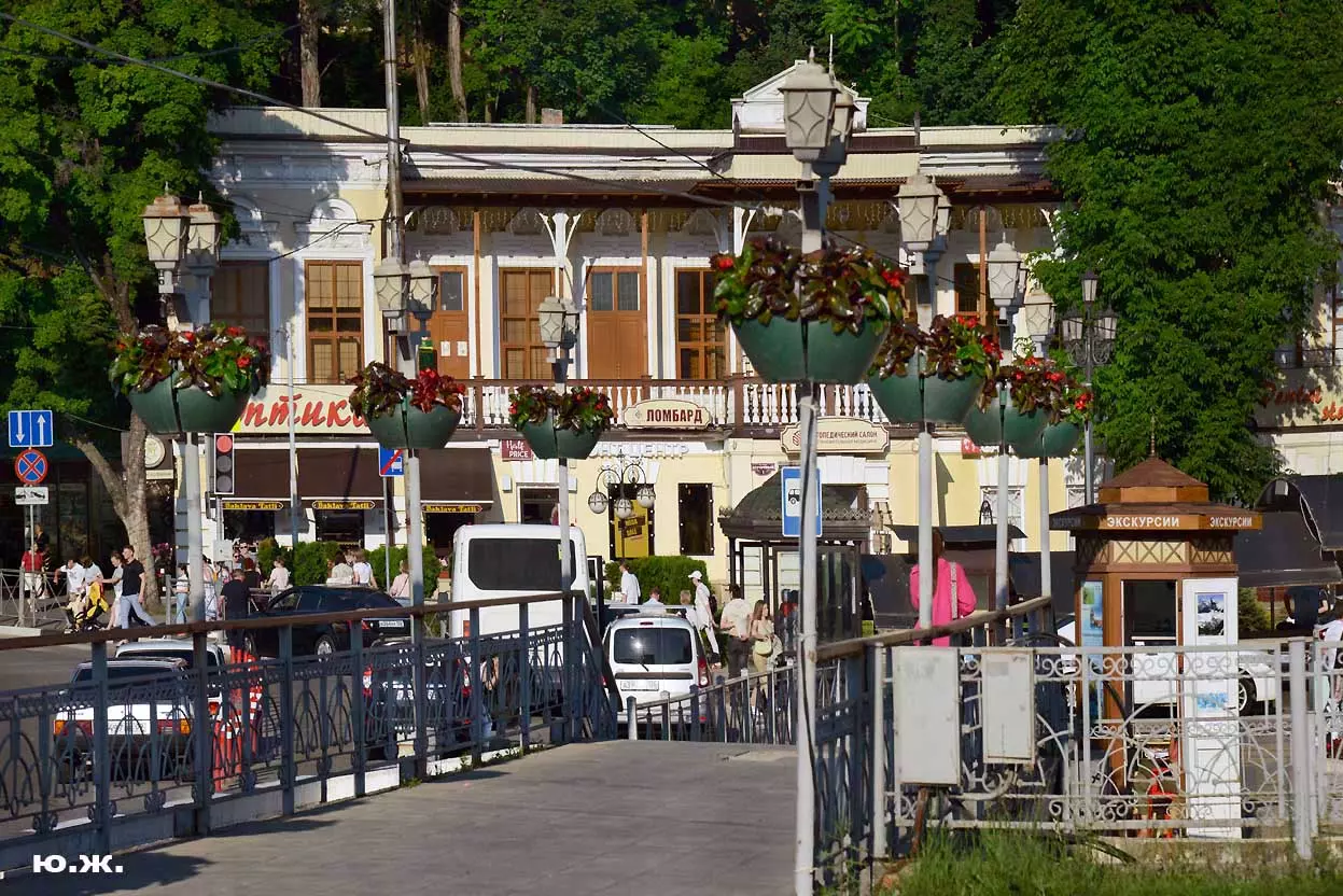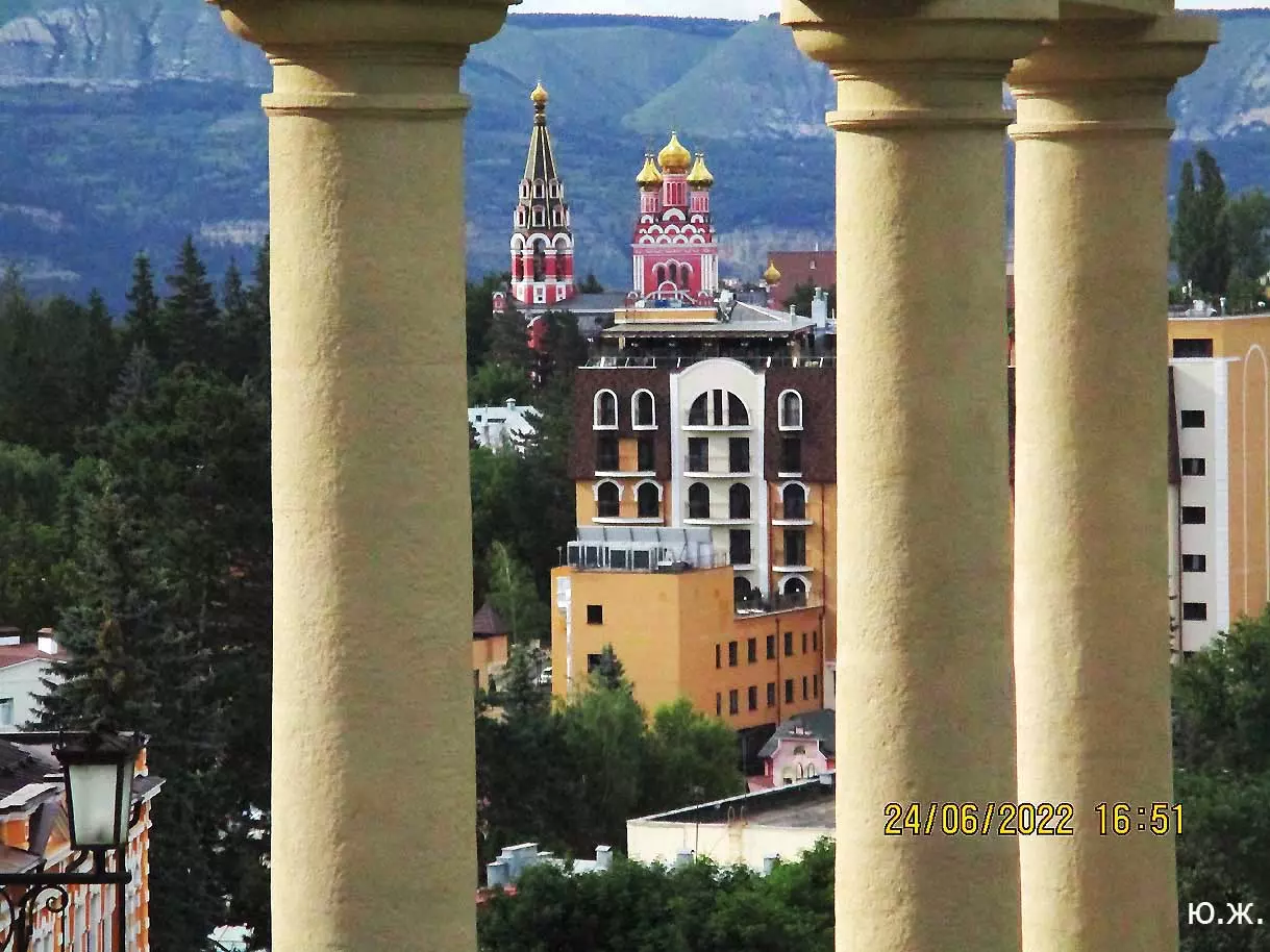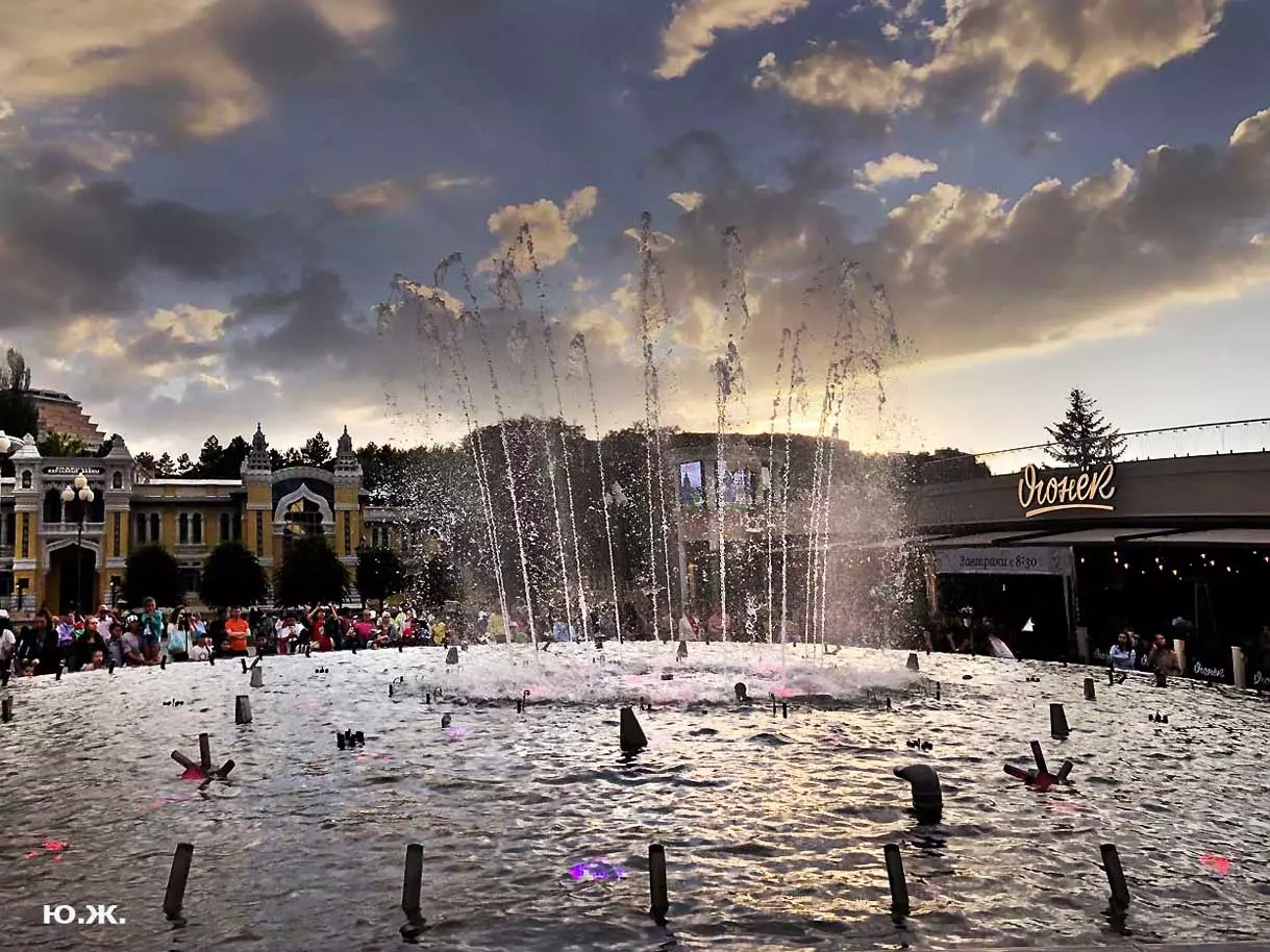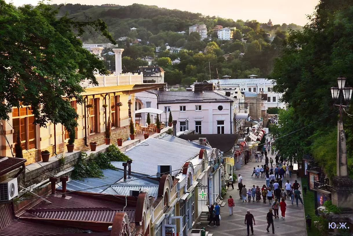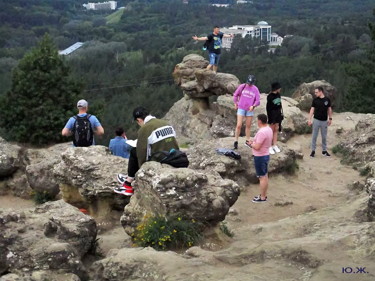 Вот уже и середина лета. Публика переходит на светлые наряды. Многочисленные фонтаны города работают по максиму, придавая настоянному на фитонцидах кисловодскому воздуху дополнительную свежесть — хотя и не все они работают. Очень эффектно смотрится комплекс Малой Каскадной лестницы. И высота струй, и подсветка. Набравшие полную мощь роскошные клумбы, особенно бисквитные, дарят фланирующим вдоль них отдыхающим и горожанам эстетическое удовольствие. Хорошо сейчас и в Национальном парке, и чем выше, тем лучше. Много людей на Красном Солнышке. Отсюда прекрасный обзор, почти круговые панорамы, еще свежее воздух… Апогей лета! Здесь стоит памятник Михаилу Юрьевичу Лермонтову.