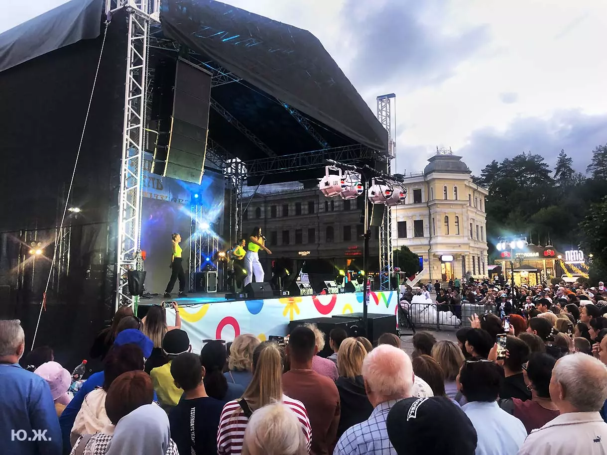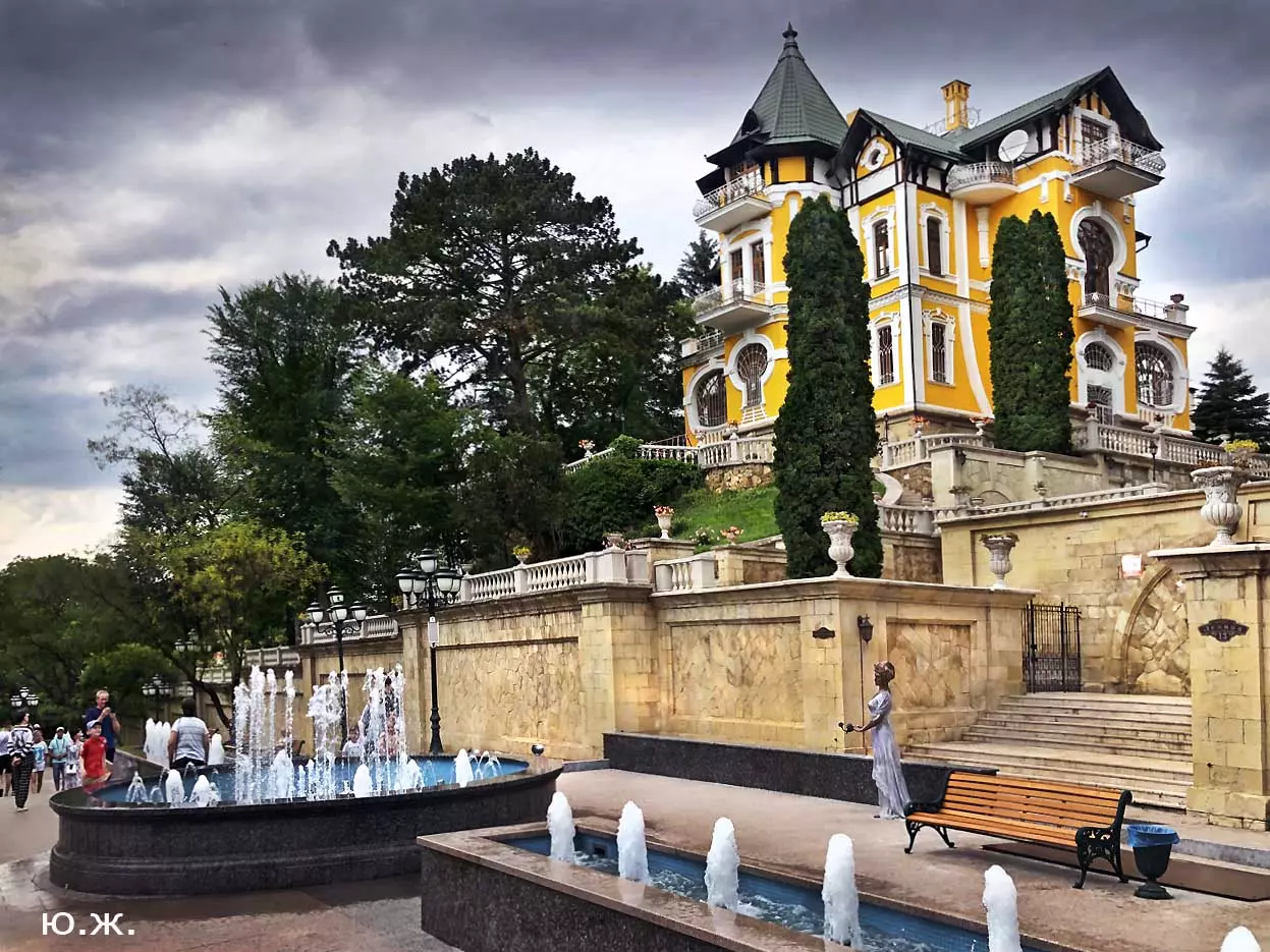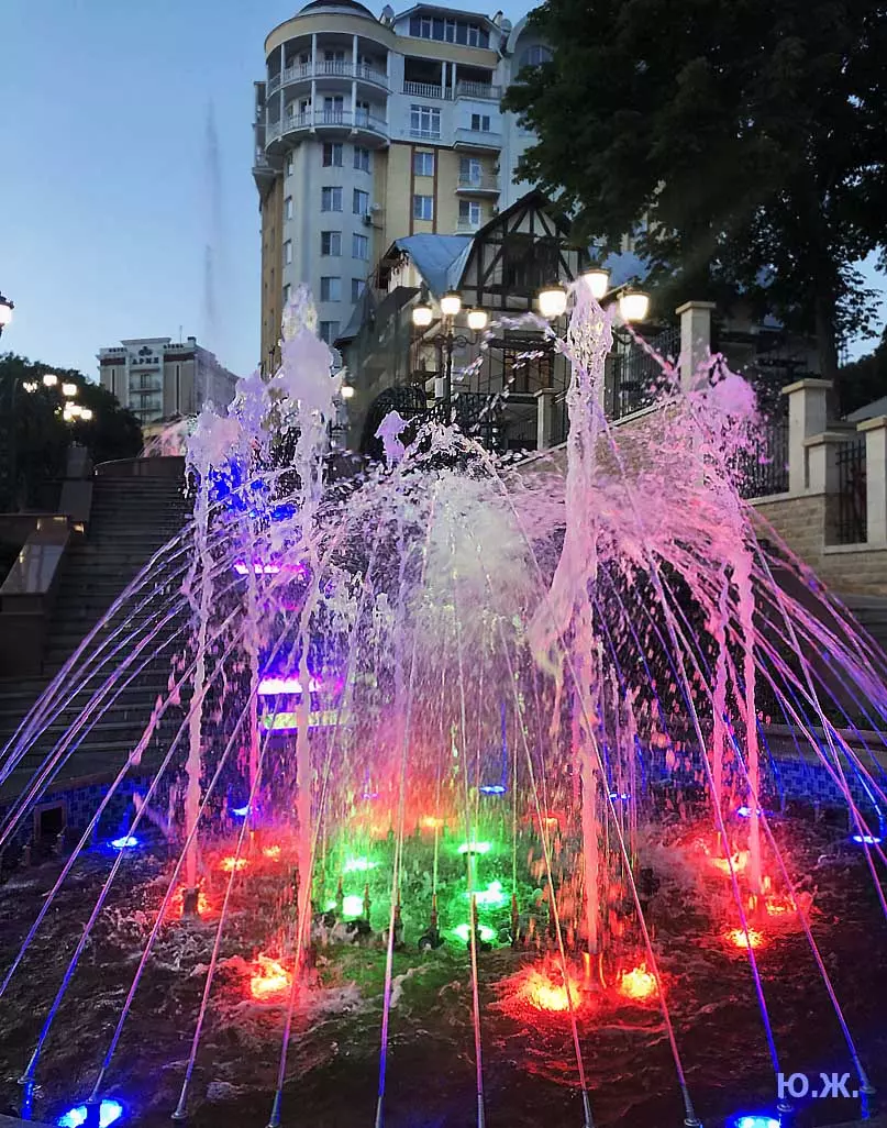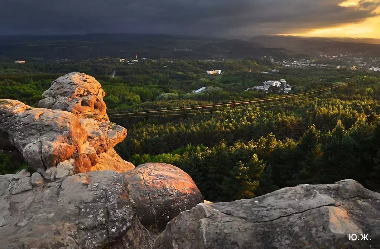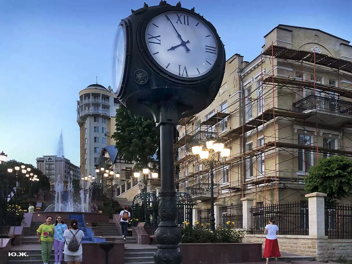 Вот уже и середина лета. Публика переходит на светлые наряды. Многочисленные фонтаны города работают по максиму, придавая настоянному на фитонцидах кисловодскому воздуху дополнительную свежесть — хотя и не все они работают. Очень эффектно смотрится комплекс Малой Каскадной лестницы. И высота струй, и подсветка. Набравшие полную мощь роскошные клумбы, особенно бисквитные, дарят фланирующим вдоль них отдыхающим и горожанам эстетическое удовольствие. Хорошо сейчас и в Национальном парке, и чем выше, тем лучше. Много людей на Красном Солнышке. Отсюда прекрасный обзор, почти круговые панорамы, еще свежее воздух… Апогей лета! Здесь стоит памятник Михаилу Юрьевичу Лермонтову.