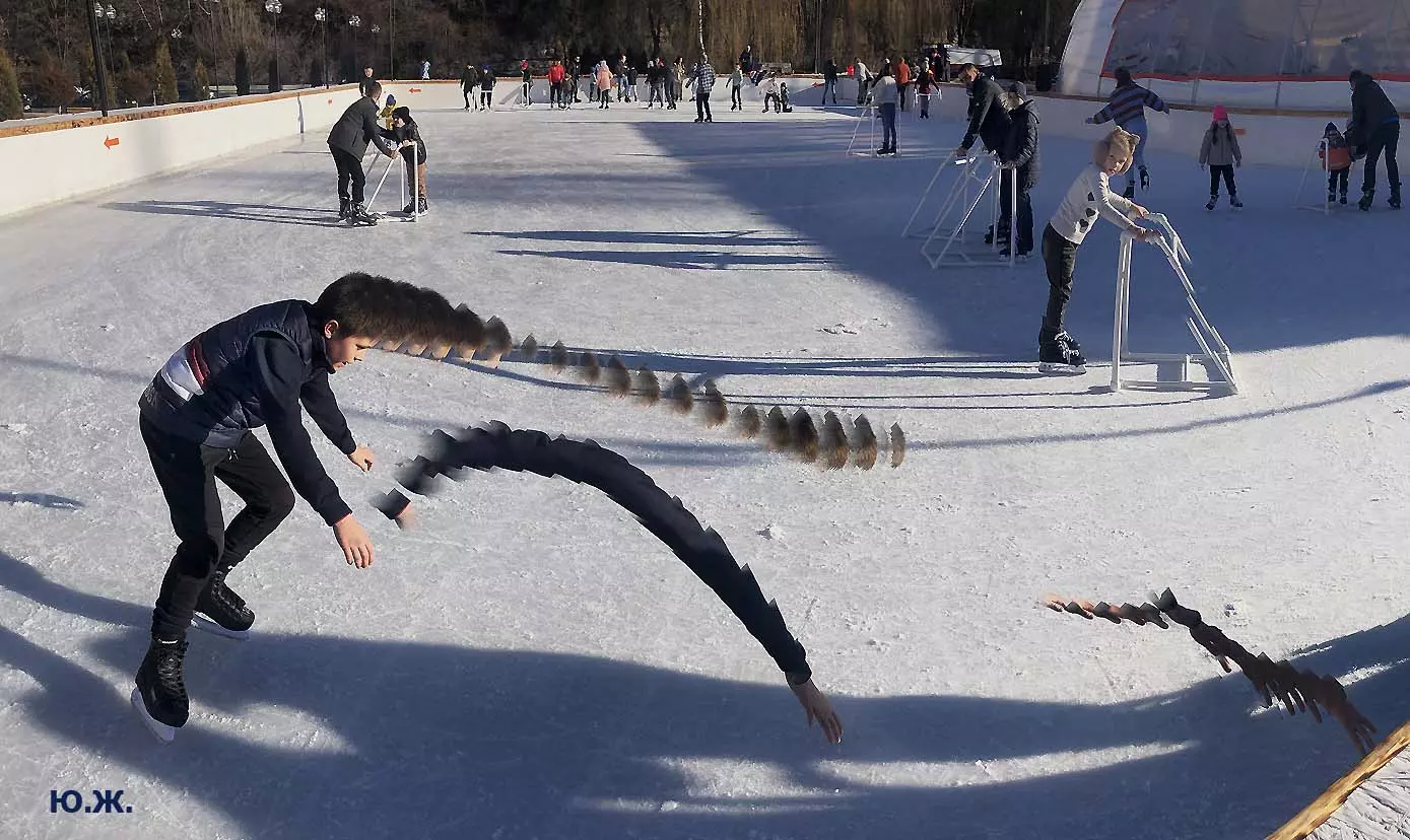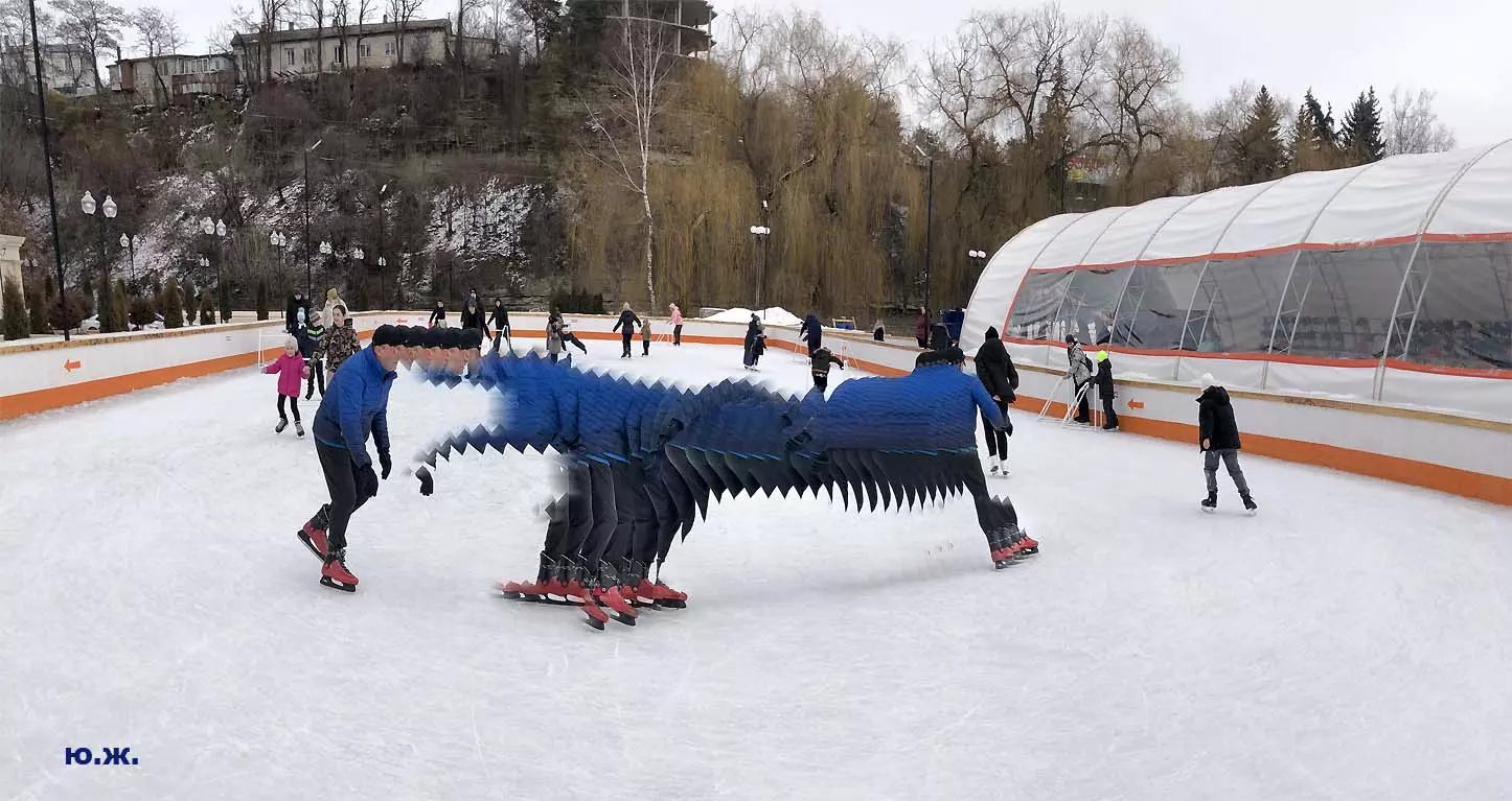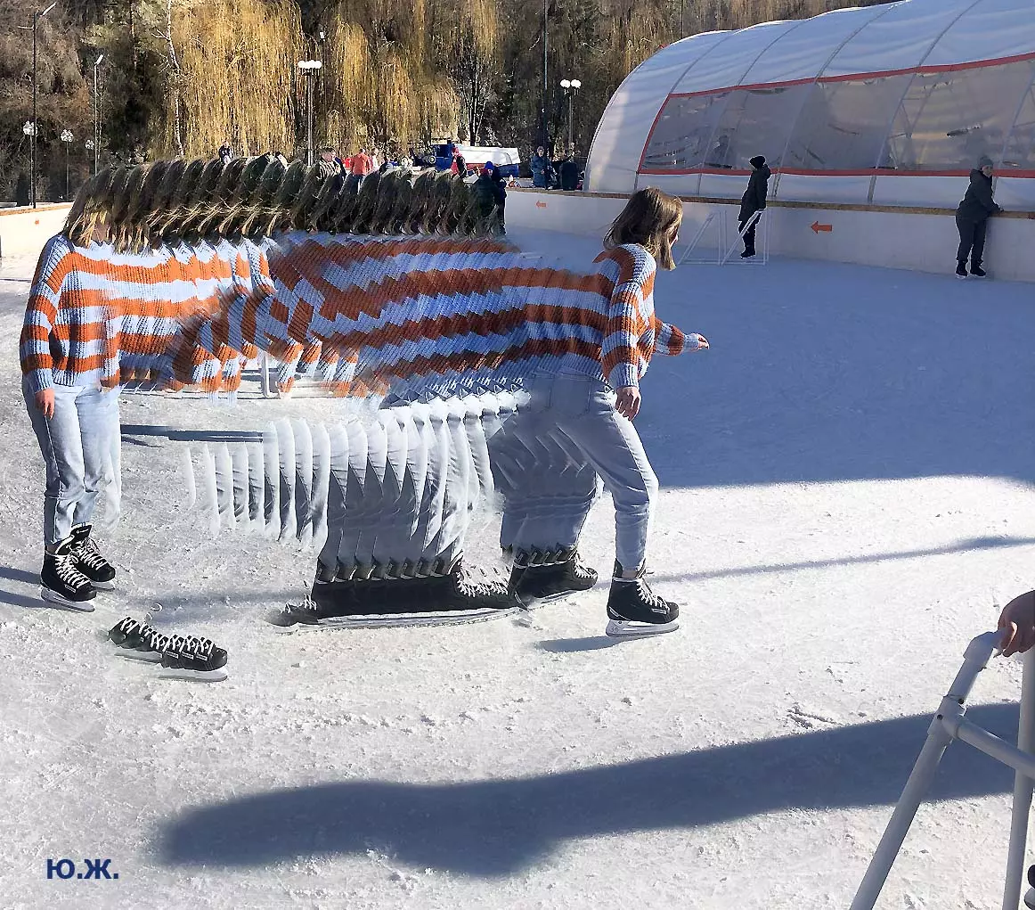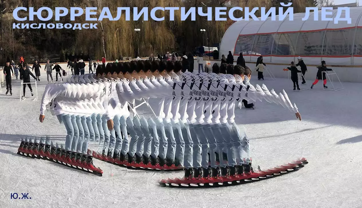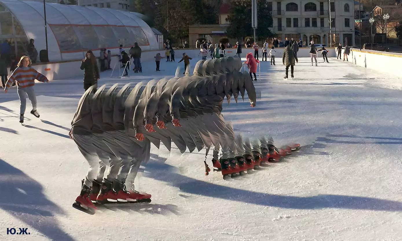 Это снова сюрреализм, уже зимний, на ледяном катке. У нас уже есть в альбомах сюрреализм марафонцев, парковых электрокаров, просто прогулок по Курортному бульвару, скачек крылатых коней — оказывается хорошо ложатся на длительную экспозицию и лед, и коньки… Жаль, что скорости катания довольно медленны, конькобежцы еще не набрали форму.