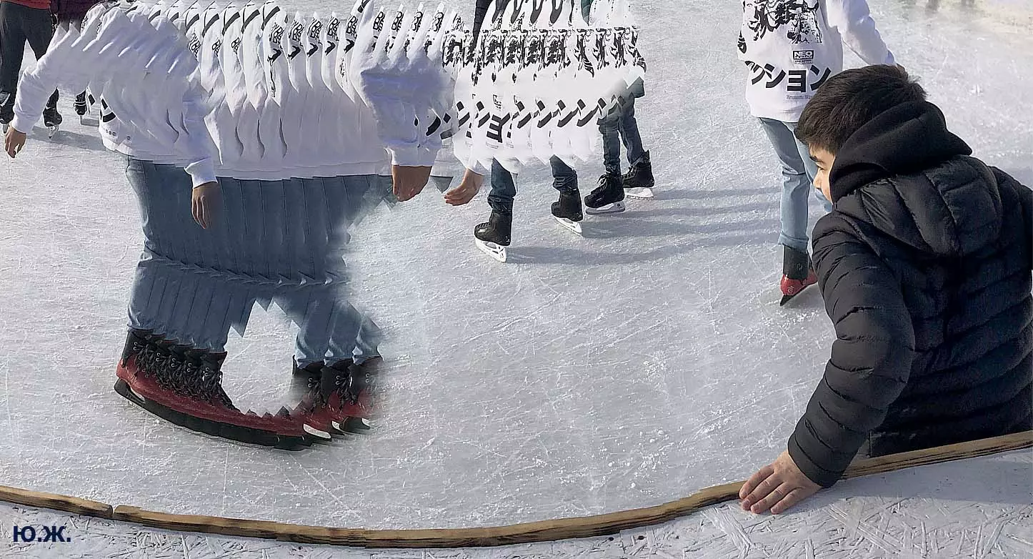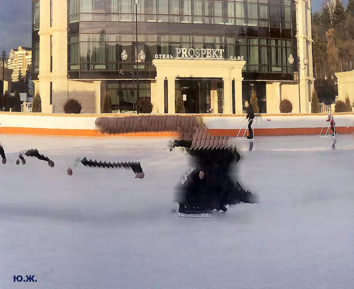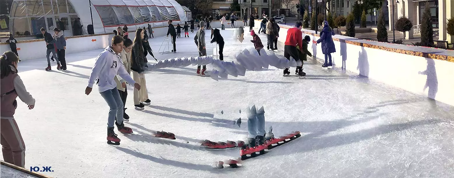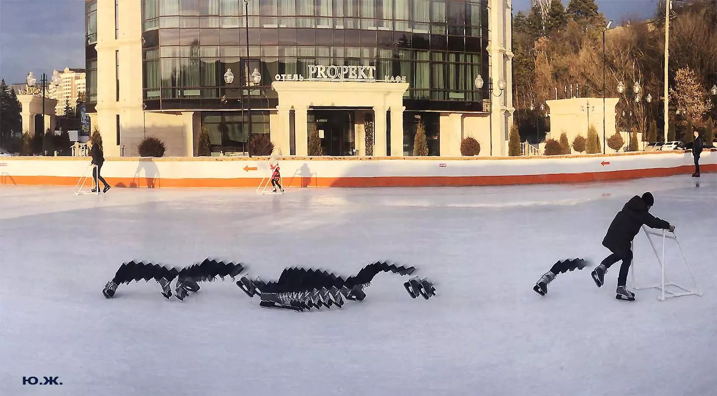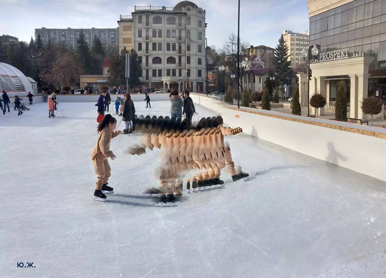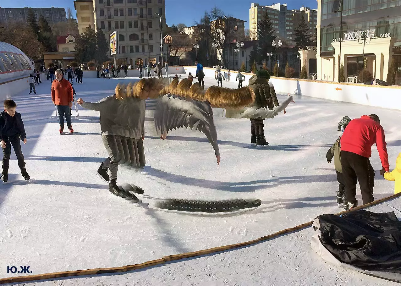 Это снова сюрреализм, уже зимний, на ледяном катке. У нас уже есть в альбомах сюрреализм марафонцев, парковых электрокаров, просто прогулок по Курортному бульвару, скачек крылатых коней — оказывается хорошо ложатся на длительную экспозицию и лед, и коньки… Жаль, что скорости катания довольно медленны, конькобежцы еще не набрали форму.
