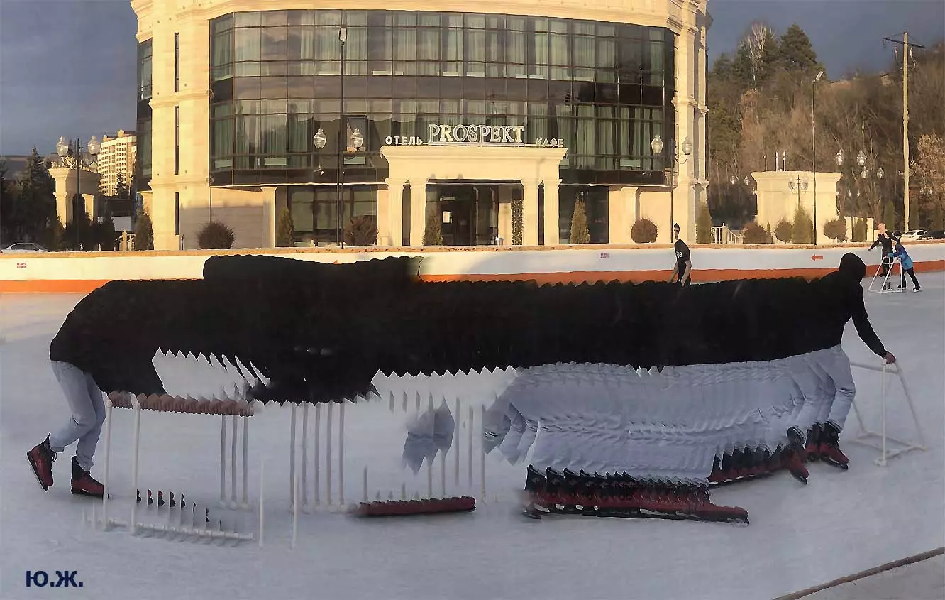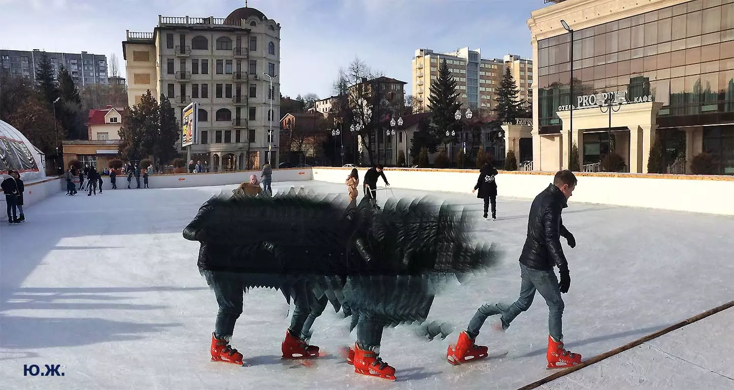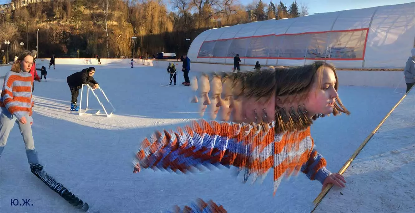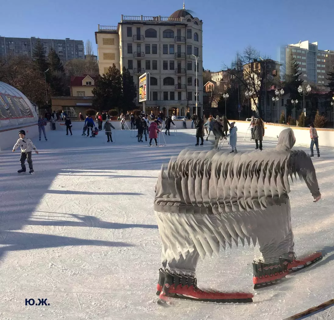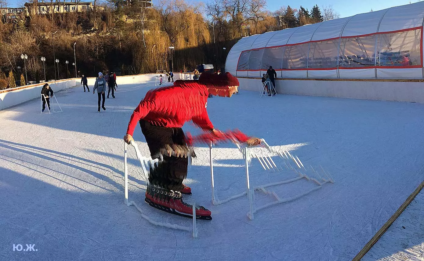 Это снова сюрреализм, уже зимний, на ледяном катке. У нас уже есть в альбомах сюрреализм марафонцев, парковых электрокаров, просто прогулок по Курортному бульвару, скачек крылатых коней — оказывается хорошо ложатся на длительную экспозицию и лед, и коньки… Жаль, что скорости катания довольно медленны, конькобежцы еще не набрали форму.