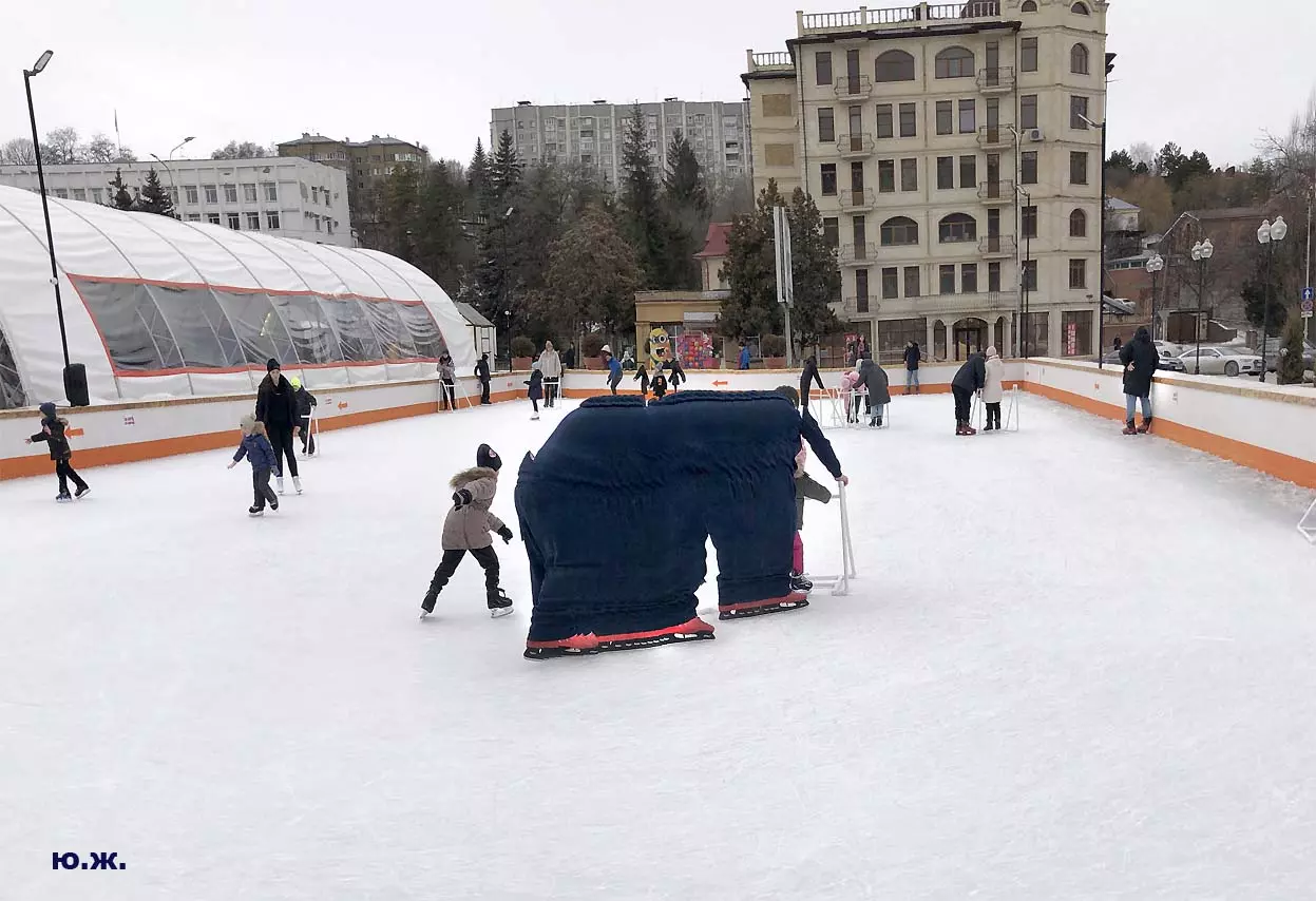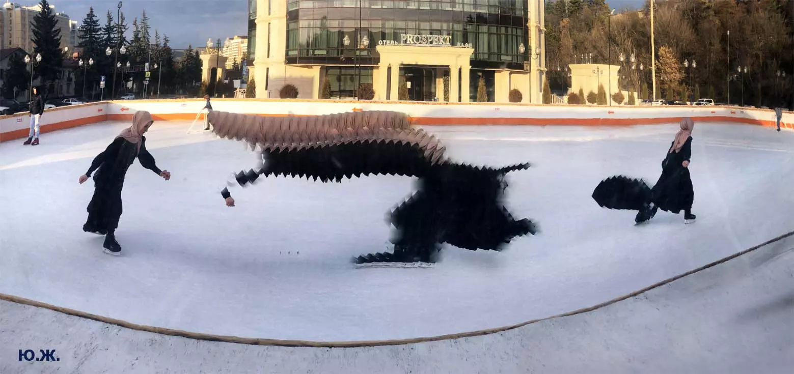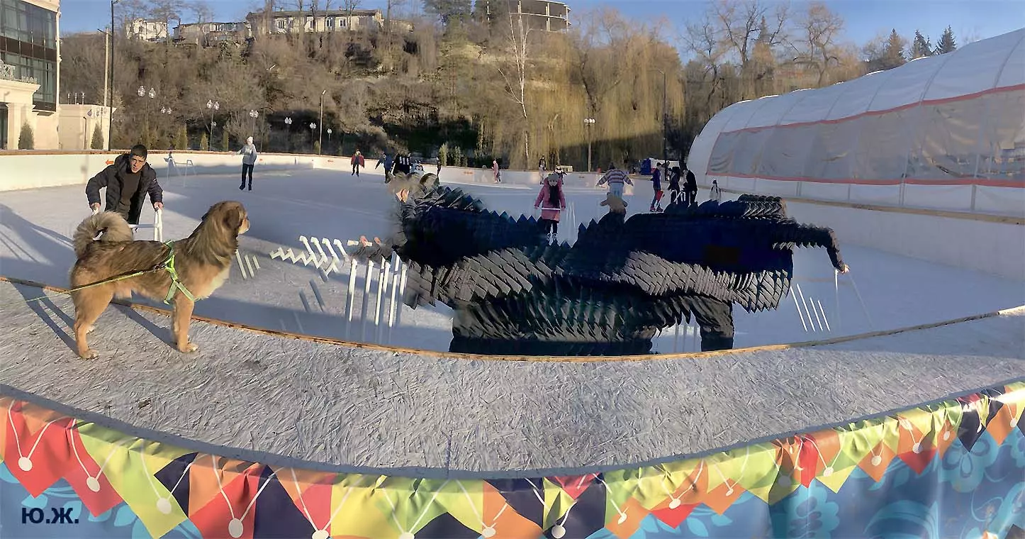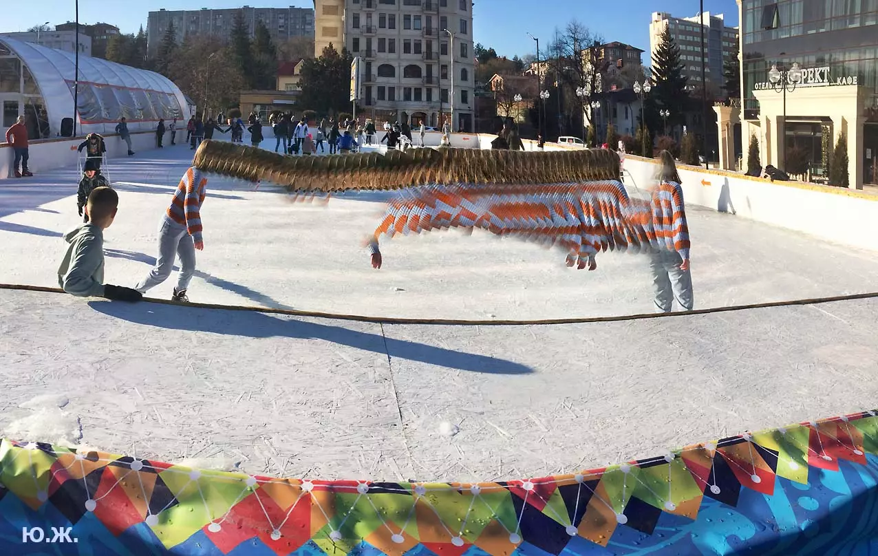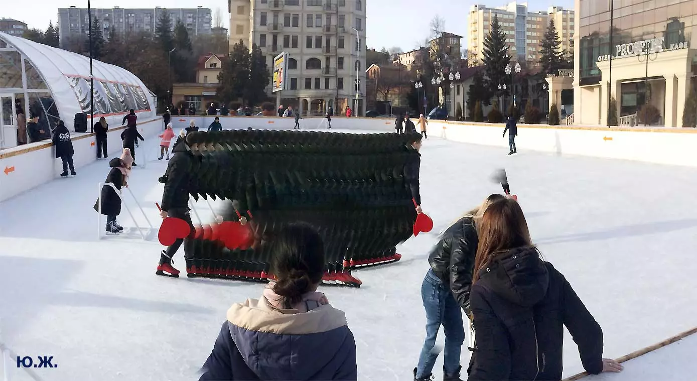 Это снова сюрреализм, уже зимний, на ледяном катке. У нас уже есть в альбомах сюрреализм марафонцев, парковых электрокаров, просто прогулок по Курортному бульвару, скачек крылатых коней — оказывается хорошо ложатся на длительную экспозицию и лед, и коньки… Жаль, что скорости катания довольно медленны, конькобежцы еще не набрали форму.