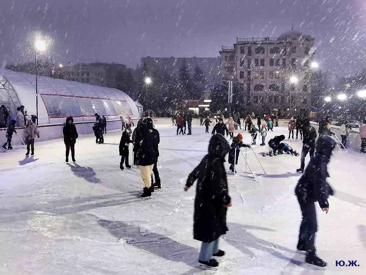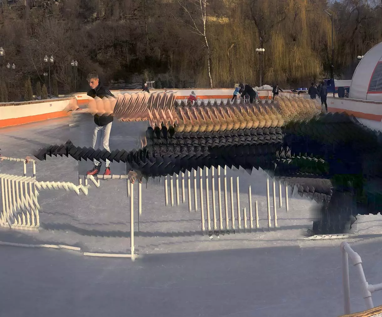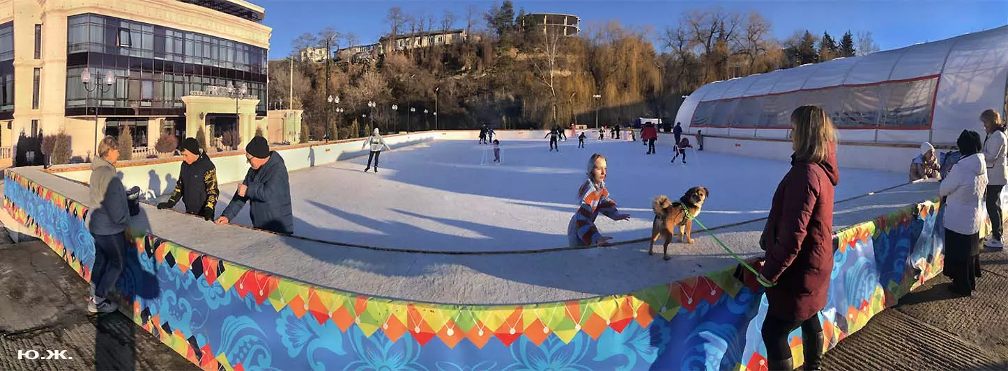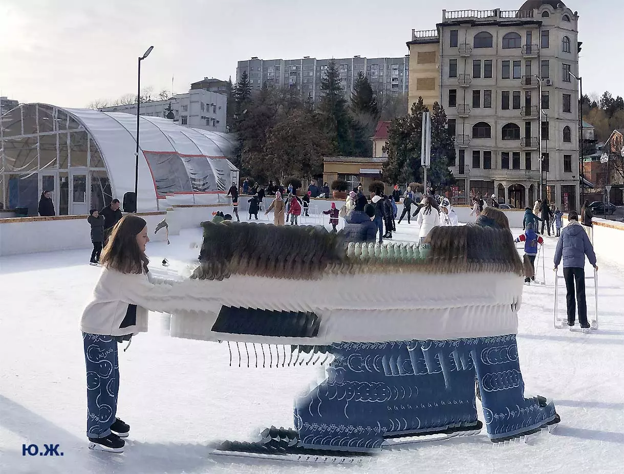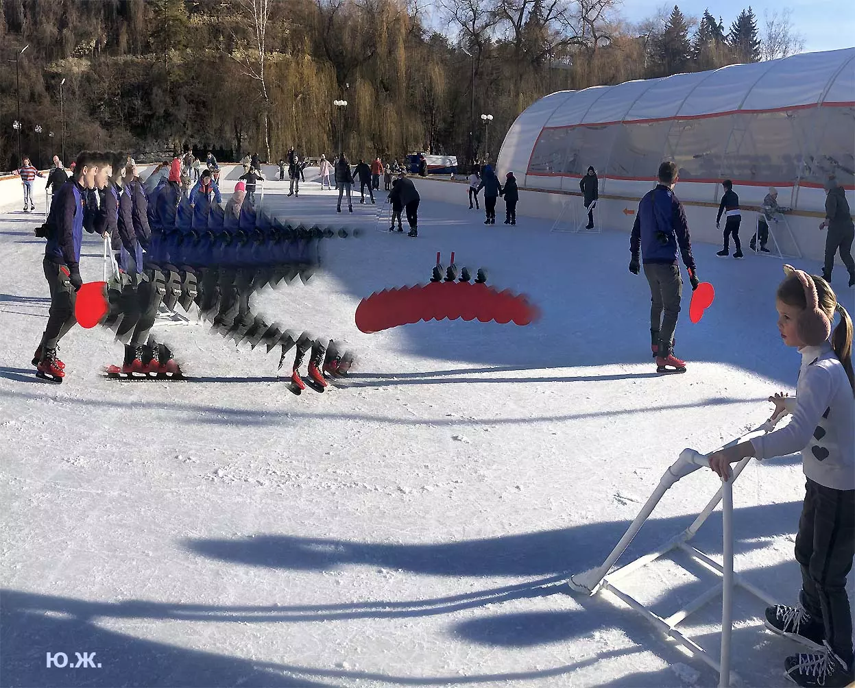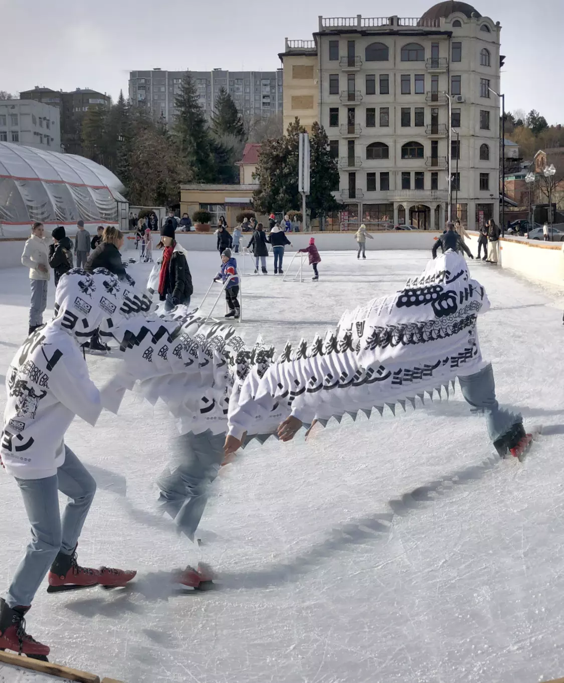 Это снова сюрреализм, уже зимний, на ледяном катке. У нас уже есть в альбомах сюрреализм марафонцев, парковых электрокаров, просто прогулок по Курортному бульвару, скачек крылатых коней — оказывается хорошо ложатся на длительную экспозицию и лед, и коньки… Жаль, что скорости катания довольно медленны, конькобежцы еще не набрали форму.