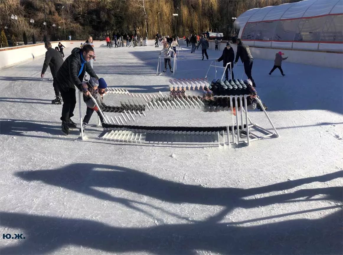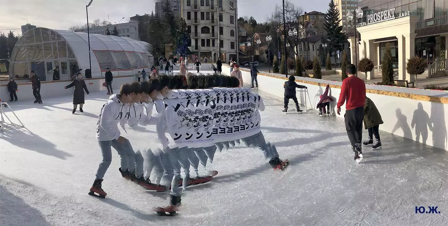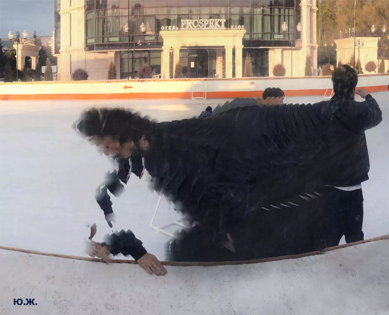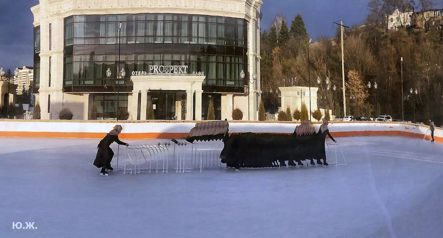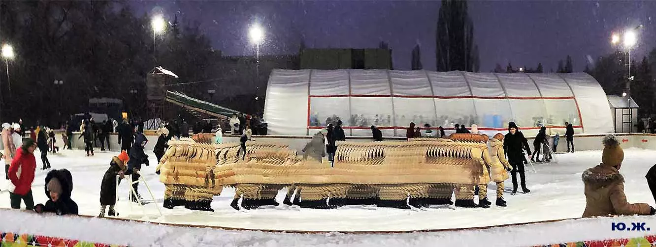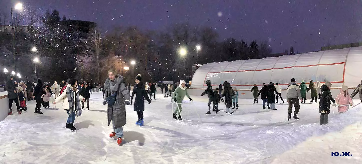 Это снова сюрреализм, уже зимний, на ледяном катке. У нас уже есть в альбомах сюрреализм марафонцев, парковых электрокаров, просто прогулок по Курортному бульвару, скачек крылатых коней — оказывается хорошо ложатся на длительную экспозицию и лед, и коньки… Жаль, что скорости катания довольно медленны, конькобежцы еще не набрали форму.