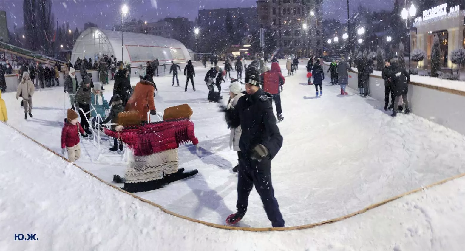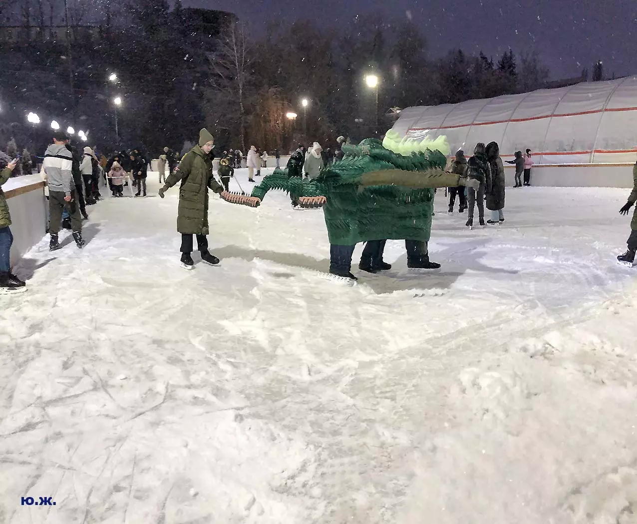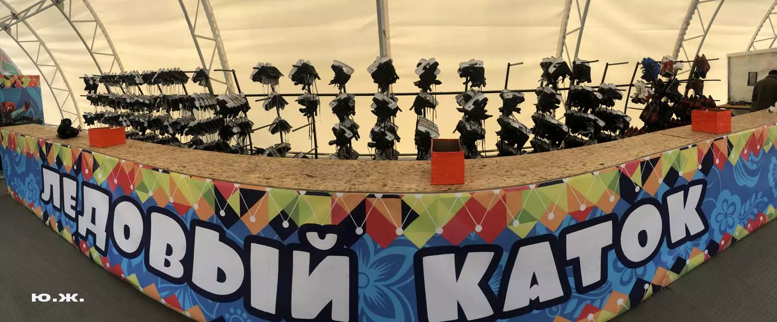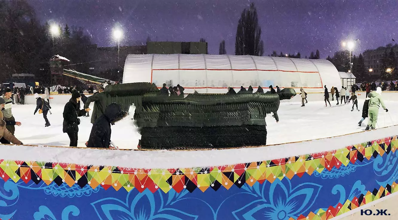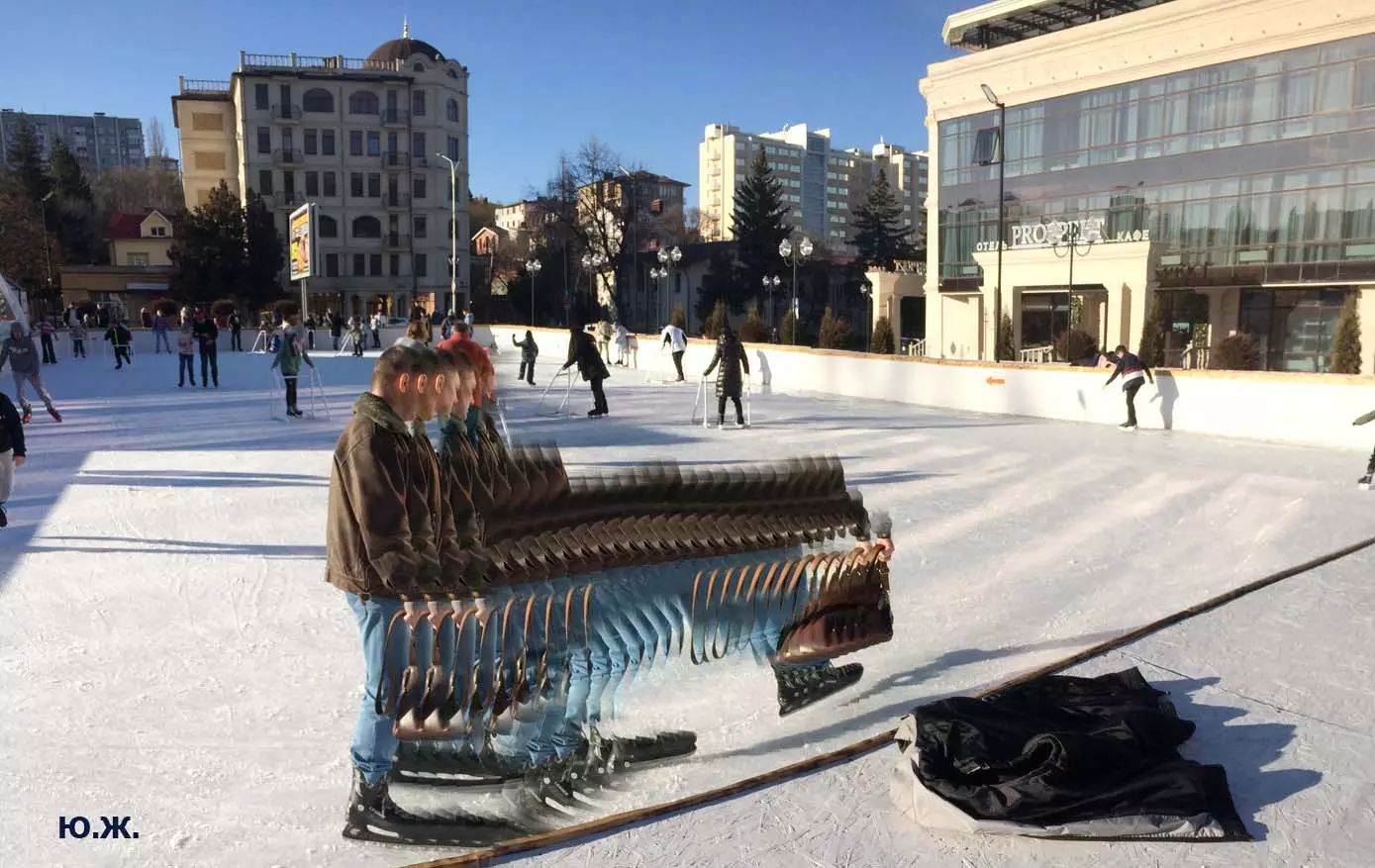 Это снова сюрреализм, уже зимний, на ледяном катке. У нас уже есть в альбомах сюрреализм марафонцев, парковых электрокаров, просто прогулок по Курортному бульвару, скачек крылатых коней — оказывается хорошо ложатся на длительную экспозицию и лед, и коньки… Жаль, что скорости катания довольно медленны, конькобежцы еще не набрали форму.