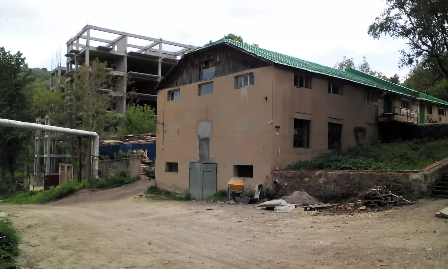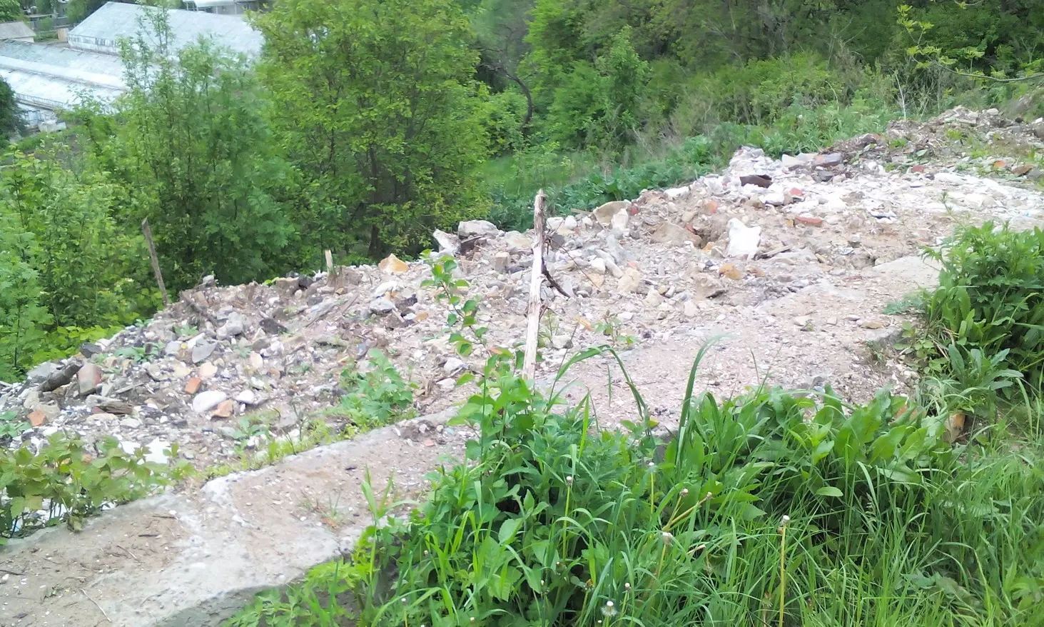 В остальном – все та же крайне нелицеприятная картина. Уродливые задворки санатория им. Г.К. Орджоникидзе, администрацию которого, похоже, не беспокоит не только то, что за забором, но даже и внешняя сторона этого самого забора. Склон горы под оградой санатория в одном месте просто усеян битым оконным (а не бутылочным!) стеклом! Так что списать появление этого мусора на какие-то компании любителей выпить на природе трудно. По-прежнему «украшают» маршрут уродливые трубы теплоснабжения санатория, открытый колодец ливневой канализации, также санаторной, многочисленные свалки строительного мусора на обочине дороги. Добавляет «эстетизма» великовозрастный объект незавершенного строительства (то ли несостоявшийся отель, то ли пансионат) с нашедшими там приют бездомными собаками, мимо которого вынуждены проходить желающие насладиться красотами знаменитого кисловодского парка. Нелегок путь к прекрасному! По всему видно!