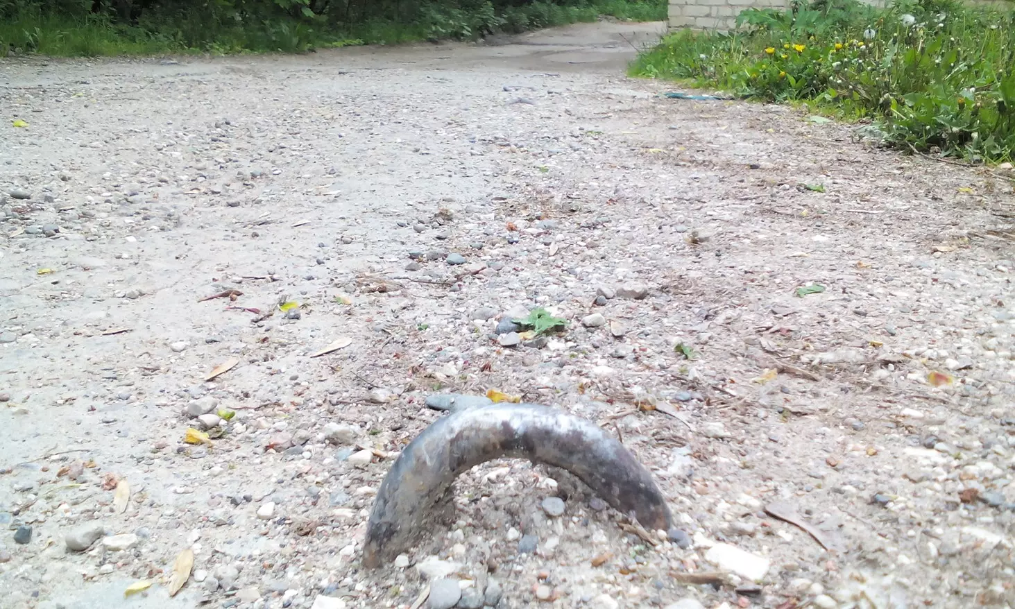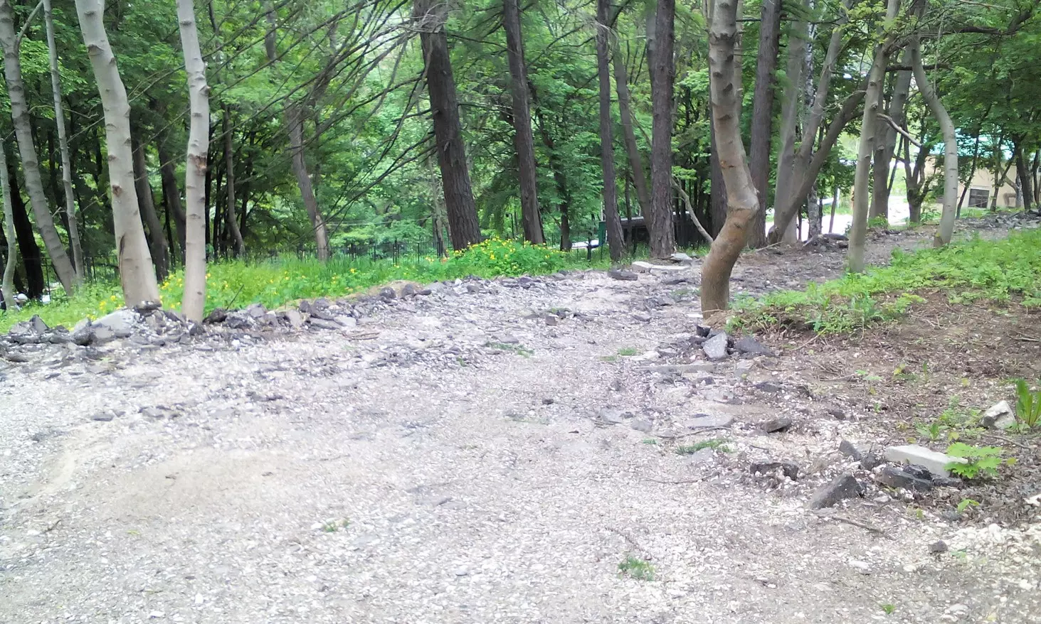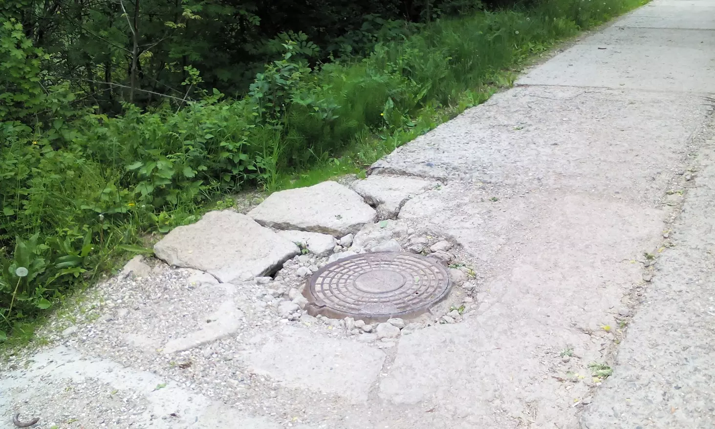 Вторая половина пути к прекрасному – это уже не пешеходная дорожка, а вполне себе дорога, используемая служебным транспортом, вероятно, санатория и парка. Тротуаров здесь не было и не предвидится, так что любители прогулок в парке должны вовремя прятаться от летящего на них грузовика, заранее выбрав место временной дислокации в кустах (больше-то прятаться некуда, тротуаров нет!). При этом надо еще и внимательнейшим образом глядеть под ноги. Дорога чрезвычайно разбита, а на одном из участков дороги, из бетонных плит торчат, как и полтора года назад, металлические «уши».