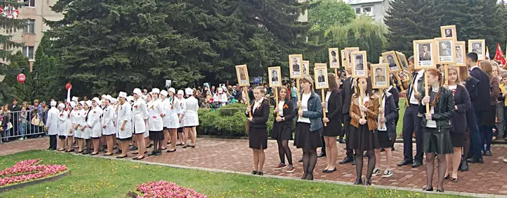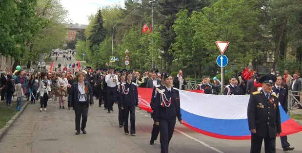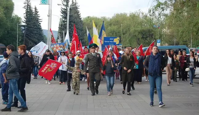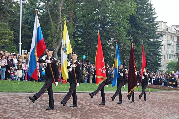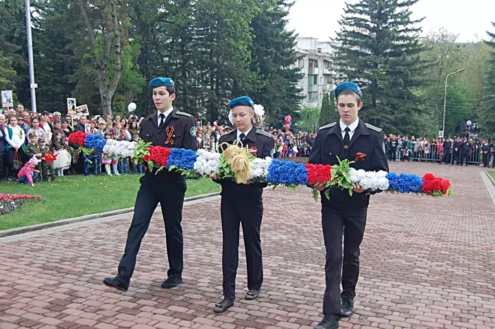 Более семи тысяч человек прошли по городу в колонне Бессмертного полка с портретами своих близких, участников Великой отечественной войны, не доживших до этого дня. Студенты, школьники, казаки, спортсмены, коллективы санаториев, городских организаций прошли плечом к плечу в этих рядах, впереди по традиции — руководители города, депутатский корпус, заместитель председателя Правительства СК Роман Петрашов, депутат думы СК Аркадий Торосян. На протяжении всего маршрута, пролегавшего от проспекта Победы до мемориала на улице Цандера, жители города — дети, молодежь, пожилые люди — восторженно встречали колонну, возглавляемую тремя стилизованными военными УАЗами с ветеранами и знаменными группами. Под песню «Бессмертный полк» шествие подошло к мемориалу, где состоялся торжественный митинг, посвященный 72-й годовщине Победы в Великой Отечественной войне. Сопровождающий митинг военный ритуал, каждый шаг, каждое движение которого отточены до мельчайших деталей, прошел в полном соответствии традициям. Около Вечного огня свое место занял почетный караул. Знаменная группа медленно внесла флаги РФ и Ставропольского края, легендарное Знамя Победы, флаг города-курорта Кисловодска, Знамя освобожденного от фашистских захватчиков Кисловодска 1943 года и историческое знамя города, на которое в 1980 году был приколот Орден Отечественной войны I степени. Высокую награду Кисловодск получил как город-госпиталь, который вернул в строй более 600 тысяч раненных солдат и офицеров. Студенты Кисловодского медицинского колледжа Минздрава СК в белоснежных халатах внесли историческое знамя Военных медиков.