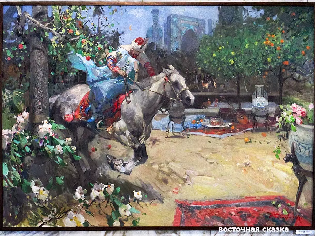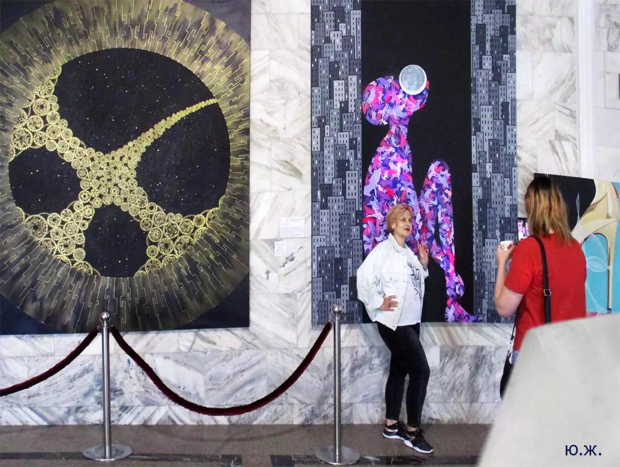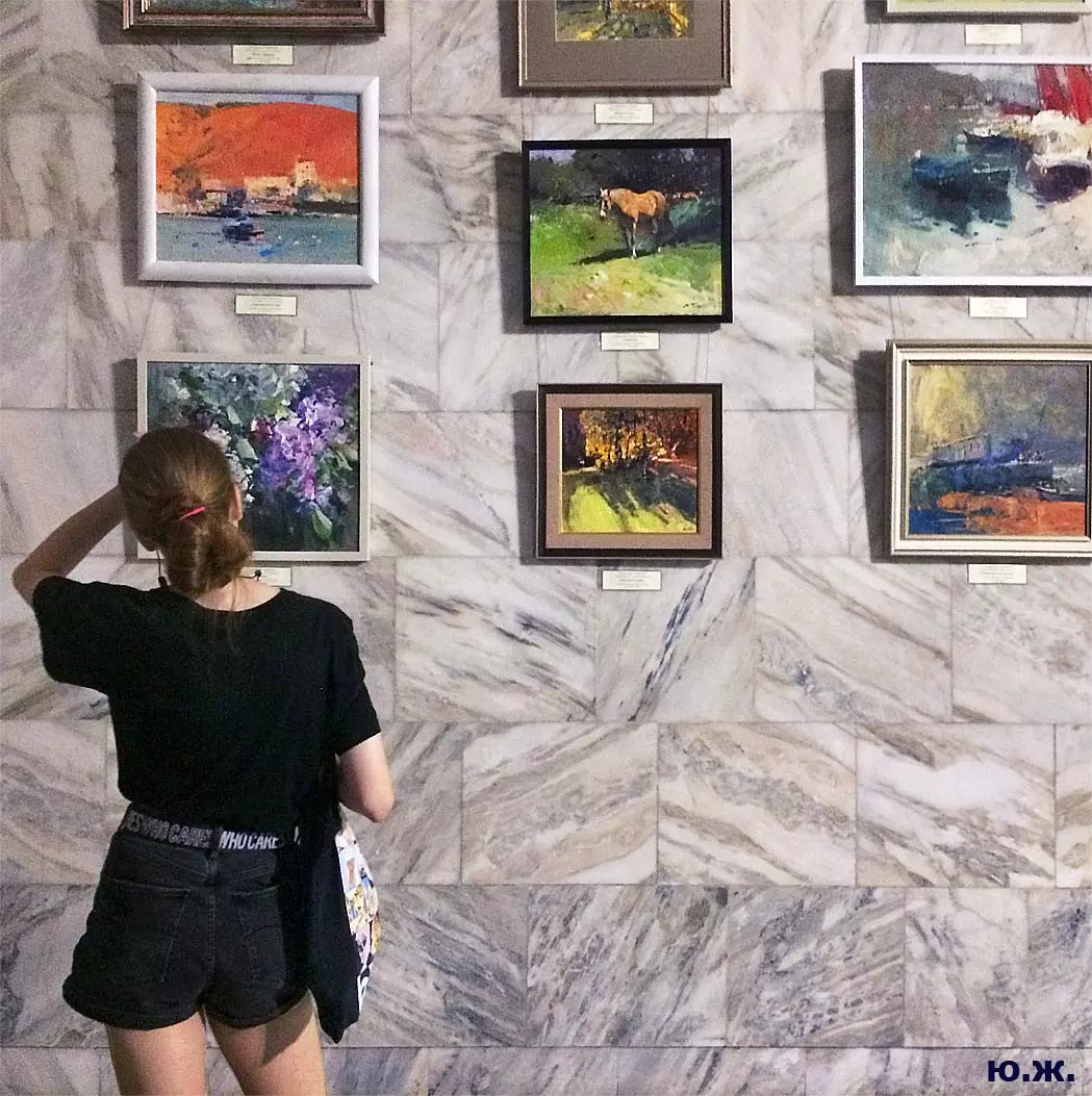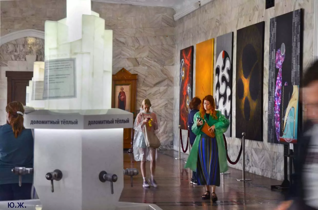 Зато мы увидели две прекрасные выставки живописи. Первая выставка была под эгидой Министерства культуры — это были крупные работы, как раз для такого прекрасного зала, как Нарзанная галерея. Бесполезно их описывать, это нужно было видеть и наслаждаться. Смотрите фоторепродукции работ и как они были представлены в зале.