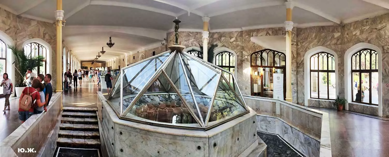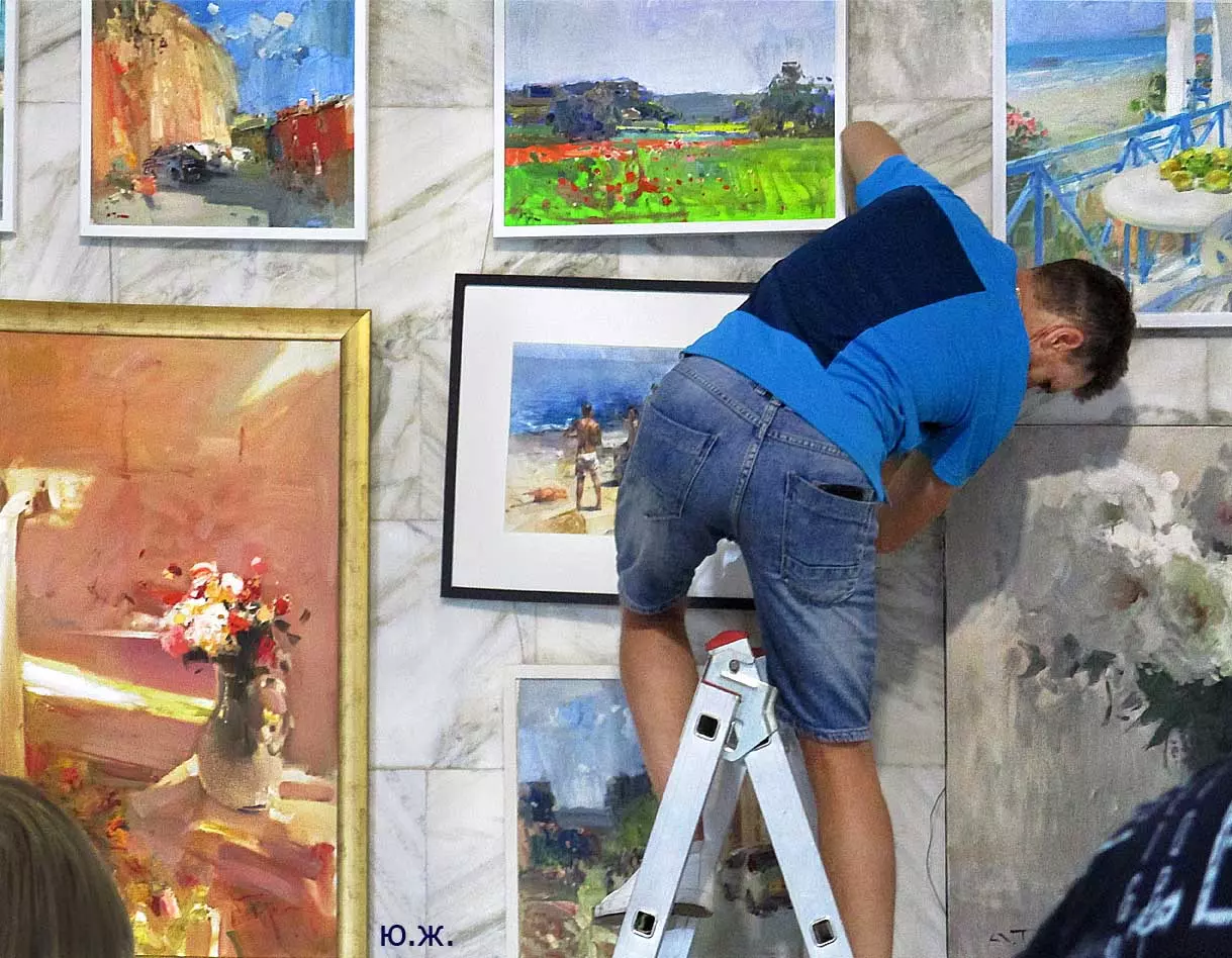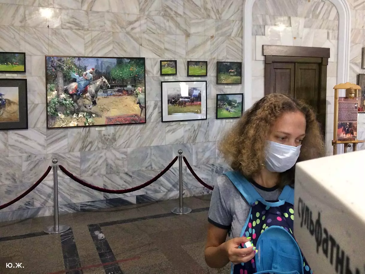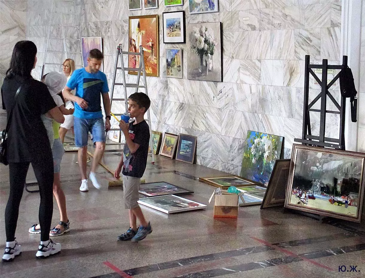 Зато мы увидели две прекрасные выставки живописи. Первая выставка была под эгидой Министерства культуры — это были крупные работы, как раз для такого прекрасного зала, как Нарзанная галерея. Бесполезно их описывать, это нужно было видеть и наслаждаться. Смотрите фоторепродукции работ и как они были представлены в зале.