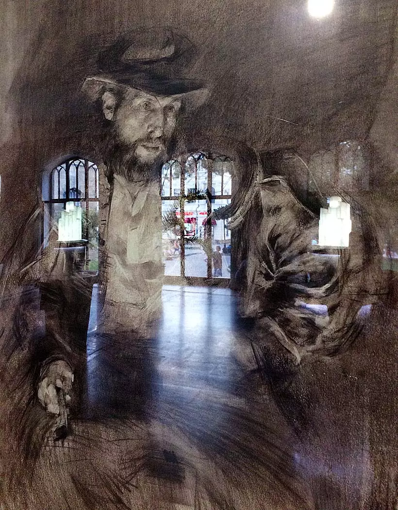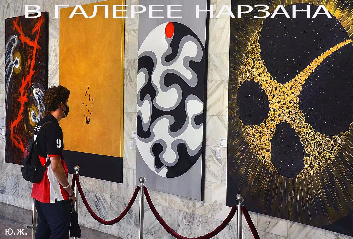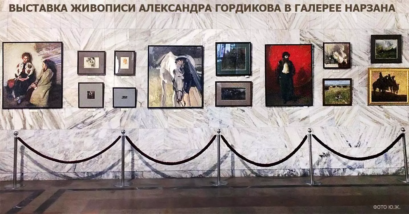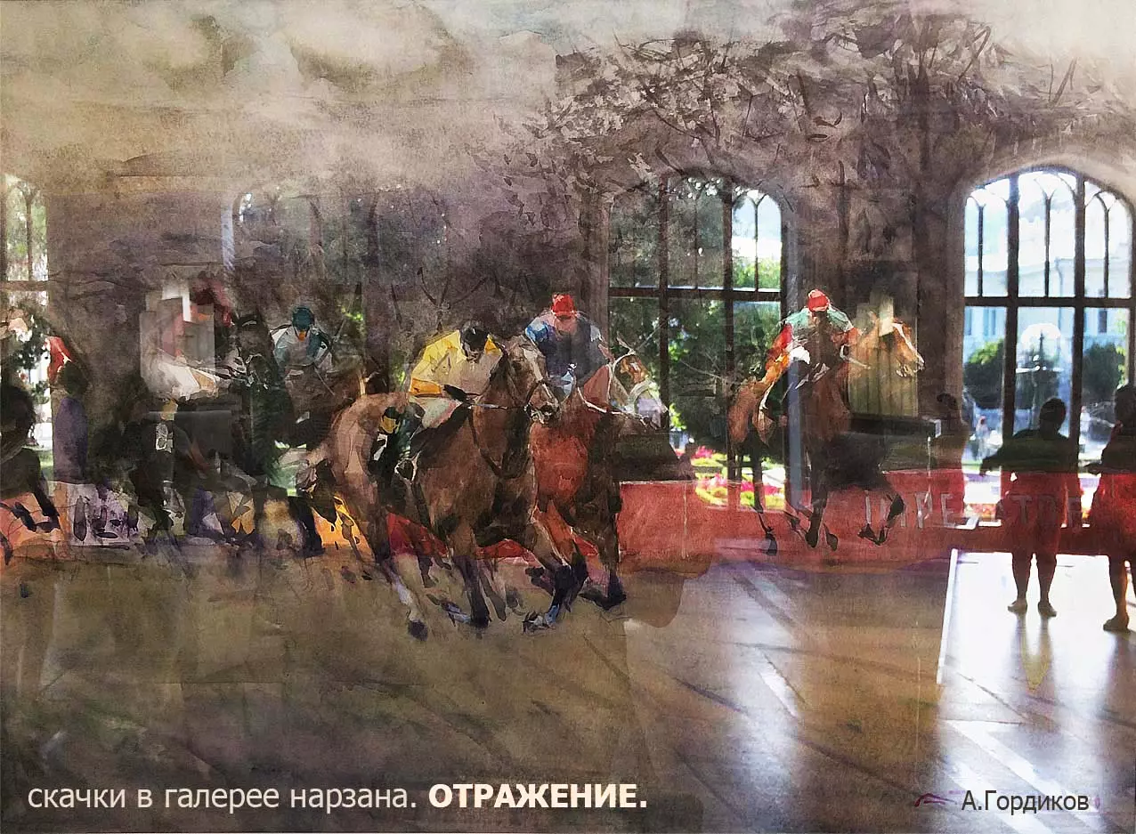Вторая выставка, которая и сейчас экспонируется в этом же зале, показывает очень интересную и талантливую живопись. Ее автор Александр Гордиков, молодой и мощный художник. Приходите, не спеша дегустируя богатырский напиток Нарзан, рассматривайте работы, их довольно много. Некоторые работы под стеклом (акварель, гуашь и т.п.), к сожалению, очень сильно бликуют, отражая красивые стрельчатые окна напротив. Такова особенность этого выставочного зала. Но здесь есть и плюс: на нескольких фотографиях обыграно отражение — например, ипподромный снимок создает иллюзию, что скачка проходит в Нарзанной галерее, или портрет мужчины…