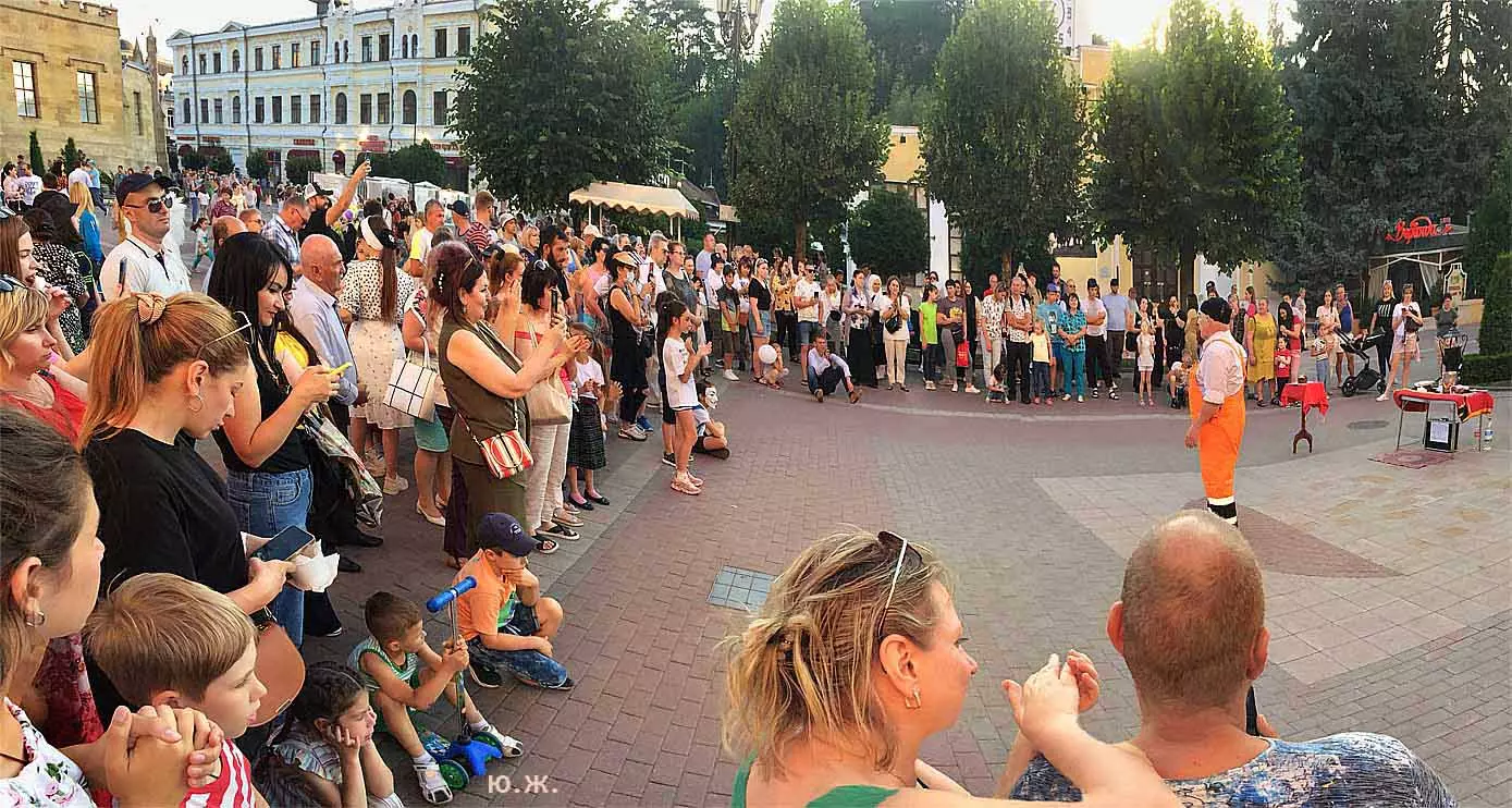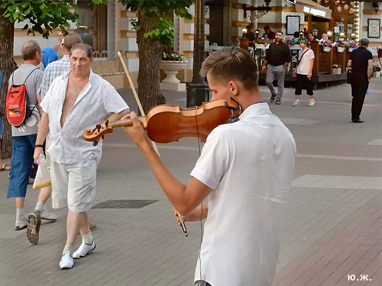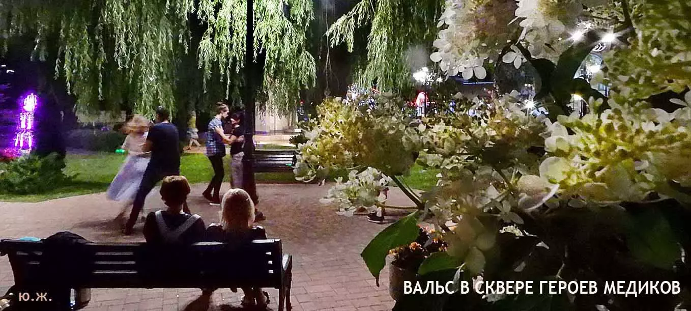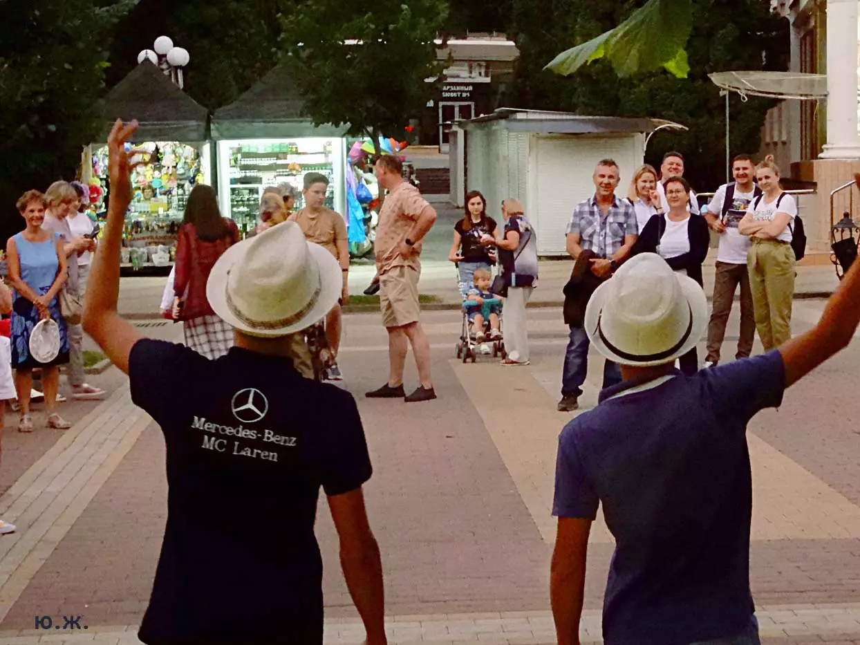 К нам приезжают, прилетают в разгар курортного сезона всегда, а в этот год особенно, разные творческие люди: шпагоглотатели, фокусники, люди лежащие на досках с длинными гвоздями, извергающие изо рта огонь, скрипачи, аккордеонисты, ребята с прекрасными, поставленными голосами, исполняющие и неаполитанские песни и «первым делом, первым делом самолеты…»,- я не спец, но по моему, ребята делают это здорово. Здесь много тех, кто выбрал пение, танцы, саксофон, встречал и губную гармонь… Думаю, добрая половина из них — наши, кисловодчане, очень много среди них совсем юных. Мне кажется очень позитивным, что ребята в наше трудное время ищут себя, пробуют в самом разном деле, зарабатывают какие то деньги, познают как они достаются. Это существует во всем мире, даже президенты и другие, сделавшие себя сами, известные люди в своих мемуарах описывают как в детстве и юношестве зарабатывали себе, например, продавая газеты, исполняя, если бог дал им этот талант, песни, и многие другие увлечения. У нас, в основном, никакой навязчивости не встречается. Сейчас, в сезон, когда в центре так много отдыхающих и в кафе, и в торговле сувенирами, и других подобных местах, везде нужна помощь, нужны молодые люди, которые могут привлекаться к такому бизнесу, только нужно быть справедливым к ребятам, чтобы такой опыт оставил у них добрый след. Давайте надеяться, что в продолжении лета будет много и других ярких изюминок. Кстати, в сквере в недалеке от памятника медицинской сестры, танцуют на пленэре вечером, вальс (см. на фото).