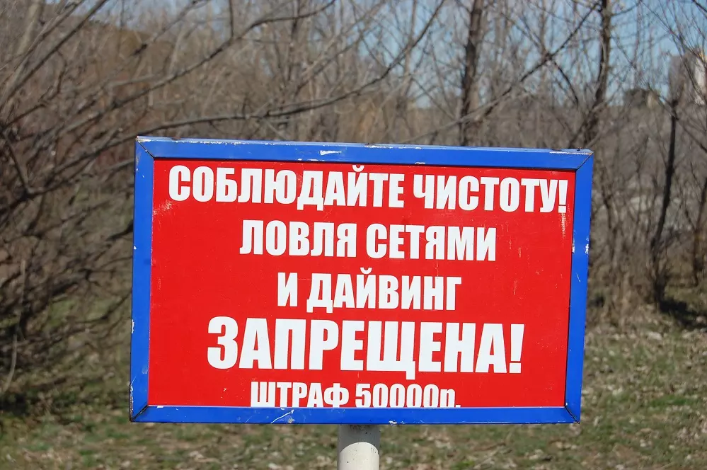 В свою очередь, прибывшие на «стрелку» подводные охотники утверждают, что они тоже неоднократно, начиная с 2013 года, организовывали сбор и вывоз мусора, причем не только с прибрежной территории, но и со дна озера. Мало того – тоже запускали в него 2 тонны рыбы. Так что неожиданно появившиеся на берегу бетонные столбики с табличками, угрожающими штрафом в 50 000 рублей за ловлю сетями, подводную охоту и почему-то даже дайвинг(?), вызвали у прибывшей на отдых группы кавминводских подвохов шок с последовавшим бурным протестом. На табличках надписи (дословно): «Соблюдайте чистоту! Ловля сетями и дайвинг запрещена! Штраф 50000 р.». Или: «Подводная охота и ловля рыбы сетями ЗАПРЕЩЕНА! Штраф 50000р. Администрация».