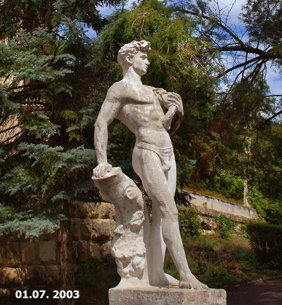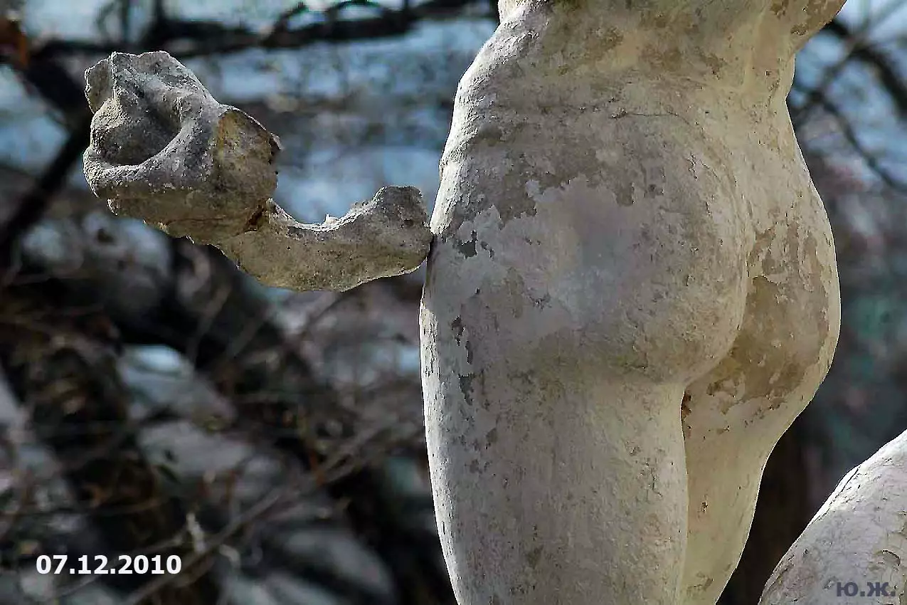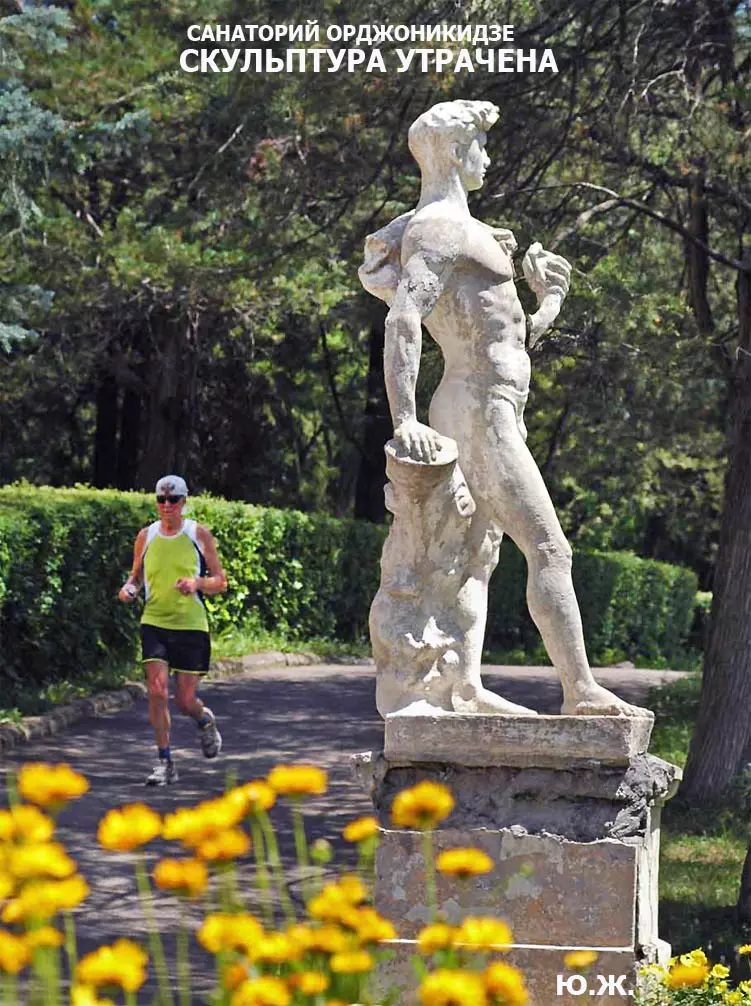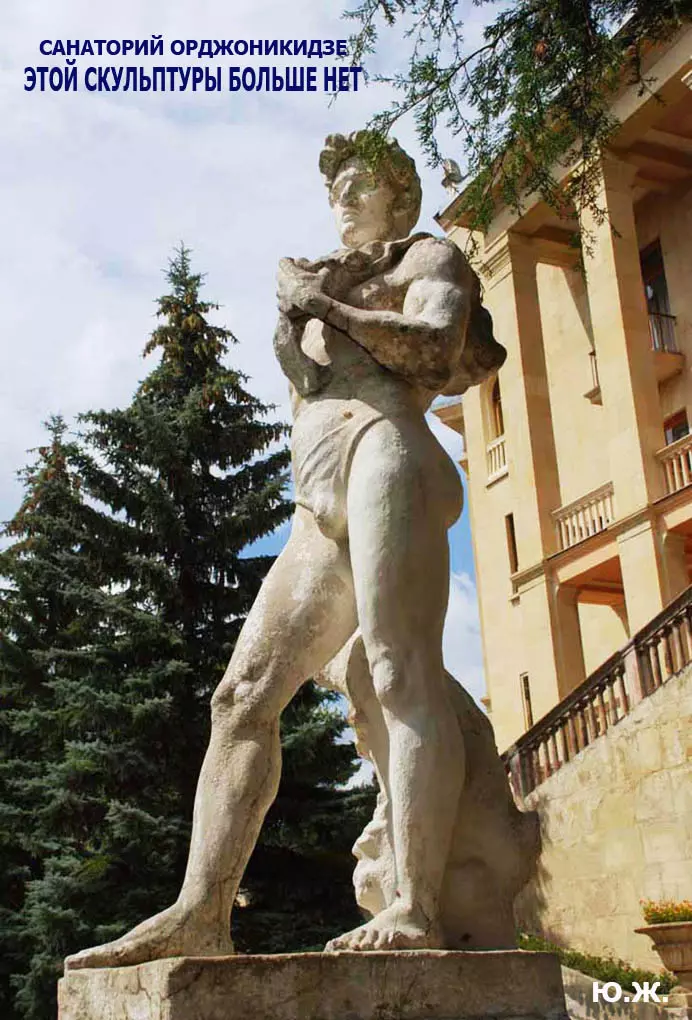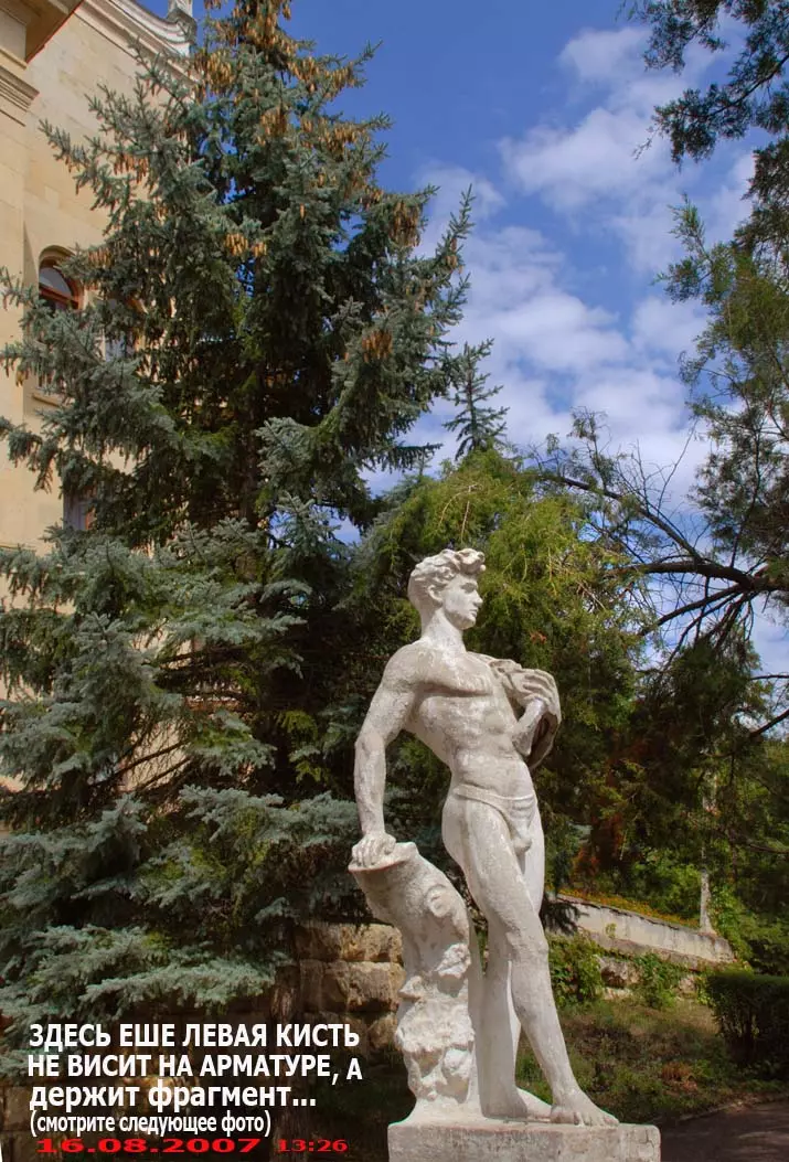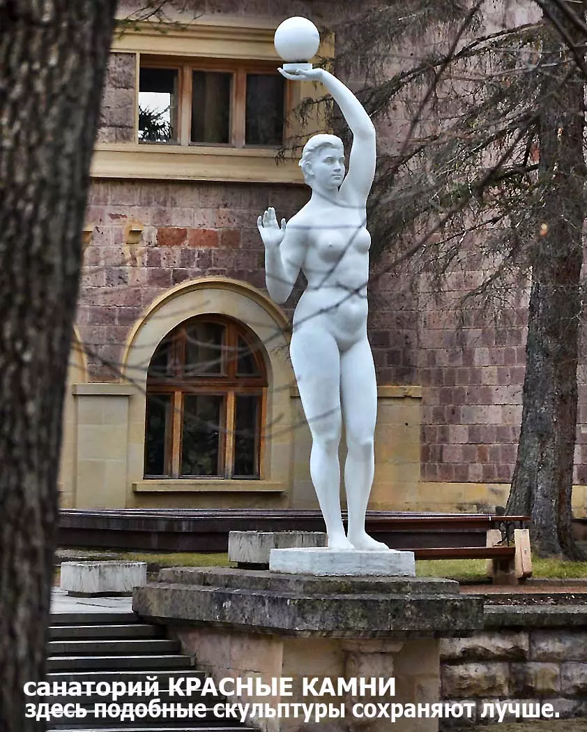 Скульптуры погибали долго. В 90-е и в начале нулевых , когда санатории были почти пустые, никому до них не было дела, думаю санатории не имели даже краски их подкрасить – были заботы поважнее. Изредка заходил к ним для фотосессий, видел оголившуюся арматуру, висящую на ней кисть руки. Это зрелище отдыхающий из нашего города-побратима Экс-ле-Бена месье Ги назвал «концом Римской империи». На следующий год у статуи уже висела нога, дальше — больше. Скульптуры становились просто позором. Еще через год их уже не было… Кстати, подобная скульптура, стоящая у санатория «Красные камни», абсолютно в порядке, она есть на снимке.