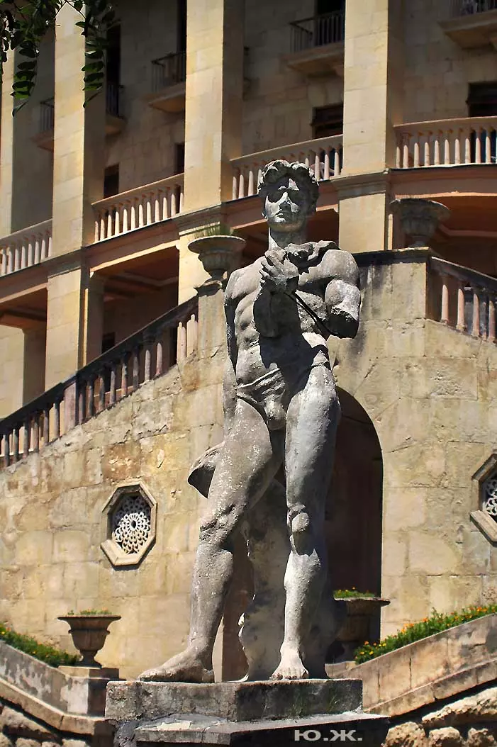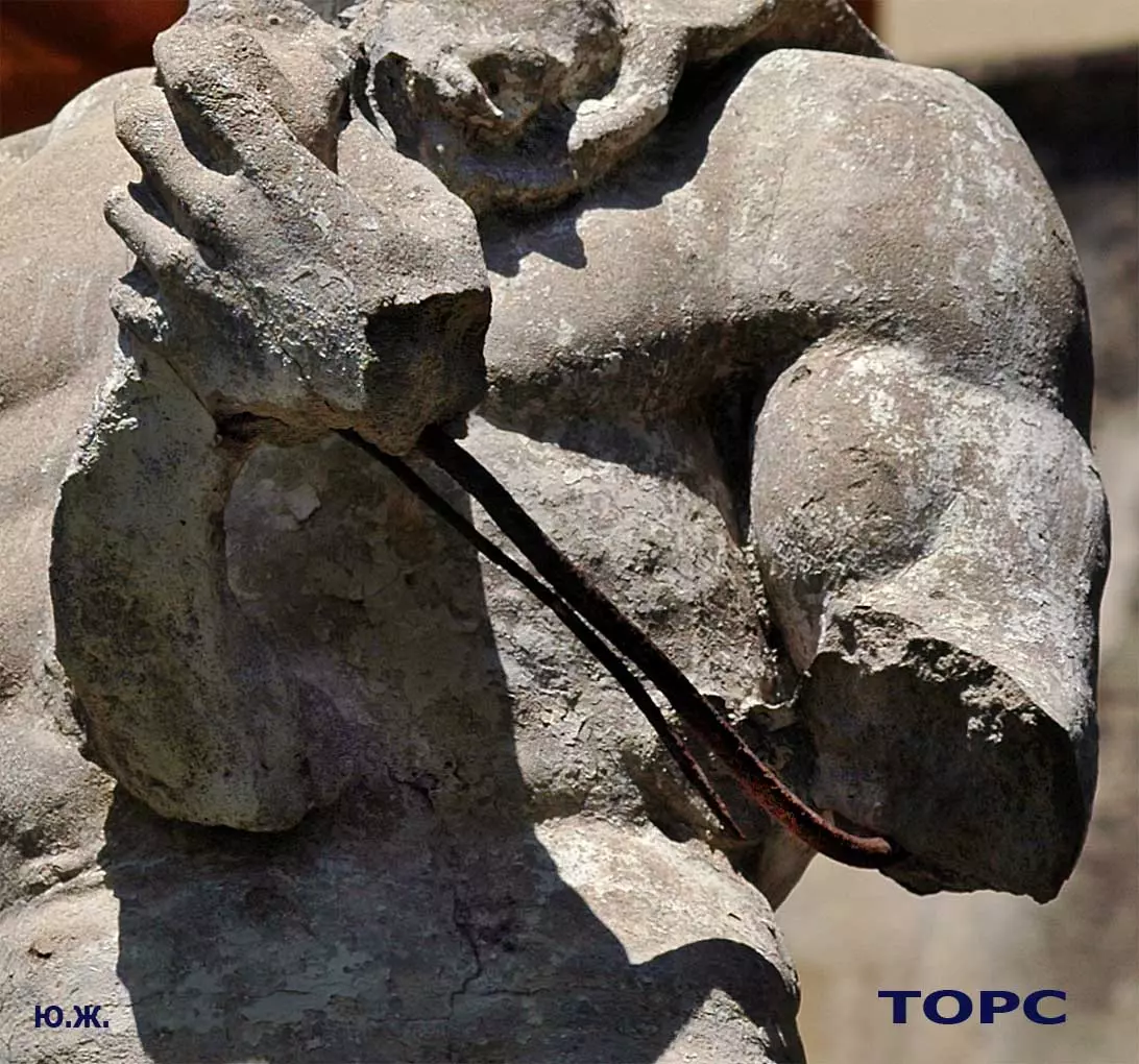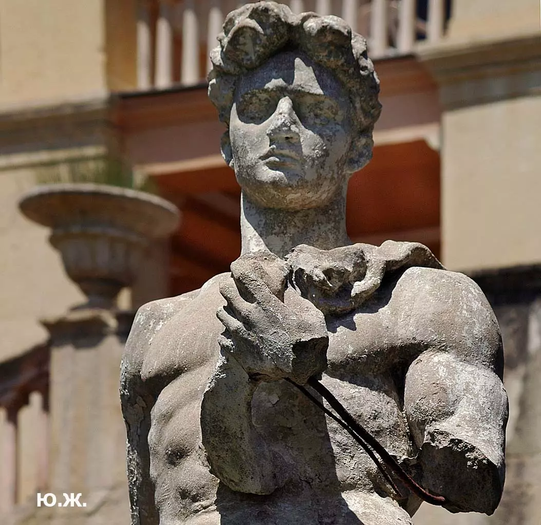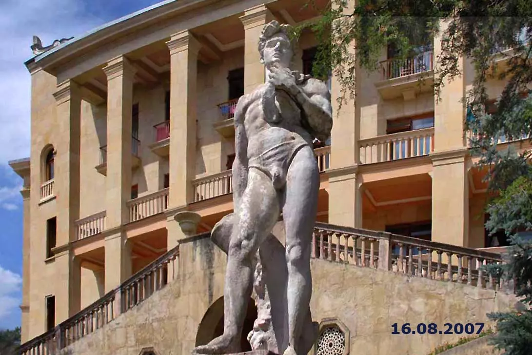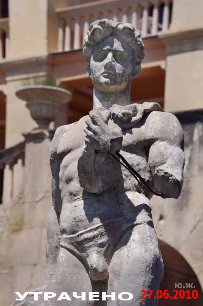 Скульптуры погибали долго. В 90-е и в начале нулевых , когда санатории были почти пустые, никому до них не было дела, думаю санатории не имели даже краски их подкрасить – были заботы поважнее. Изредка заходил к ним для фотосессий, видел оголившуюся арматуру, висящую на ней кисть руки. Это зрелище отдыхающий из нашего города-побратима Экс-ле-Бена месье Ги назвал «концом Римской империи». На следующий год у статуи уже висела нога, дальше — больше. Скульптуры становились просто позором. Еще через год их уже не было… Кстати, подобная скульптура, стоящая у санатория «Красные камни», абсолютно в порядке, она есть на снимке.