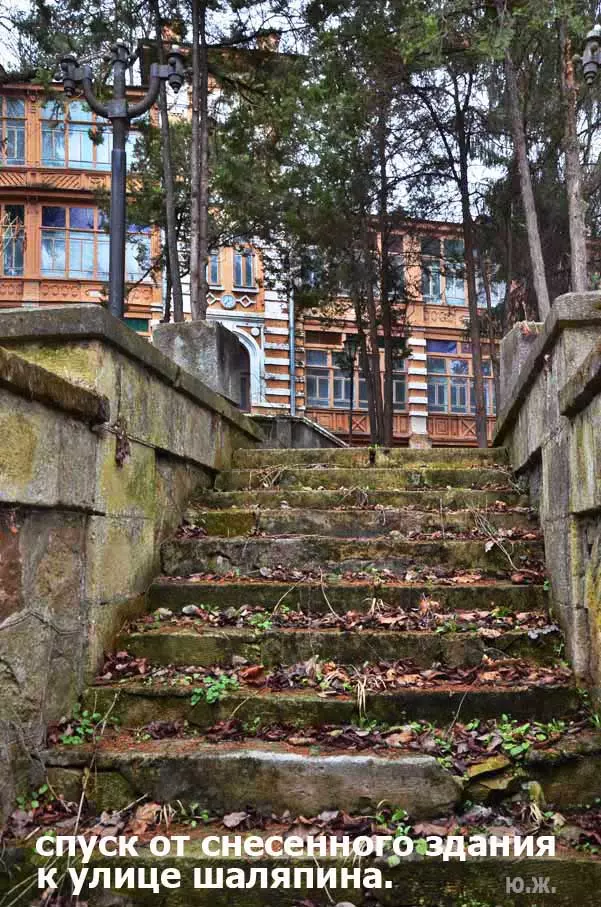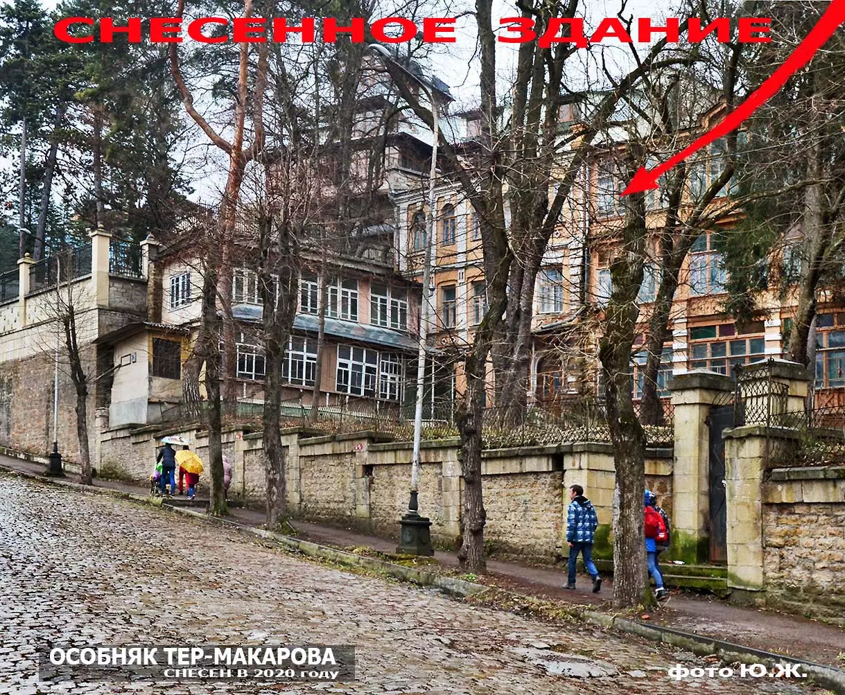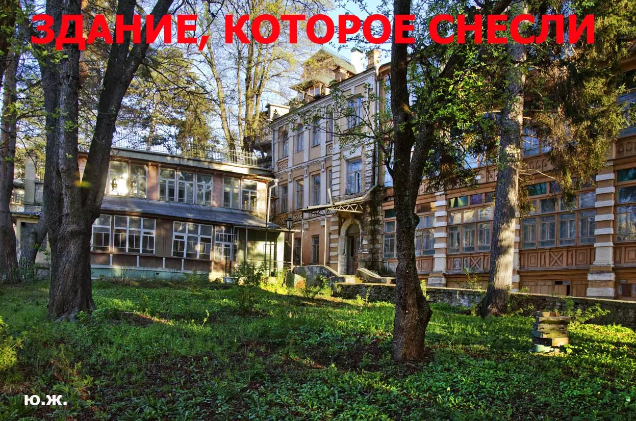 2. Это фотографии красивого дореволюционного здания, известной как дача Тер – Макарова. Здание в курортной зоне, напротив дачи «Кундури» (корпуса Военного санатория), хорошо сохранилось, имело большую территорию. Вниз от него вела живописная лестница к улице Шаляпина. В начале 2020 года ее тихо снесли.