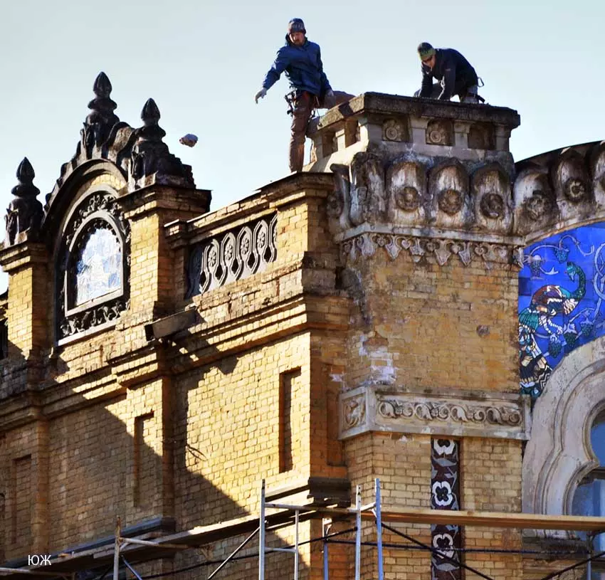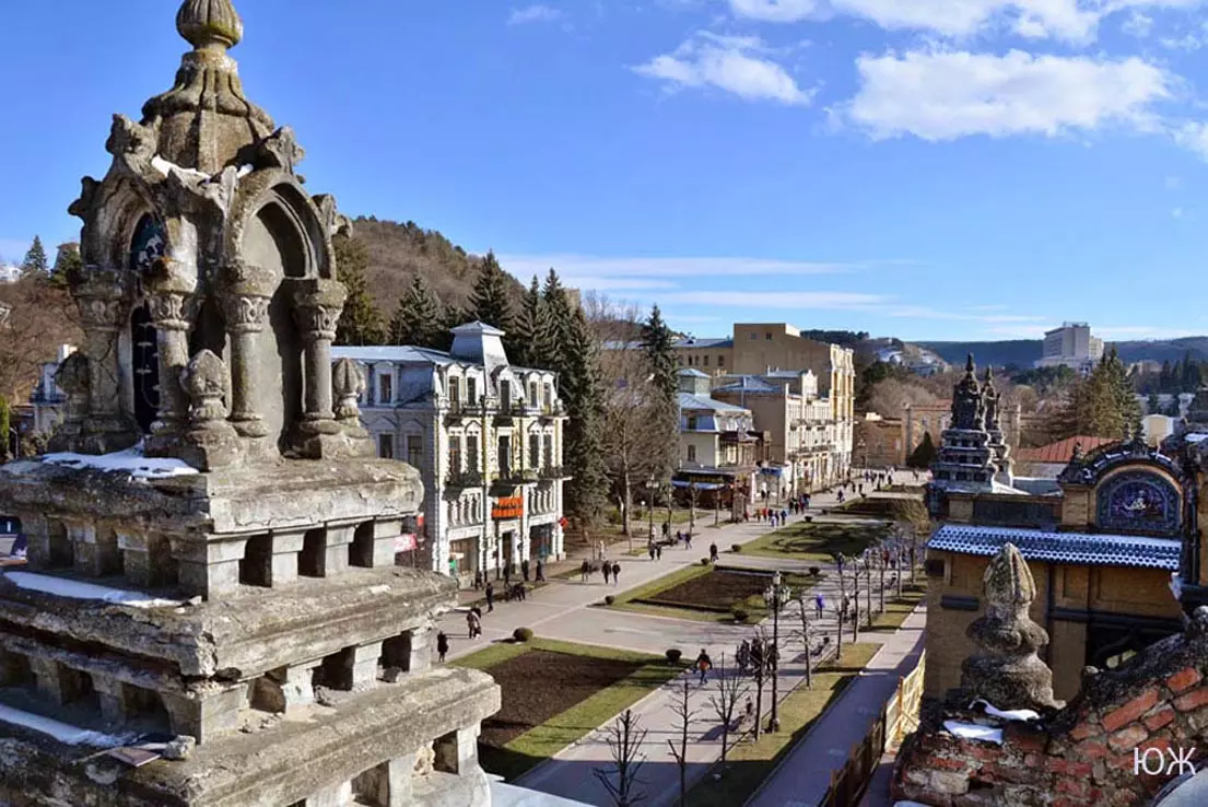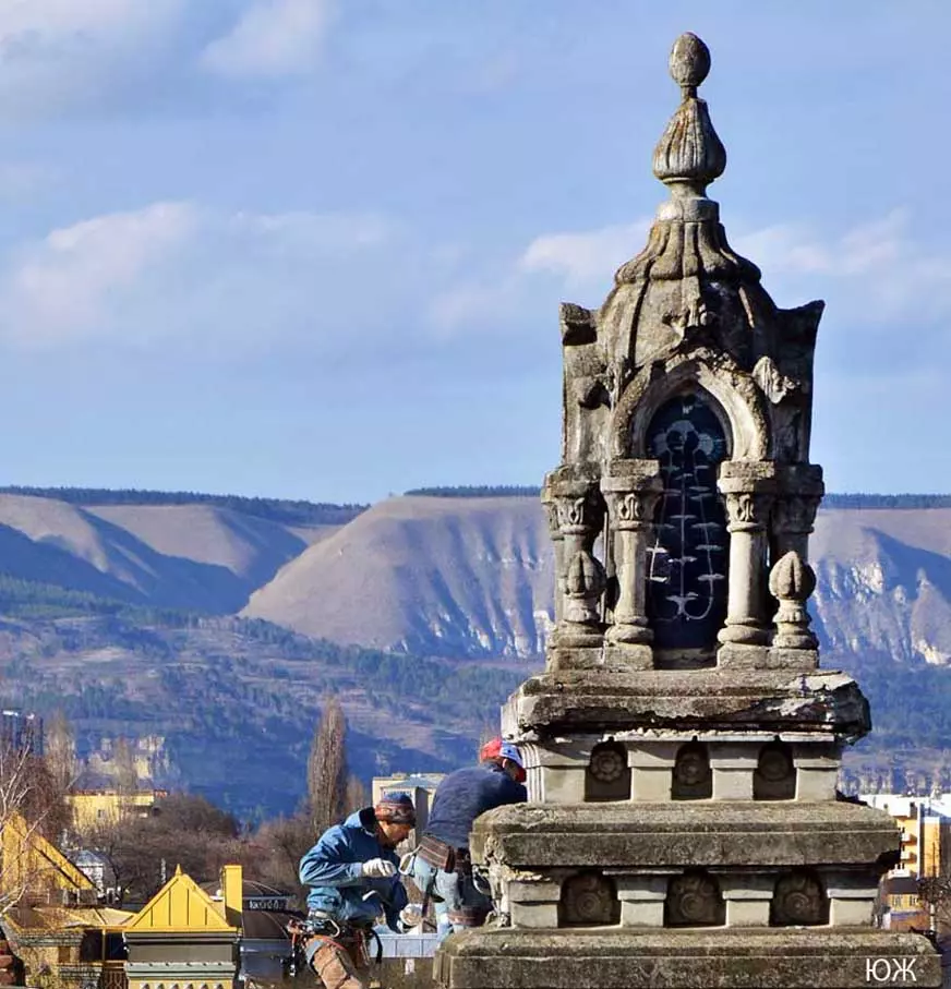 3. Главные Нарзанные Ванны. Одно из красивейших зданий Кисловодска и Кавказских Минеральных Вод. Шедевр архитектора Клепинина, который был в 2016 году капитально отреставрирован и стал предметом восхищения и популярнейшим объектом для фотосъемок. И все же… Осталась ложка дегтя. Самые большие четыре башни, по две с северной и южной стороны были снесены. Их заменили на угле- пластиковые копии. Это современный материал, очень прочный, легкий и дорогой, из него делают корпуса гоночных болидов, самолетов, яхт и т. д. Летним вечером к зданию скромно подъехал грузовичок, в котором стояли похожие на матрешки четыре пластиковые копии башен. Их вскоре и поставили. Сейчас понятно, что оригинальные башни можно было отреставрировать. Но — тогда говорили, что это будет и долго, и дорого. Но ведь основные башни здания Главных Нарзанных Ванн этого стоят! Прошло уже шесть лет. Как говорится поезд давно ушел. Однако остается соблазн и возможность заменять очень сложные фрагменты из камня на пластиковые «вставные челюсти», отпечатанные на принтере 3D, и в других старинных зданиях. Но ведь речь идет о старинной архитектуре, а не о замене коленного сустава! И представим только, какими могут стать наши города, если идти этим путем. Недавно в Кисловодске прошли съемки фильма «Чебурашка». На Курортном бульваре напротив фонтана «Лягушки» в качестве реквизита мастерами и художниками съемочной группы была построена «Кофейня» — так называемый дом «Чебурашки». Даже с небольшого расстояния он выглядел солидно, а когда художники «состарили» его, то все и вблизи смотрелось очень реально. Он и после съемок стоял на проспекте практически открытым еще месяц. Я снимал этот объект и снаружи, и интерьеры, видел и знал, что это сделано из картона, пенопласта, который можно проткнуть пальцем, немного дерева и стекла, превращенных в витражи. Но все-таки это реквизит, бутафория, это служит короткий срок, и так снимают кино во всем мире. А ведь тогда было не кино . Четыре огромные четырехметровые каменные башни были утеряны навсегда. Прямо на крыше при большом стечении людей их раскрошили перфораторами на куски при немой реакции очевидцев. А ведь красивейшее здание Главных нарзанных ванн, гордость Кисловодска — это «симфония в камне», а не в пластике… С такими шедеврами старинной архитектуры нужно быть очень бережными…