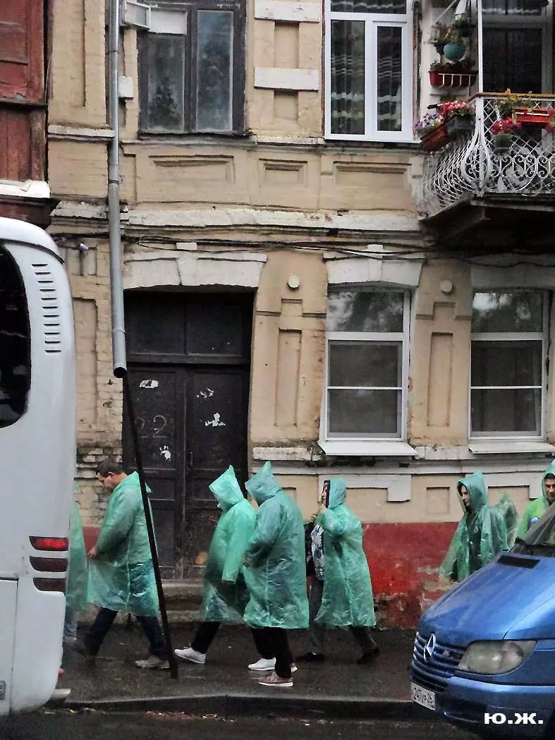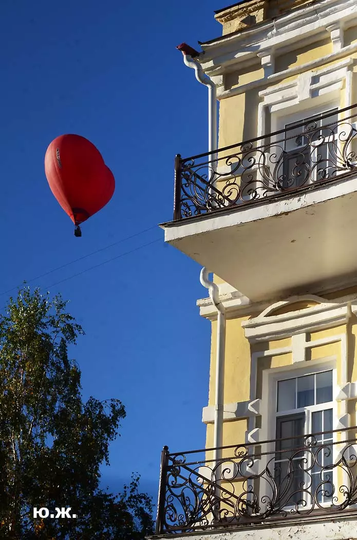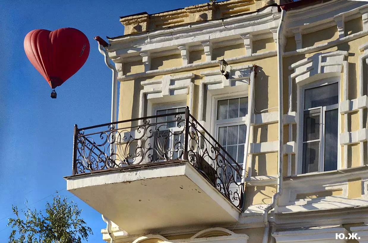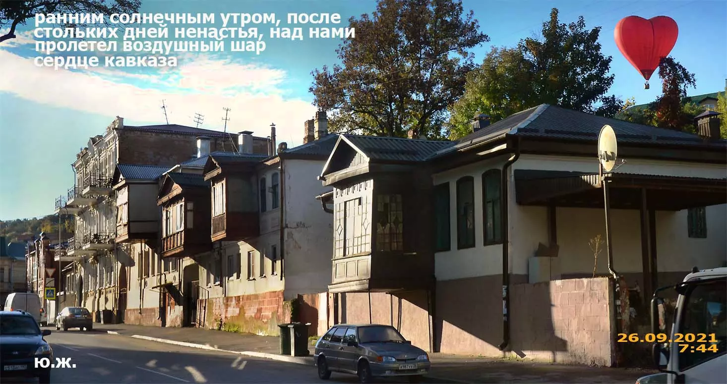 Вся фотосессия проходила то в дождь, то в пасмурную погоду, Но в этом и ее шарм, иначе картинки получились бы пресноваты. Было только одно раннее, прекрасное, солнечное утро, когда над нами, над улицей Кольцова пролетел воздушный шар «Сердце Кавказа»и внес в съемку контраст.