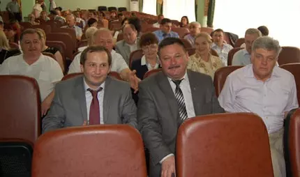 - В первом ряду слева направо: Замглавы Максим Клетин, подавший заявление об уходе сразу после конференции,; глава города Сергей Финенко, помощник главы Сергей Галий.