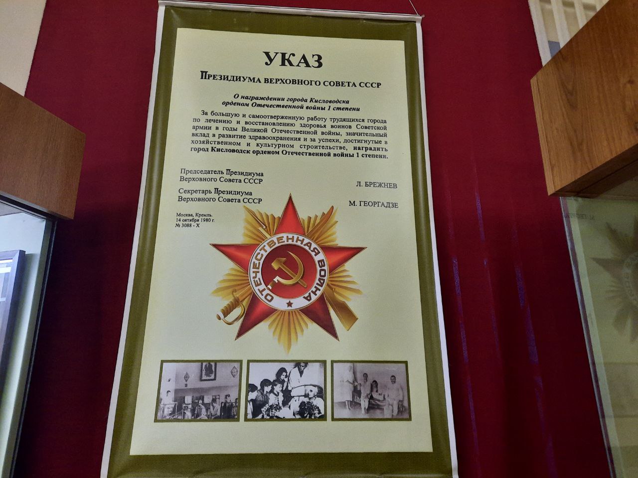 9 августа 1941 года в Кисловодск пришел первый санитарный поезд с ранеными. Город стал самой крупной госпитальной базой Советского Союза. За годы Великой Отечественной войны госпиталя города приняли около 600 тысяч раненных солдат и офицеров Красной Армии (ранбольных).
