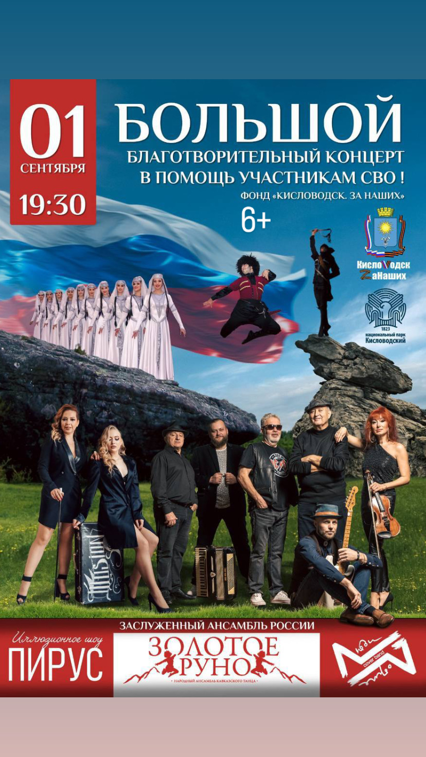 Продолжительность концерта: 1,5 часа. Все средства, собранные в ходе благотворительного концерта, будут направлены на нужды участников СВО. Перечисление средств будет осуществлено через Благотворительный фонд «КислоVодск. Zа Наших». Ждём всех неравнодушных, чтобы всем миром поддержать наших защитников! Место проведения: Эколого-просветительский центр НП «Кисловодский». Дата и время: 1 сентября 2025 года, начало в 19:30.