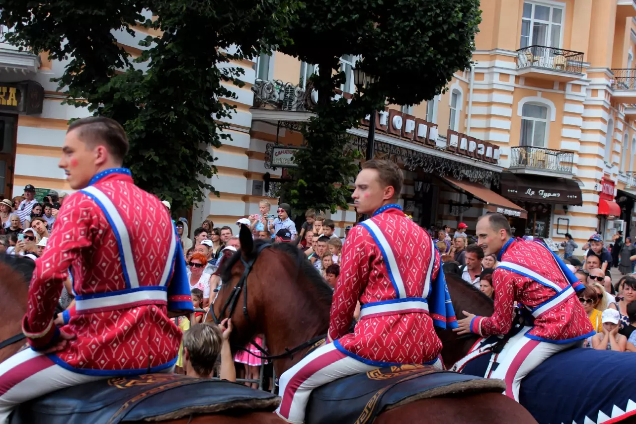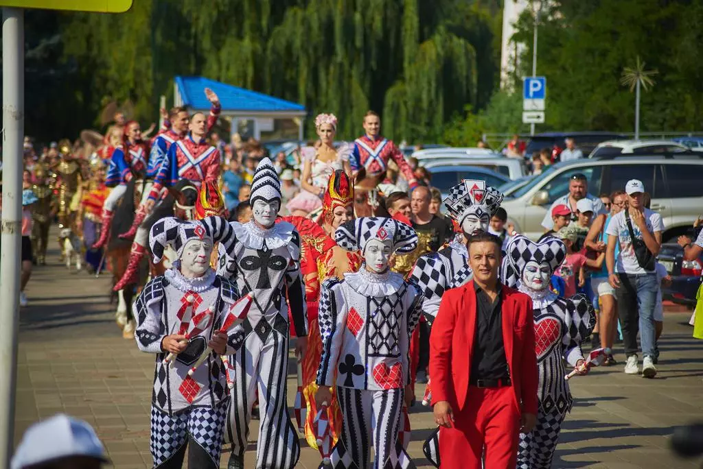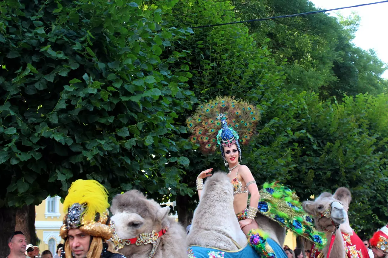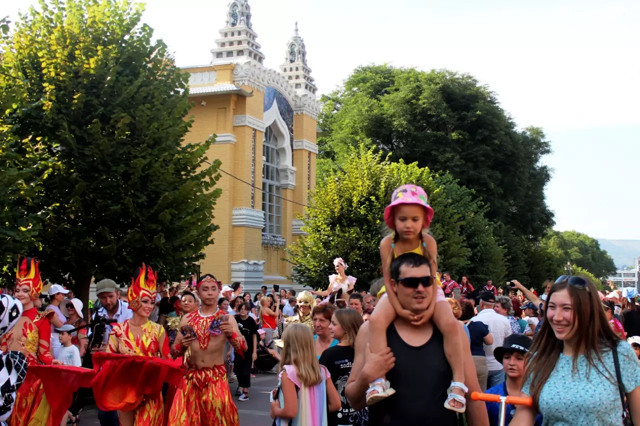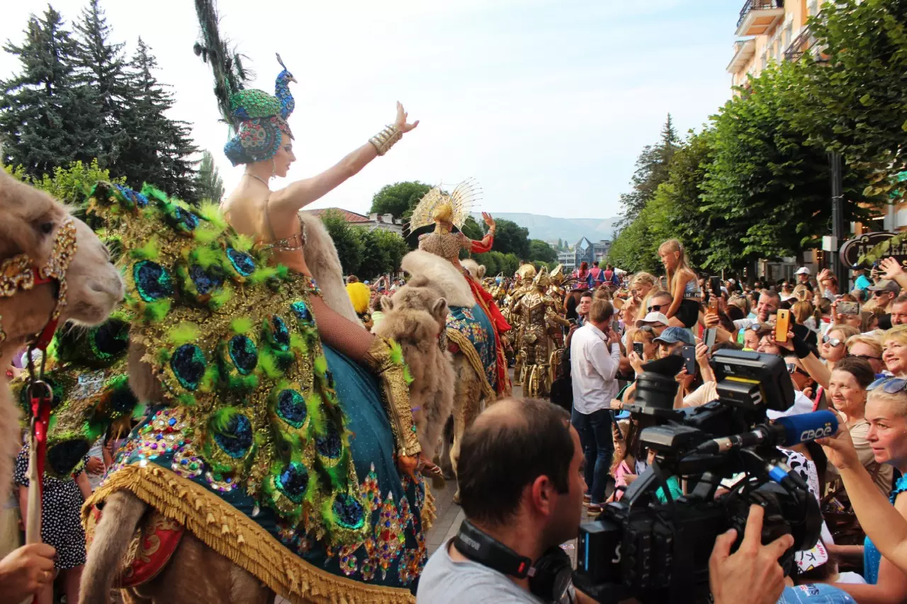 По тротуарам и бульвару прогарцевали жокеи на красавцах-конях, абсолютно в восточном духе под чарующие звуки музыки величественно проплыли корабли пустыни — целый караван верблюдов, позволяя собравшимся сколько угодно любоваться и снимать на память красавиц наездниц, рассылающих улыбки и воздушные поцелуи. В шествии прошли более 30 замечательных артистов Российской государственной цирковой компании из шоу Гии Эрадзе «Песчаная Сказка», гастроли которого проходят в Кисловодском цирке до конца лета. Акробаты и жонглеры, гимнасты и кордебалет, озорные самоедские лайки и далматинцы: — большой Восточный цирковой карнавал с их участием постепенно захватил зажигательными ритмами и блеском нарядов центр Кисловодска с его знаменитыми клумбами вплоть до исторического Пятачка — площадки перед Визит-Центром.