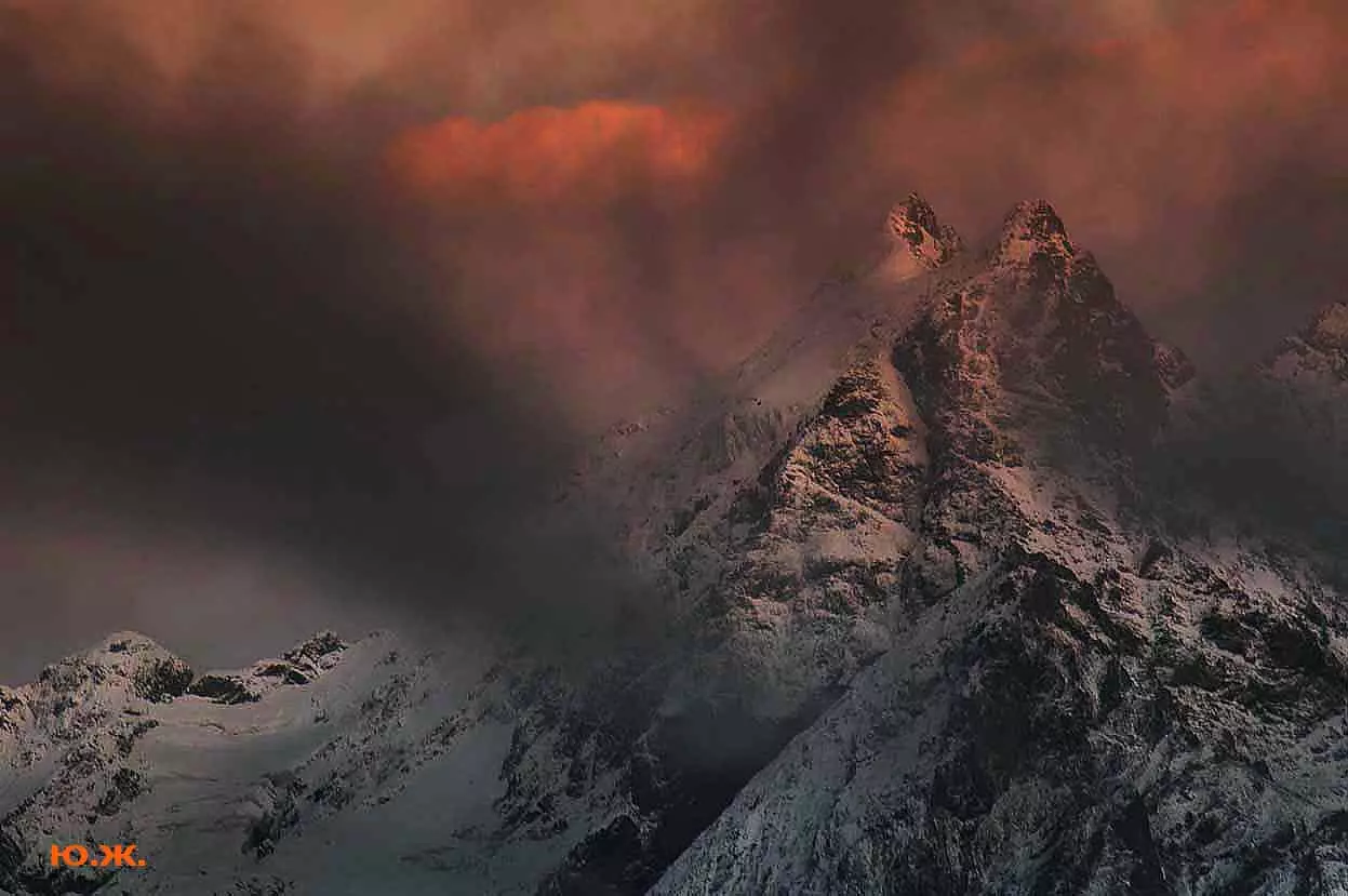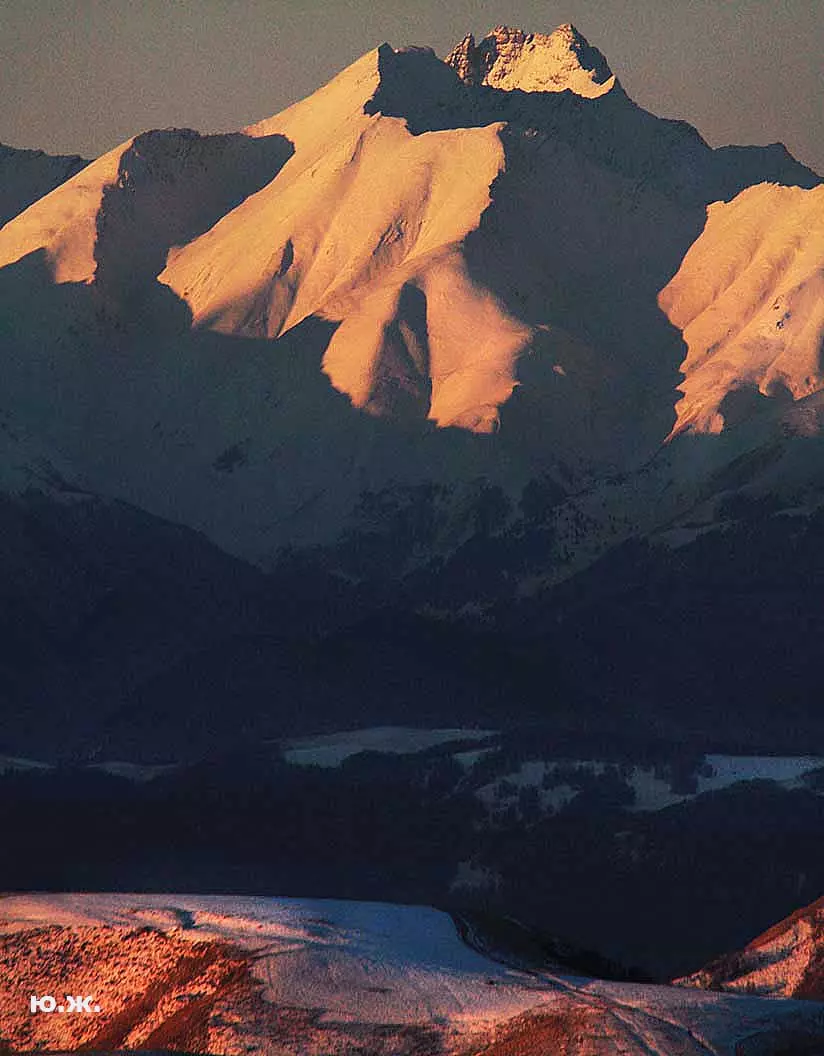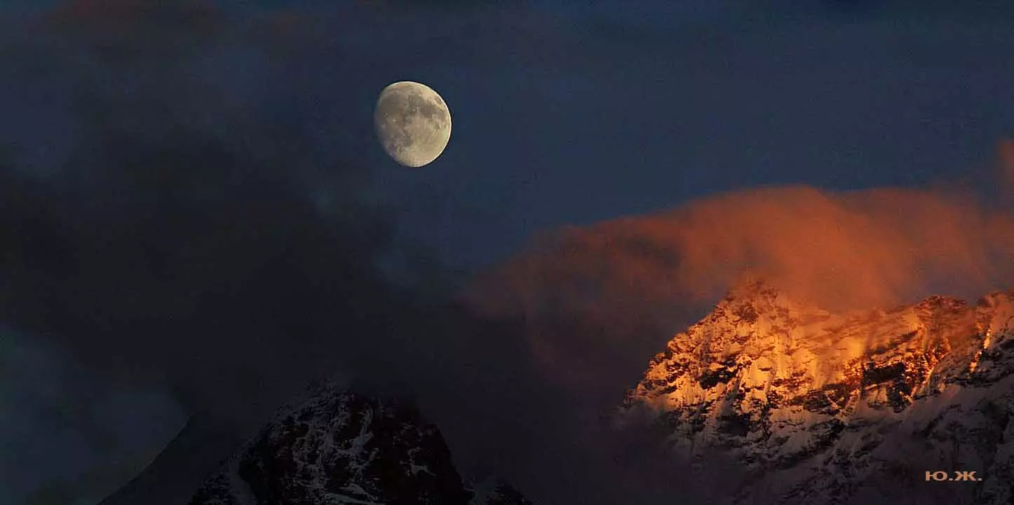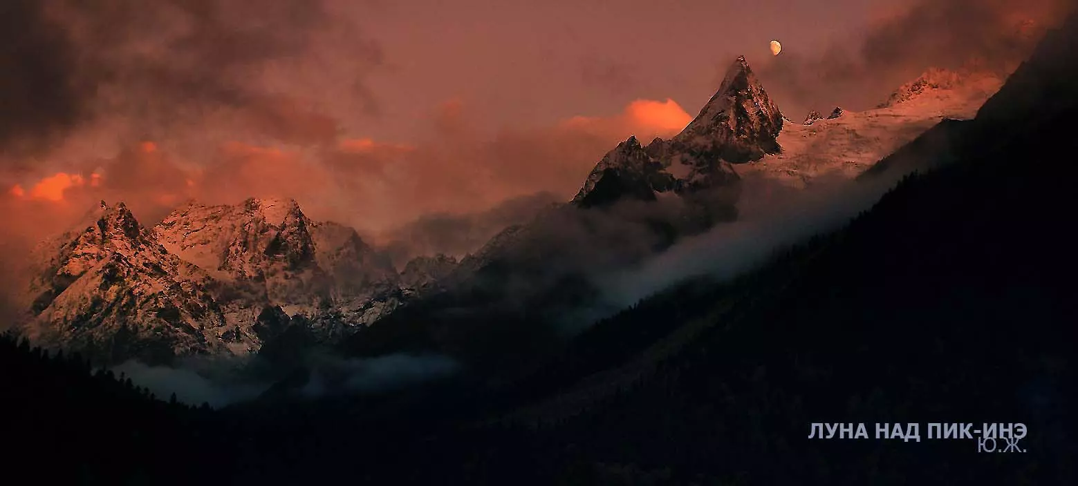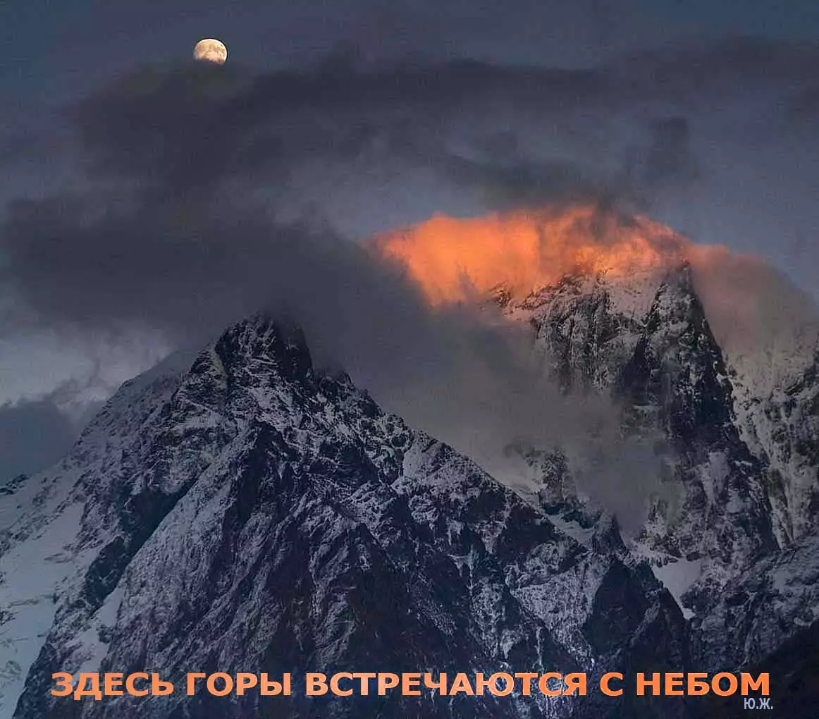 Тогда все сверкает ослепительной белизной. На сотни километров с горных вершин при абсолютном отсутствии атмосферной дымки можно увидеть и Черное, и Каспийское моря. А к закату короткого зимнего дня горы и облака начинают розоветь, алеть от вечернего низкого солнца, и уже долины с ущельями погружаются в синие сумерки, а небо и вершины еще продолжает гореть, освещенное медным солнцем… И вдруг, сквозь разрывы облаков появляется желтая луна, и ты нажимаешь на кнопку затвора камеры — и второй раз и третий и десятый… Это уже высший пилотаж…