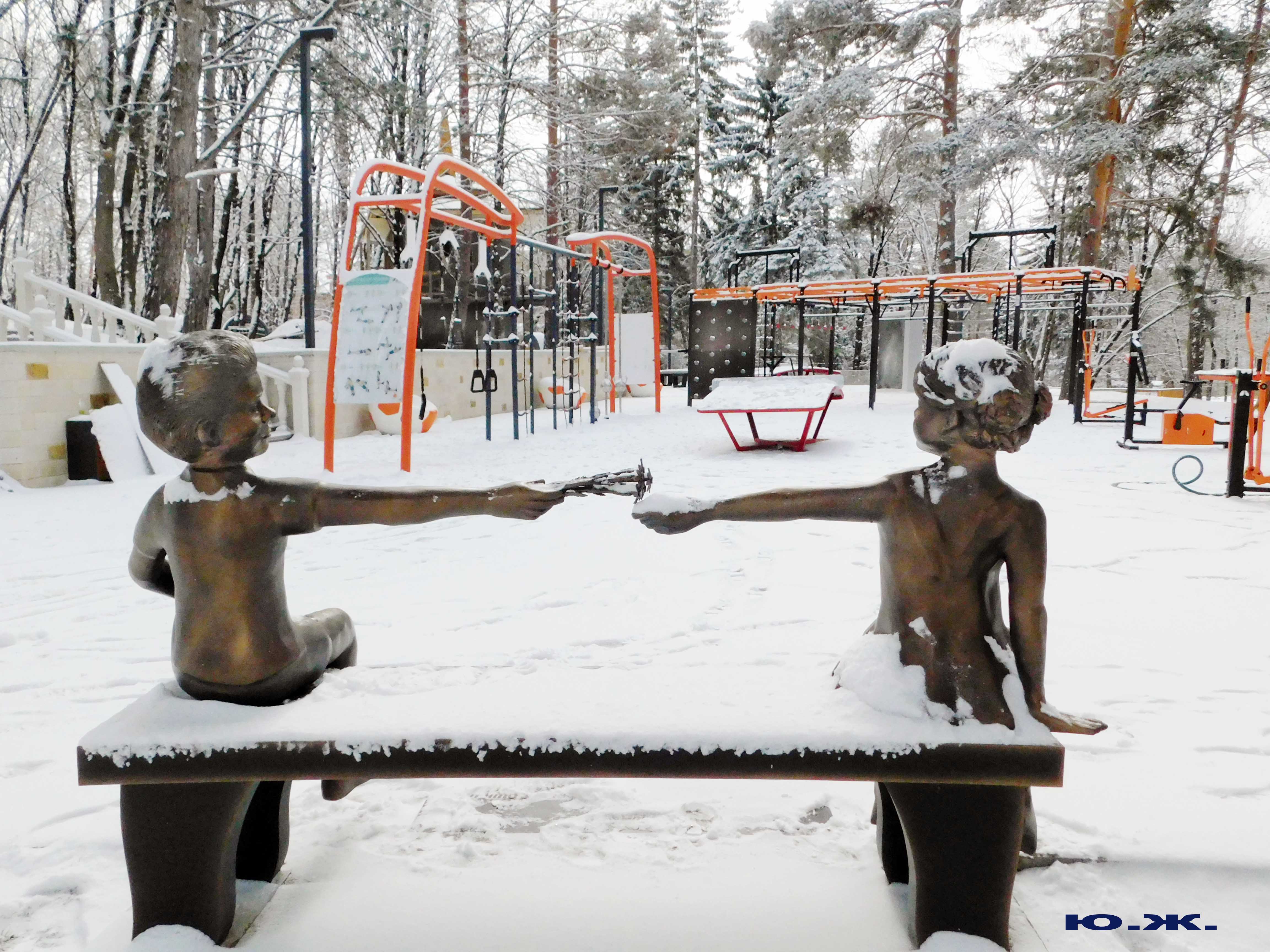 В Кисловодске такое встречается очень редко. Морозы в минус двадцать один градус случаются не каждый год. Суть этого снега в том, что он покрыл белоснежным покрывалом все пространство Парка, все входящие в него строения стали одним ансамблем: аттракционы, парковые скульптуры, высоченные хвойные деревья, с которых свисают очень красивые оригинальные елочные игрушки и которые уже дождались весны, здесь они с декабря месяца. (см. санатории: Москва, Долина Нарзана, Узбекистан…). А античные колонны со всех сторон входа и выхода в Парк? Взгляните, как смотрится сквозь них белый, как и наш снег, высотный дом на Цандера или совсем рядом стоящие освещенные заходящим солнцем, красивые оранжевые высотки, рядом с резными колоннами…