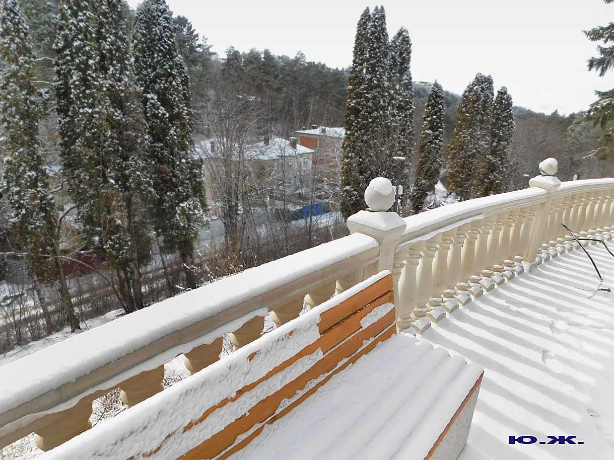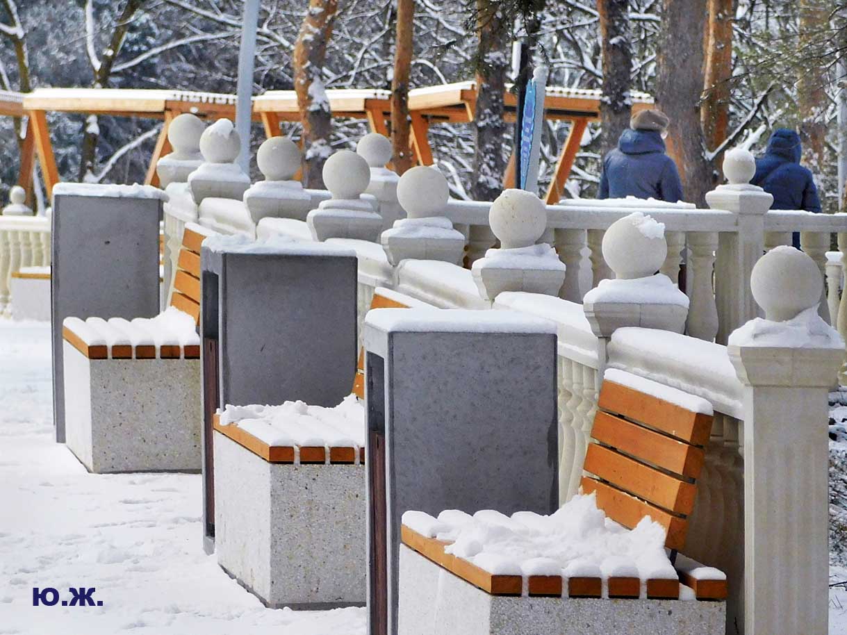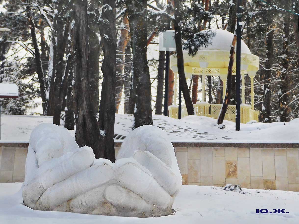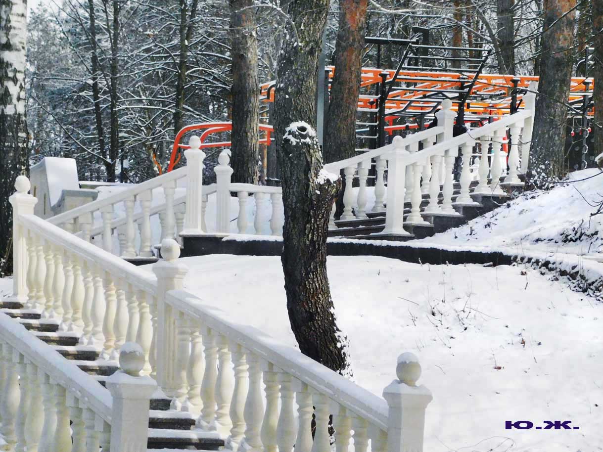 В Кисловодске такое встречается очень редко. Морозы в минус двадцать один градус случаются не каждый год. Суть этого снега в том, что он покрыл белоснежным покрывалом все пространство Парка, все входящие в него строения стали одним ансамблем: аттракционы, парковые скульптуры, высоченные хвойные деревья, с которых свисают очень красивые оригинальные елочные игрушки и которые уже дождались весны, здесь они с декабря месяца. (см. санатории: Москва, Долина Нарзана, Узбекистан…). А античные колонны со всех сторон входа и выхода в Парк? Взгляните, как смотрится сквозь них белый, как и наш снег, высотный дом на Цандера или совсем рядом стоящие освещенные заходящим солнцем, красивые оранжевые высотки, рядом с резными колоннами…